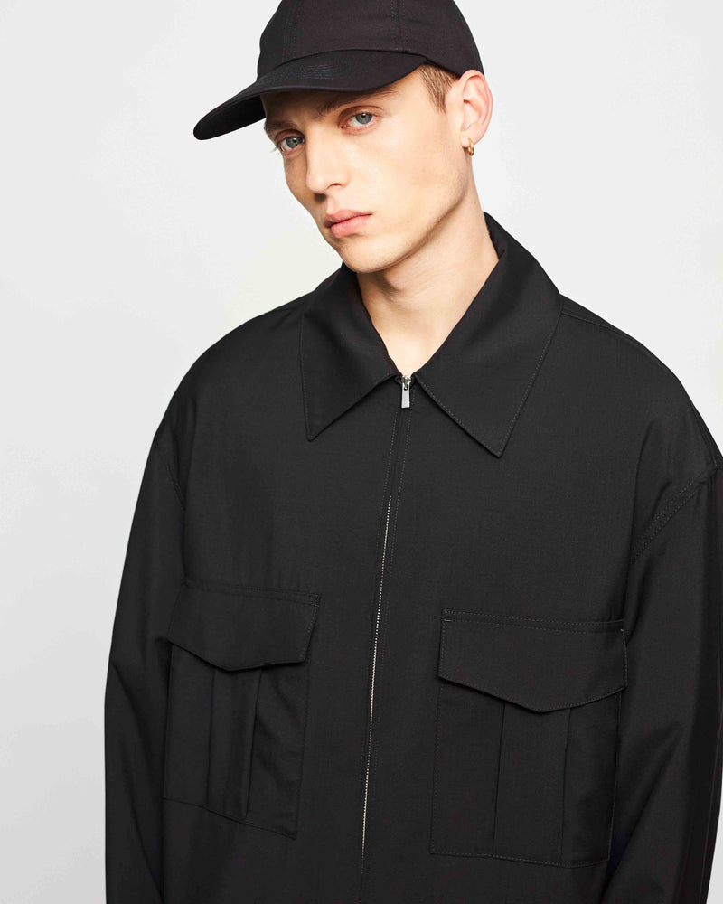 The second is a Long Utility Shirt made from traditional wool mohair in black. Maintaining the clean lines and boxy silhouette, the long sleeve shirt features a large chest pocket with flap. The flap pocket is mirrored in a smaller form on the upper sleeve, a nod to work wear a military details. The lower part of the short features two large rectangular pockets, layered on top of each other. Finished with a hem that goes from a soft curve to a clean straight line.