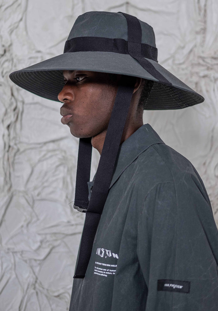 In INSTINCTS the signature wide brim JUNO Snail Hunter Hat returns in an acid jacquard and faded black wash. The LOEZ is a minimalist technical raincoat, with clean lines and side slits on each side with branded print on the chest, coming in both a faded black and acid jacquard whose effect is like that of marble.  It would not be a Tobias Birk Nielsen collection without a technical vest in the offering. The DAIICHI is a mix material vest with large upper chest pockets and two pouches on each panel, and featuring a magnetic clip closure. Reminiscent of the armour of a Trojan soldier or layers of survival wear of an astronaut.