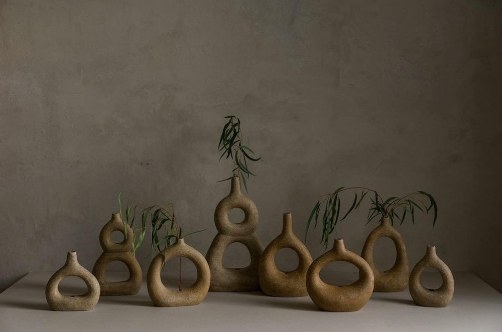 Her slow hand-building techniques working with stoneware and terracotta, create warm and soothing curves throughout the collections. Each piece is unique and can be filled with water and flowers, allowing the stems to pass through the middle of the Viv Lee ‘Holos’ collection vases.