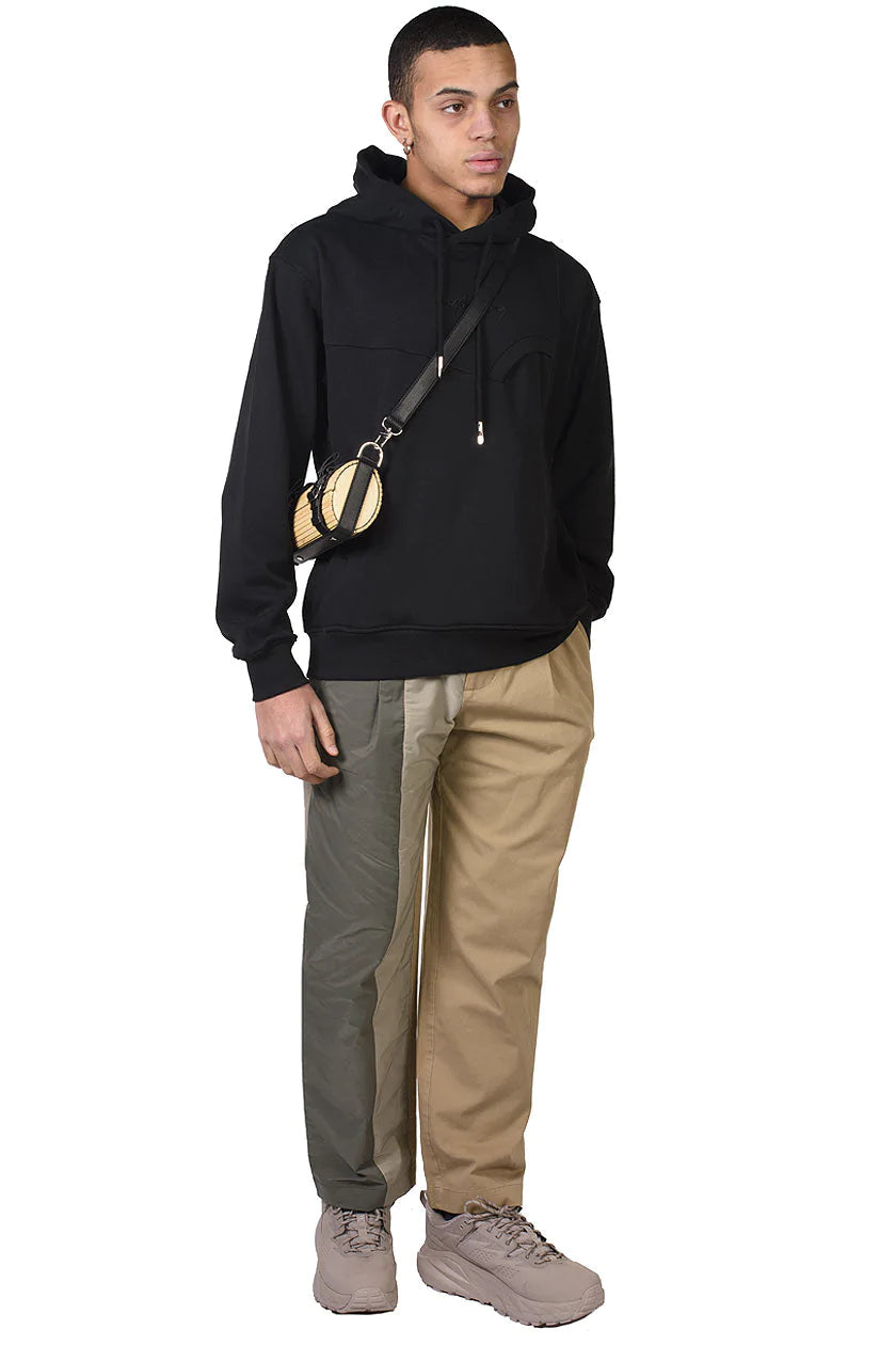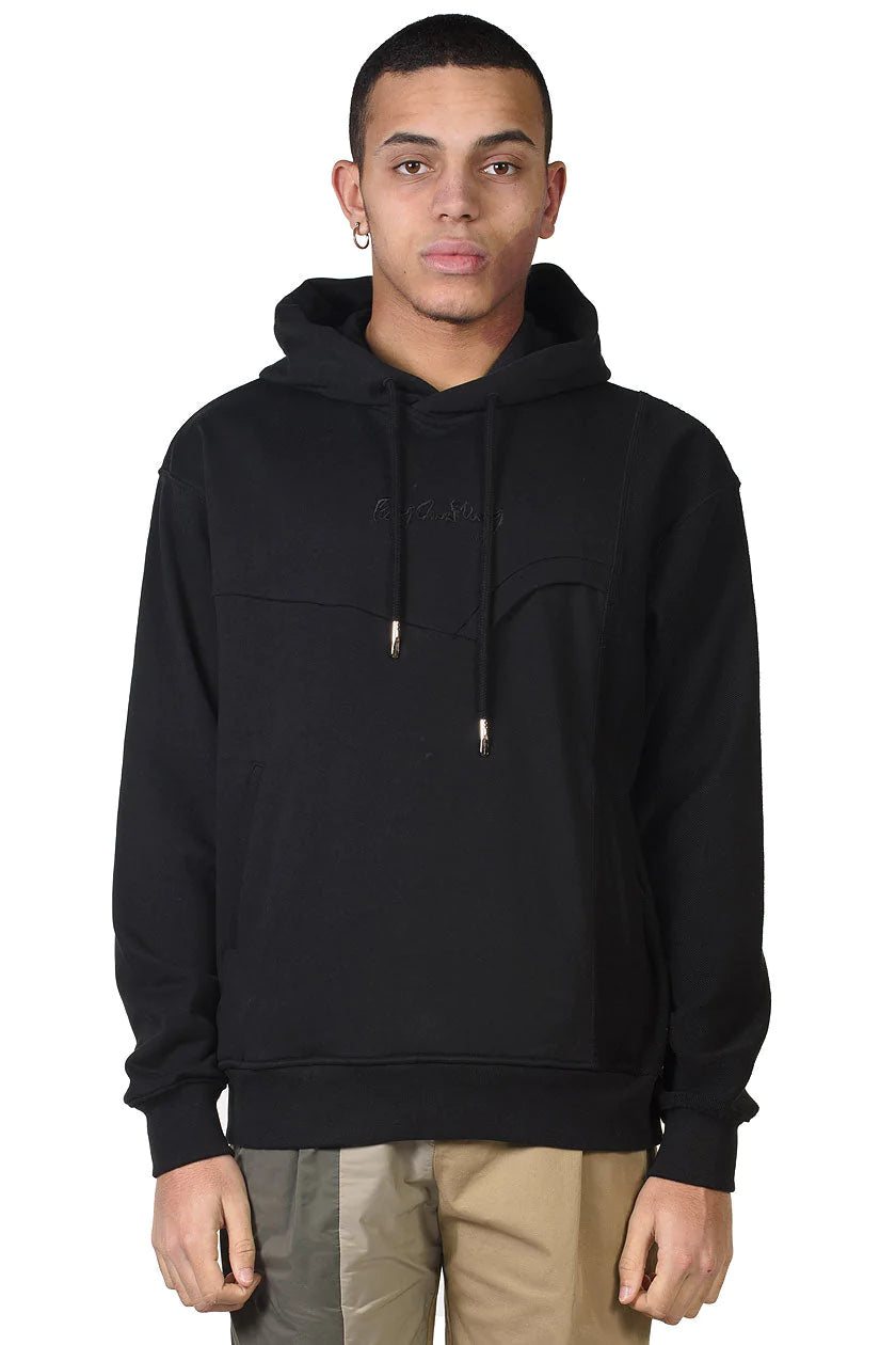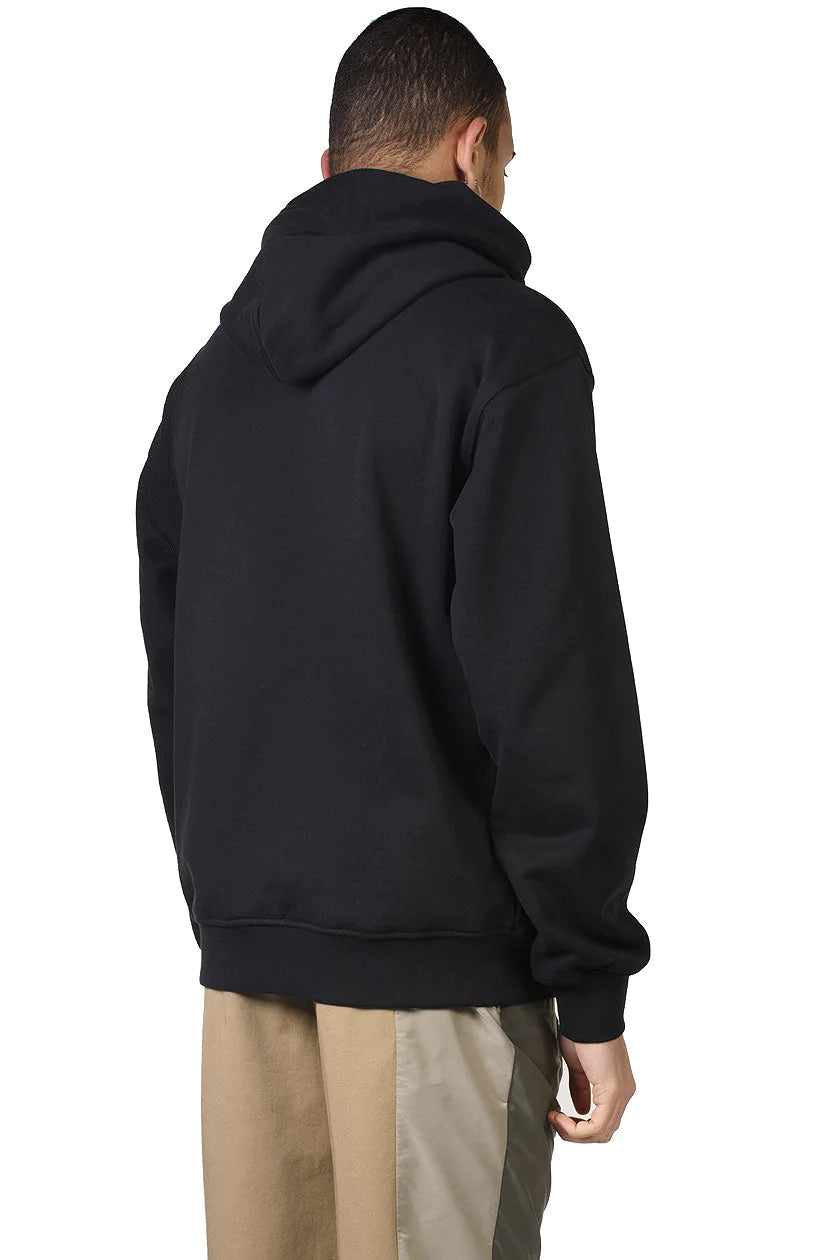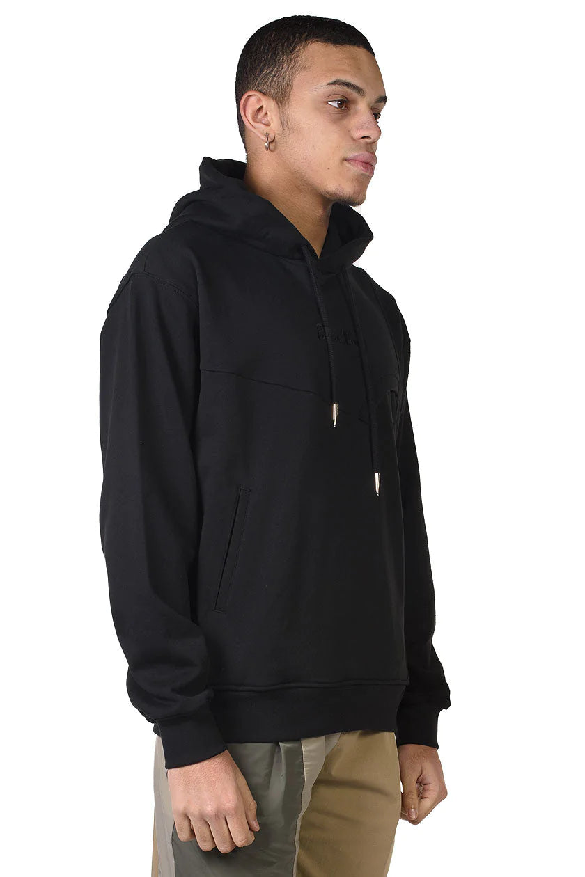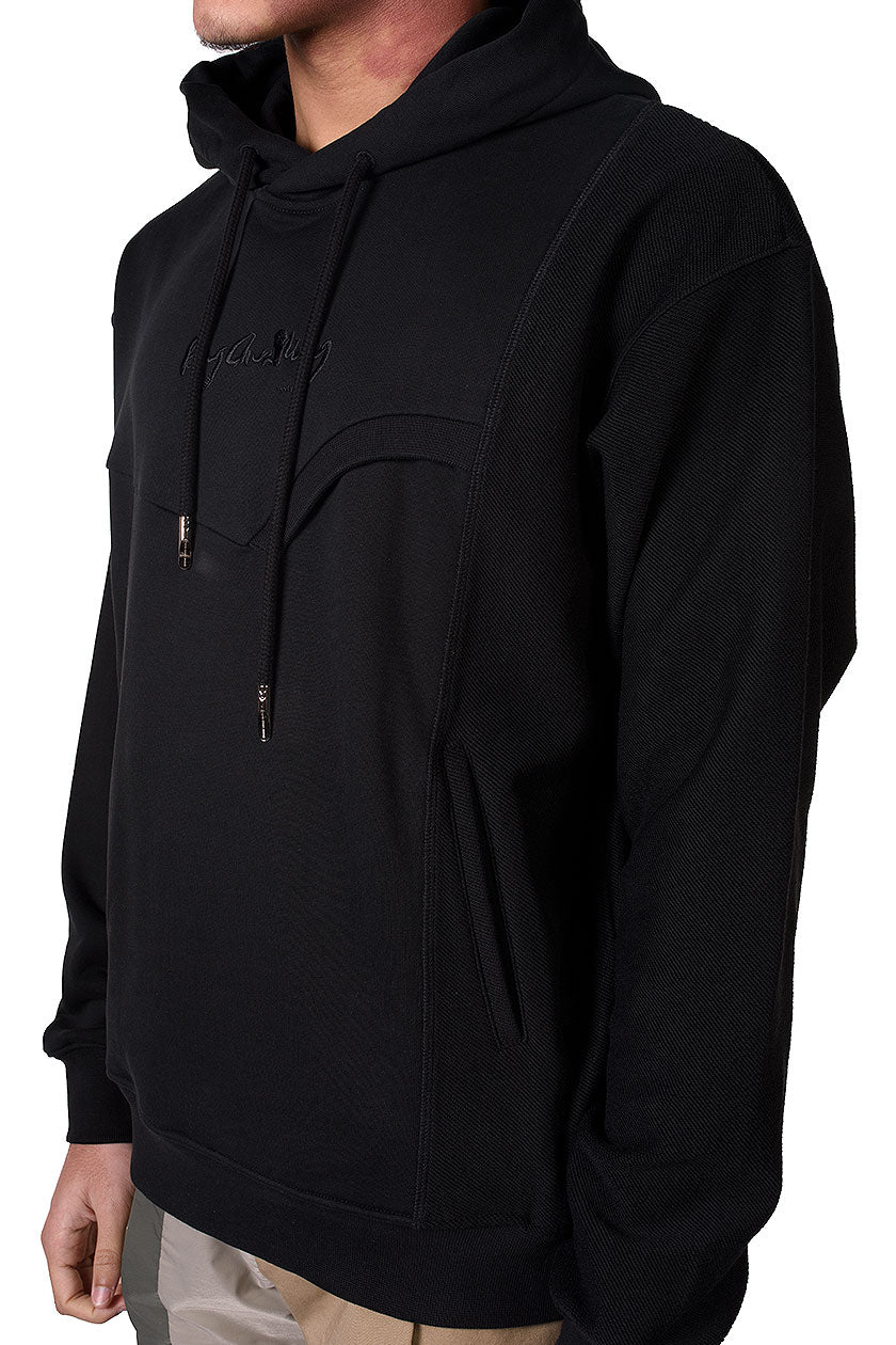 Long sleeve panelled French terry and reverse French terry hoodie in black. Layered construction. Drawstring at hood. Tonal embroidered logo at chest. Welt pockets at waist. Rib knit cuffs and hem.