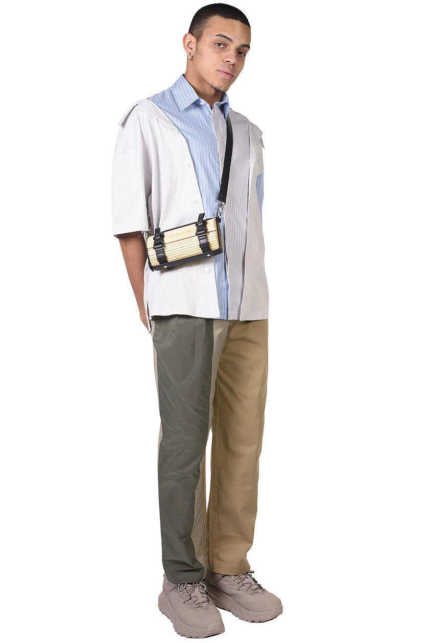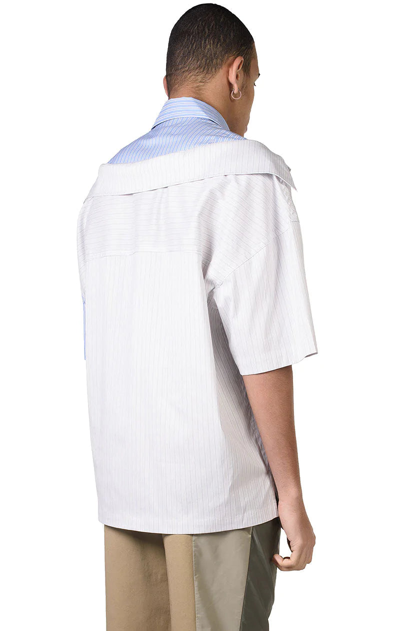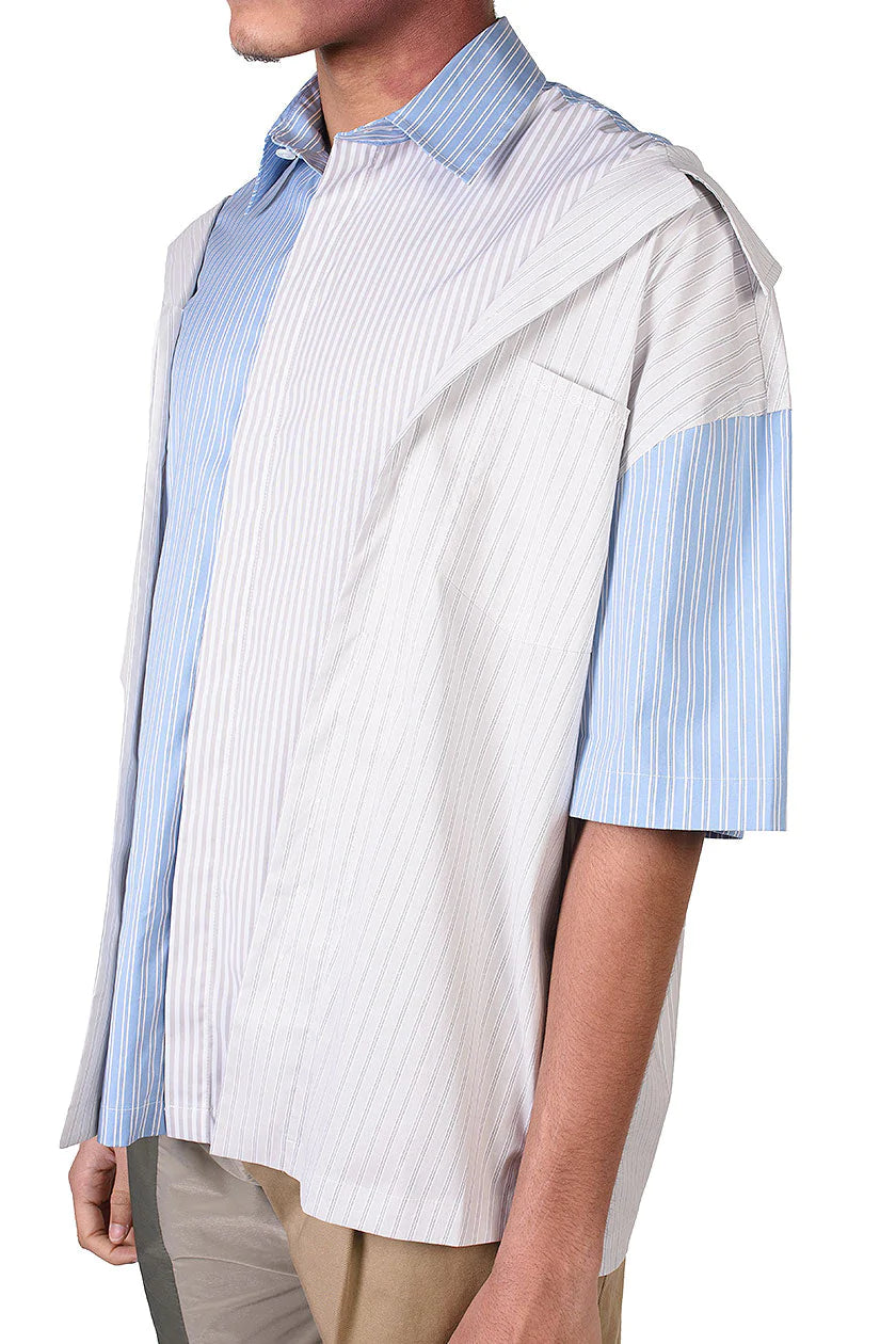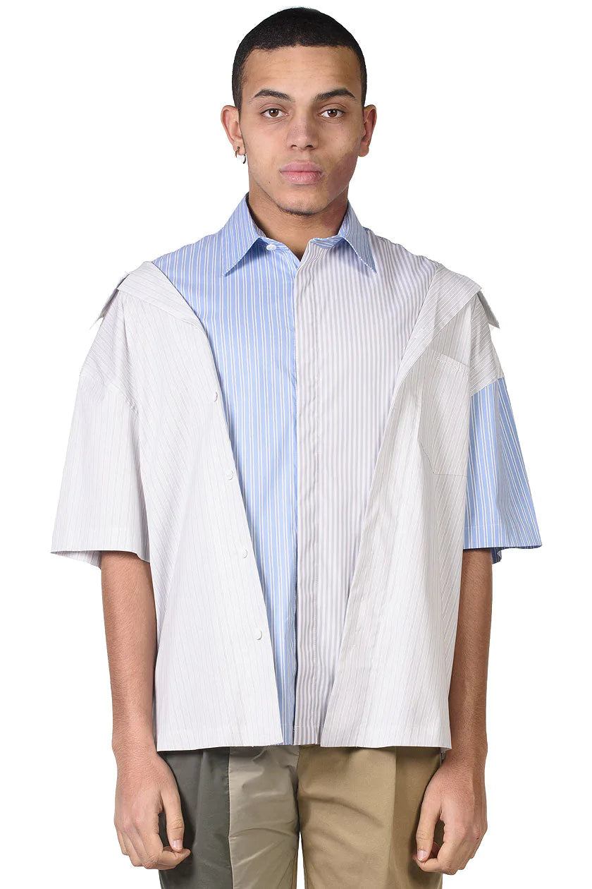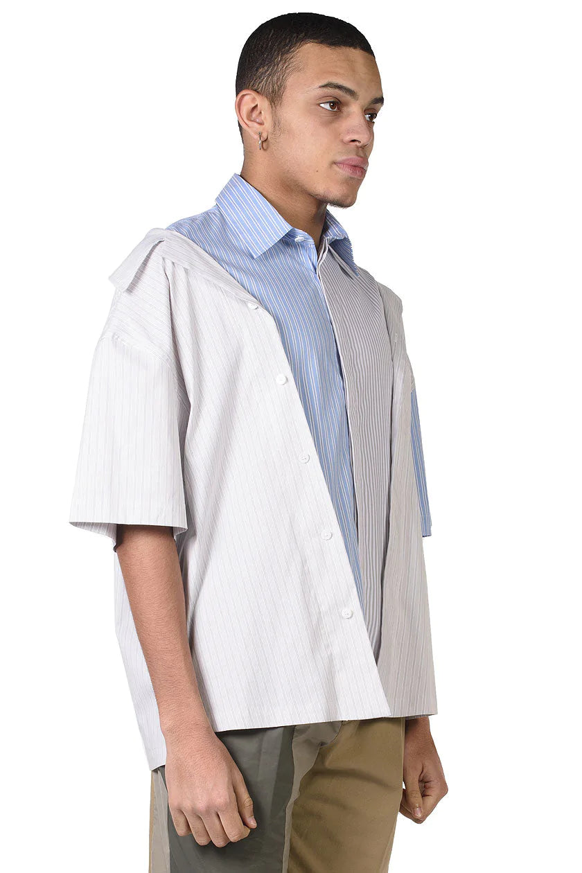 Cotton blend blue and grey stripe classic layered two in one shirt. Concealed placket. Exposed shell buttons to front. Embroidered logo to chest.