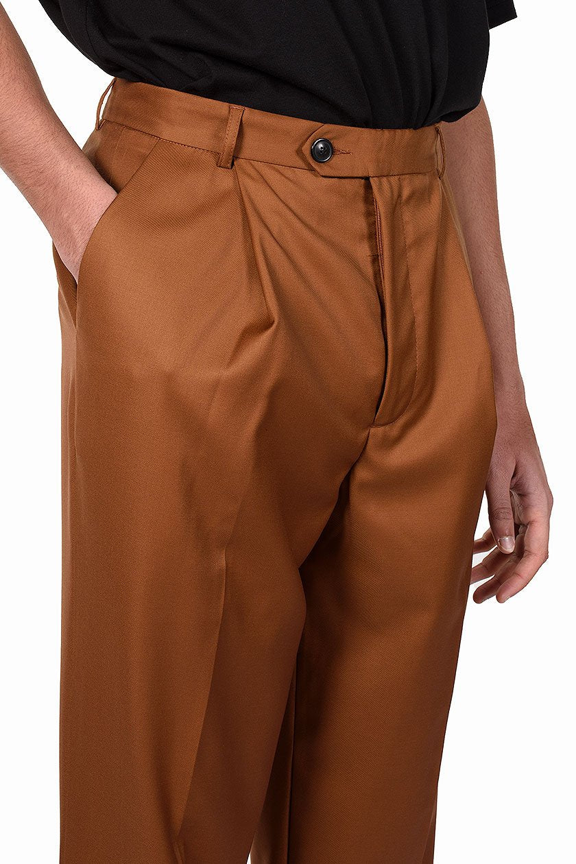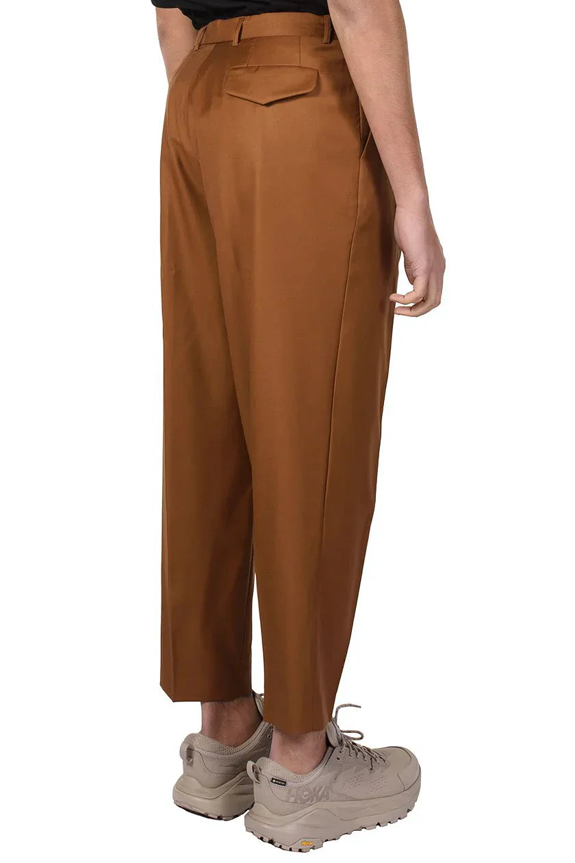 Mid-rise. Pleated front. Horn buttons. Wide leg pants. Carrot fit. Slightly short length. Colour: Brown Tobacco. Composition: Italian fabrics : 84% Wool 16% Mohair