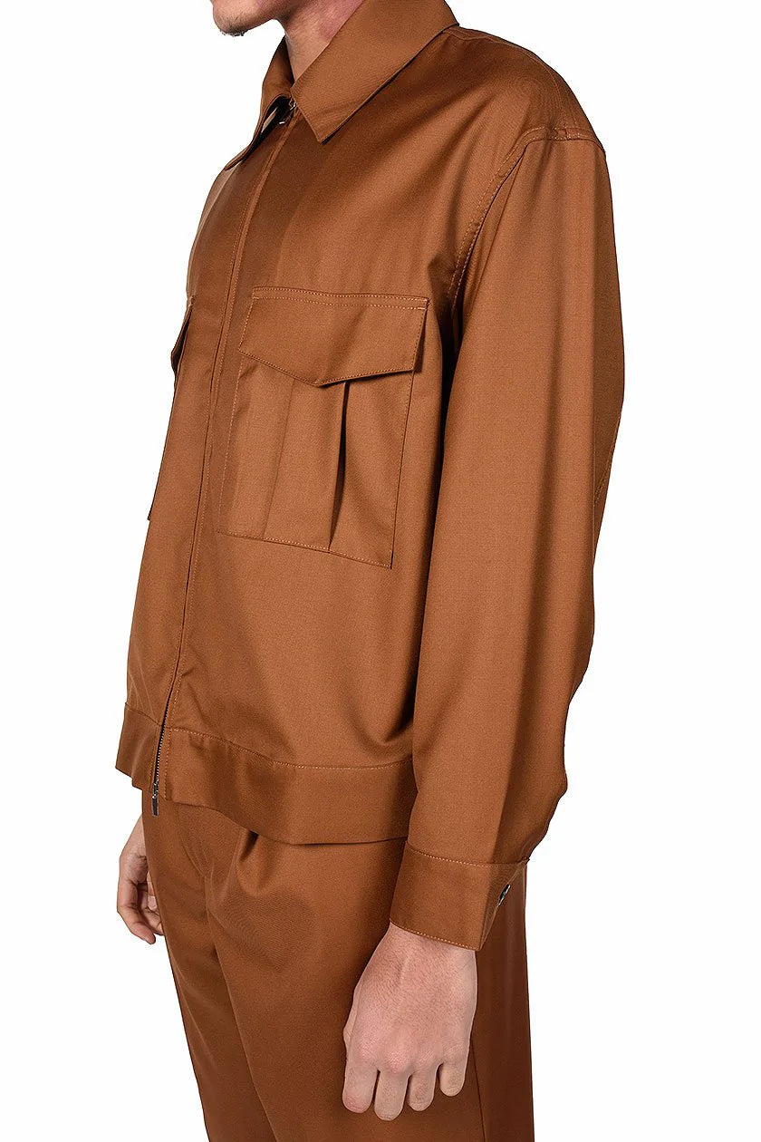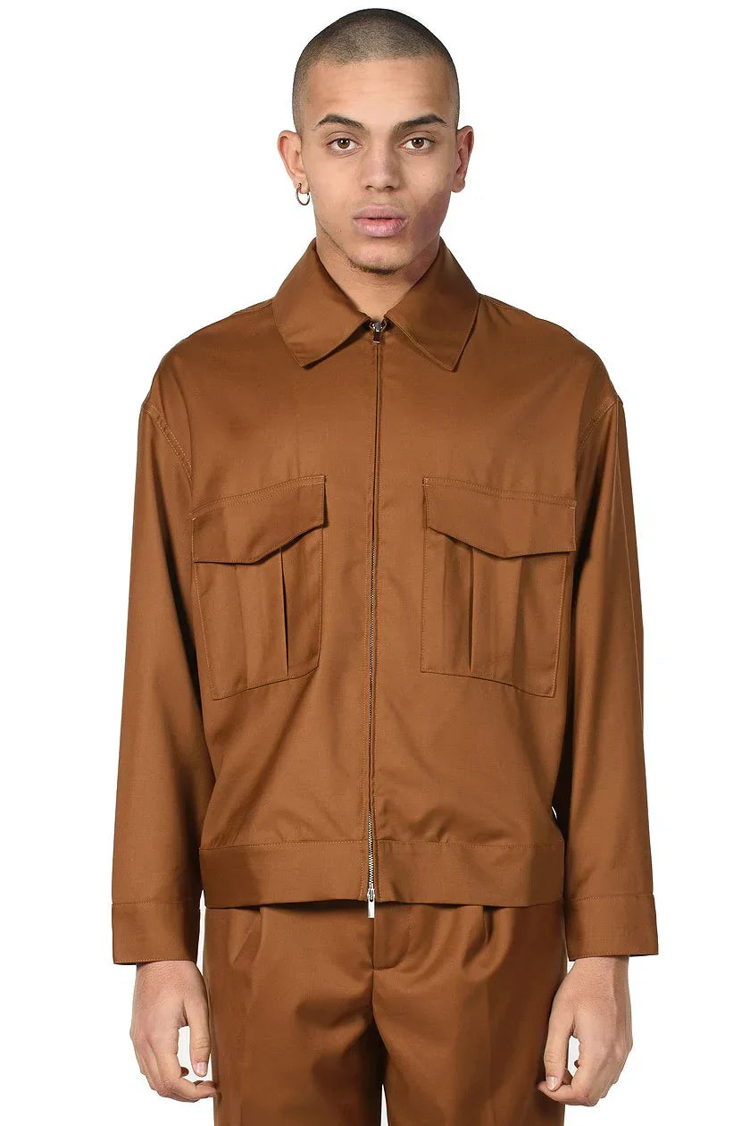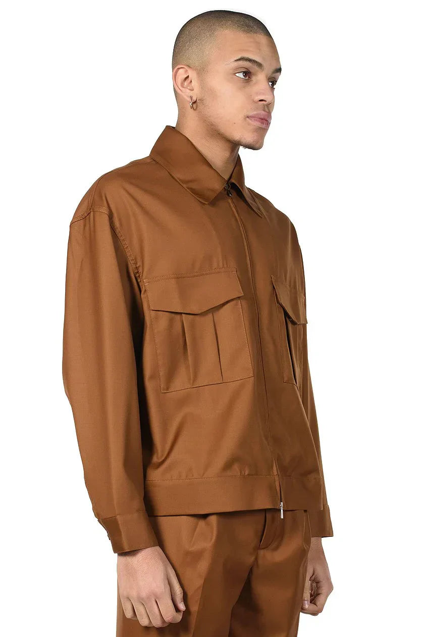 Military Jacket with zip. Front pockets. Relaxed fit. Dropped shoulders. Button on cuffs. Light luxurious fabric. Double zip at front.