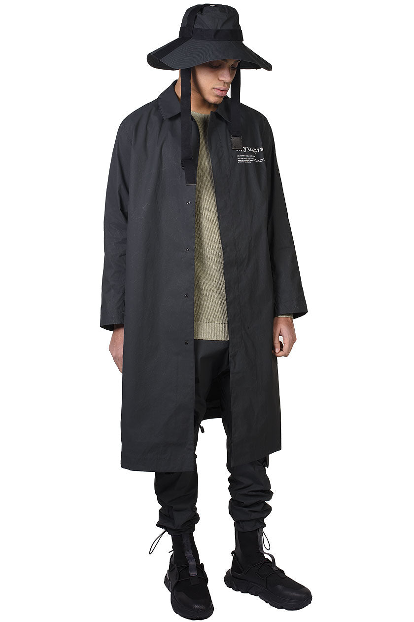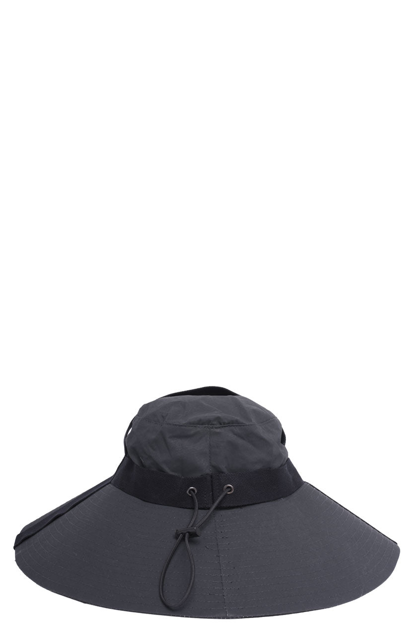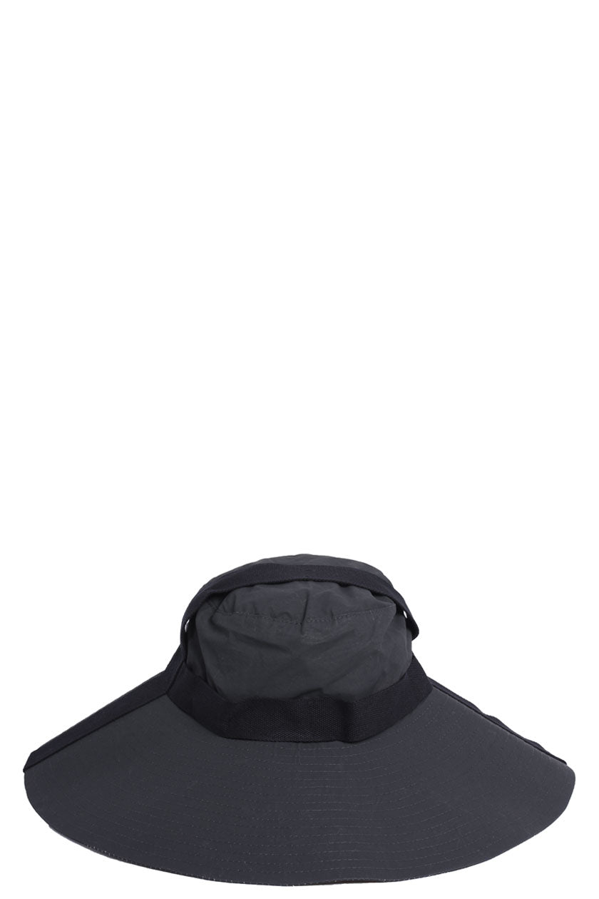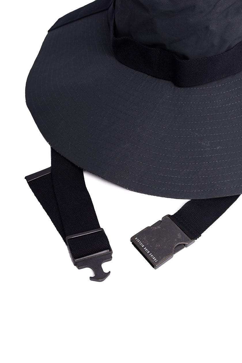 HA1_JUNO snail hunter hat w. canvas brand finish and drawstring detail. Large brim w. topstitch finish. Canvas hat band finish with topstitch. Canvas band chinstrap w. black ox metal buckle finish. Black drawstring adjuster detail center back.