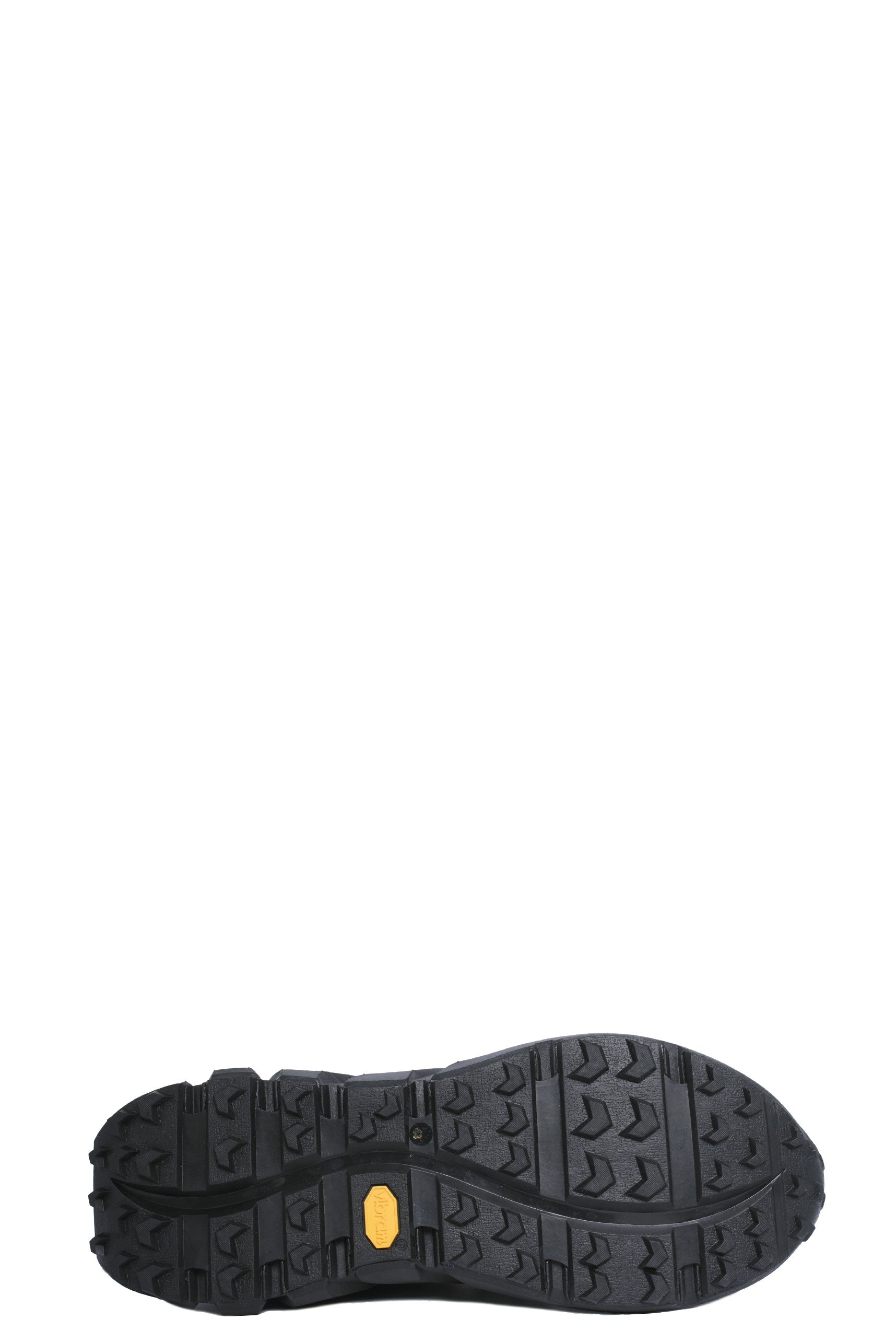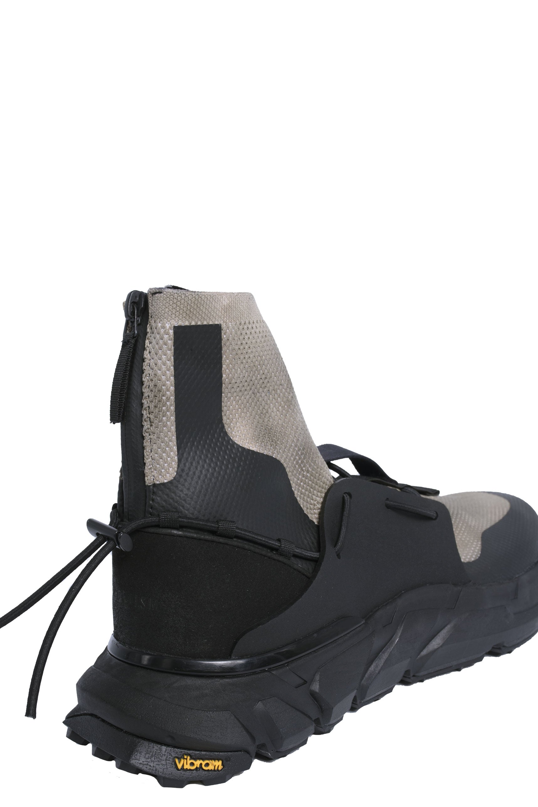 Lightweight. Breathable knit mesh. Black leather panels. Hefty Vibram sole units. Slim laces that weave across the upper. Waterproof PU coating that shields the shoe’s front.