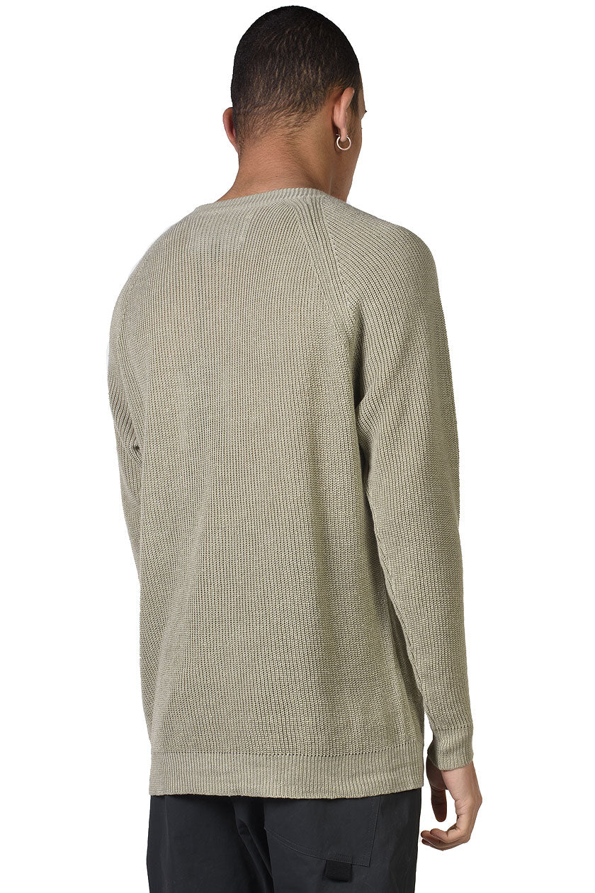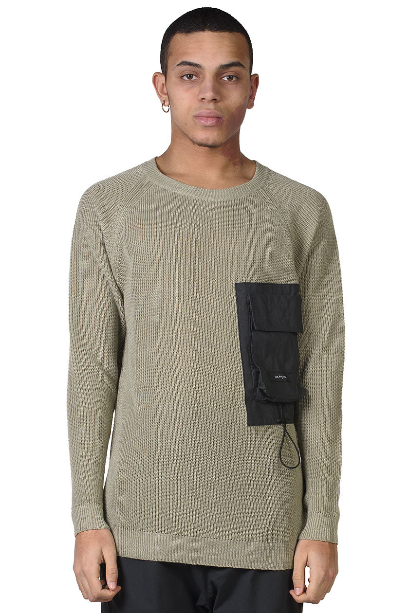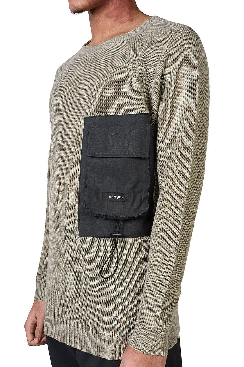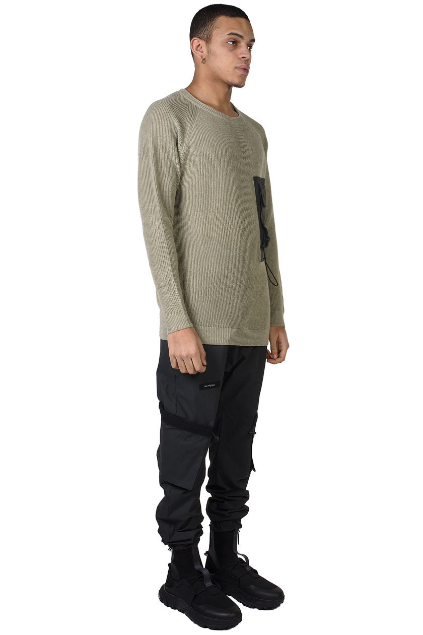 KN7_DHENAIN rib knit with chest adj. pocket. Fully-fashioned knitwear. Round neck with rib finish. Raglan sleeve construction. Chest pocket with magnetic closure and elastic cord detail in contrast woven fabric. Straight hem with rib finish.