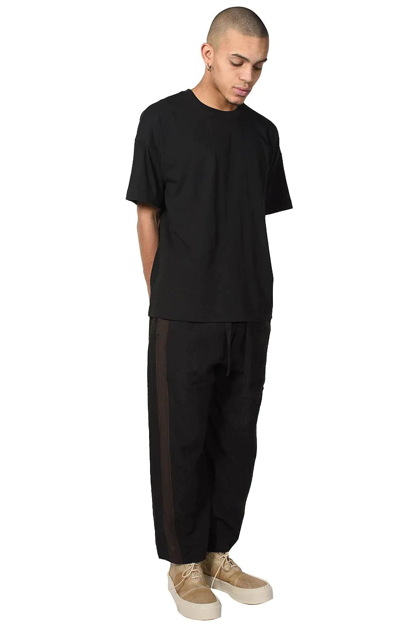 Ziggy Chen Trousers. Wide leg. Cropped leg. Loose fit. Slip pockets to the sides. Drawstring at waist. Crafted from linen blend. Comfortable soft feel. Stamped with contrasting tapes on the outseams.