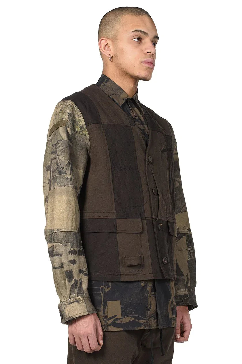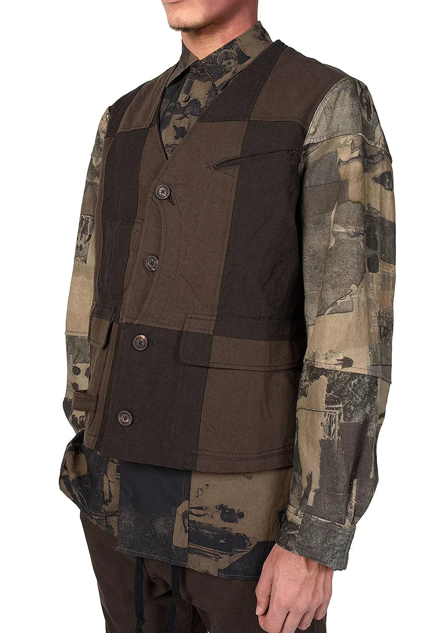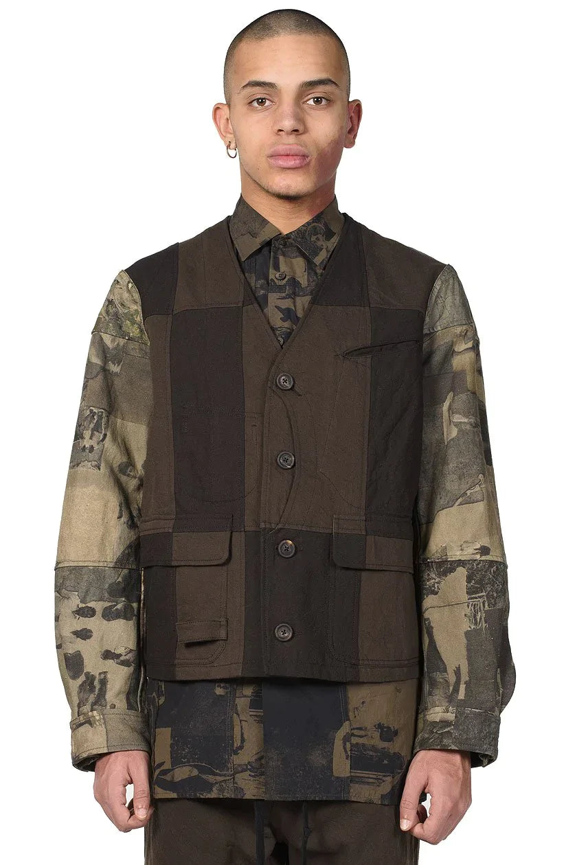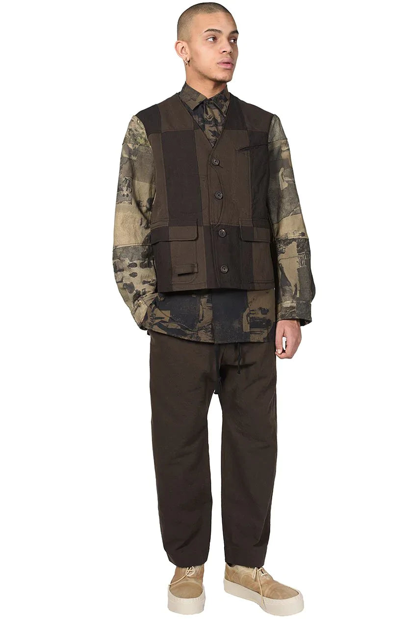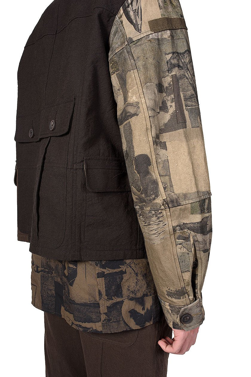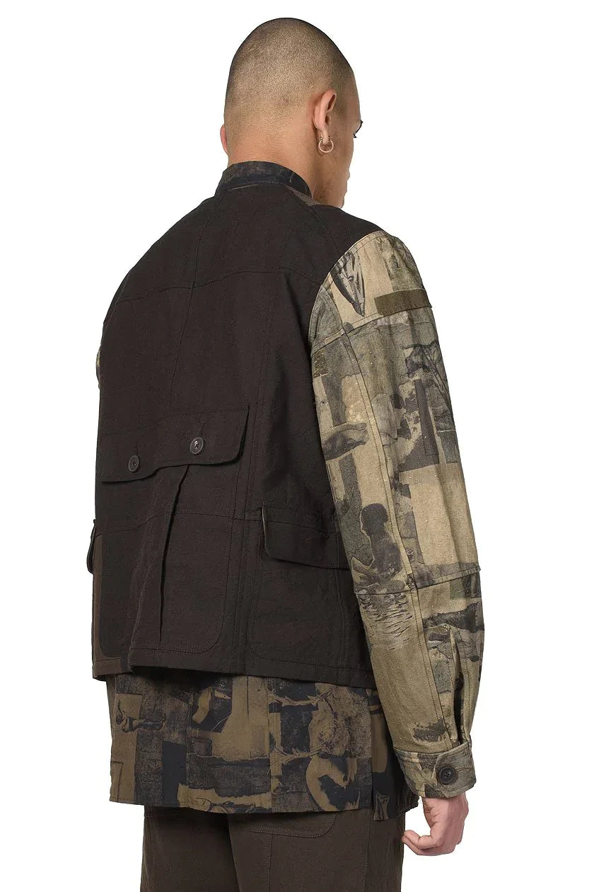 Ziggy Chen hybrid vest jacket. Utilitarian styles. Collarless. Slouchy silhouette. Chaotically placed pockets and patches. Patchwork throughout. Graphic printed sleeves. Crafted from cotton. Comfortable soft feel. Multiple pockets at front and back.