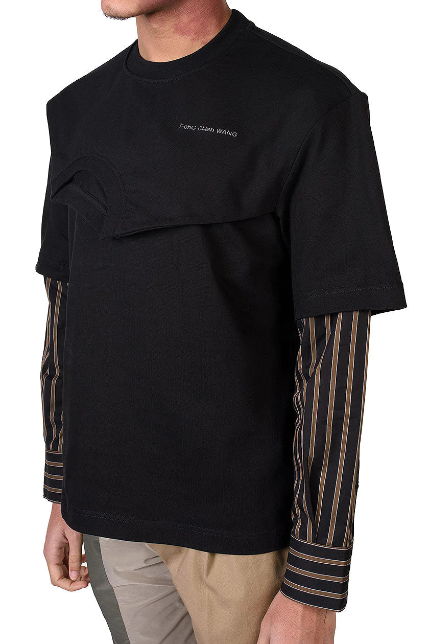 Cotton jersey classic 2-in-1 t-shirt with layered double crew neck. Shirt sleeves with stripes.Colour: Black. Composition: 70% Cotton, 30% Polyester