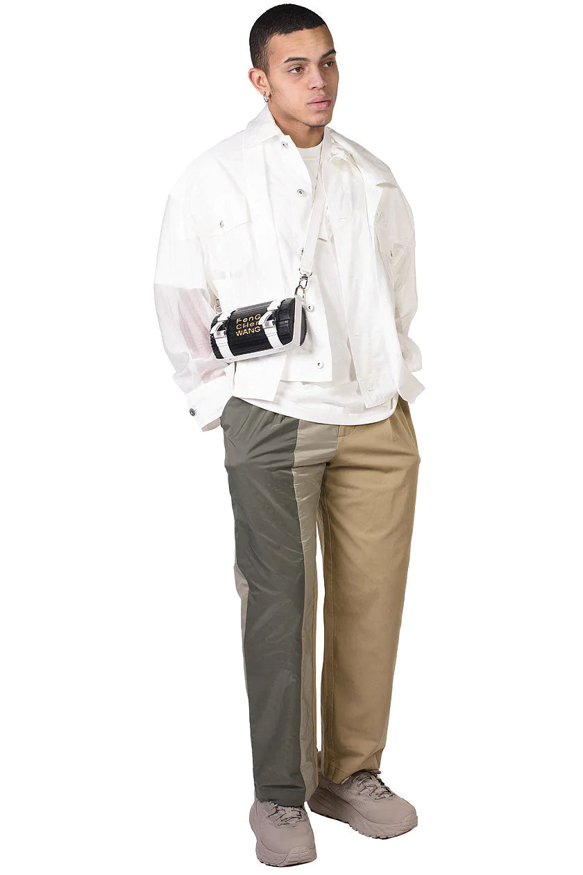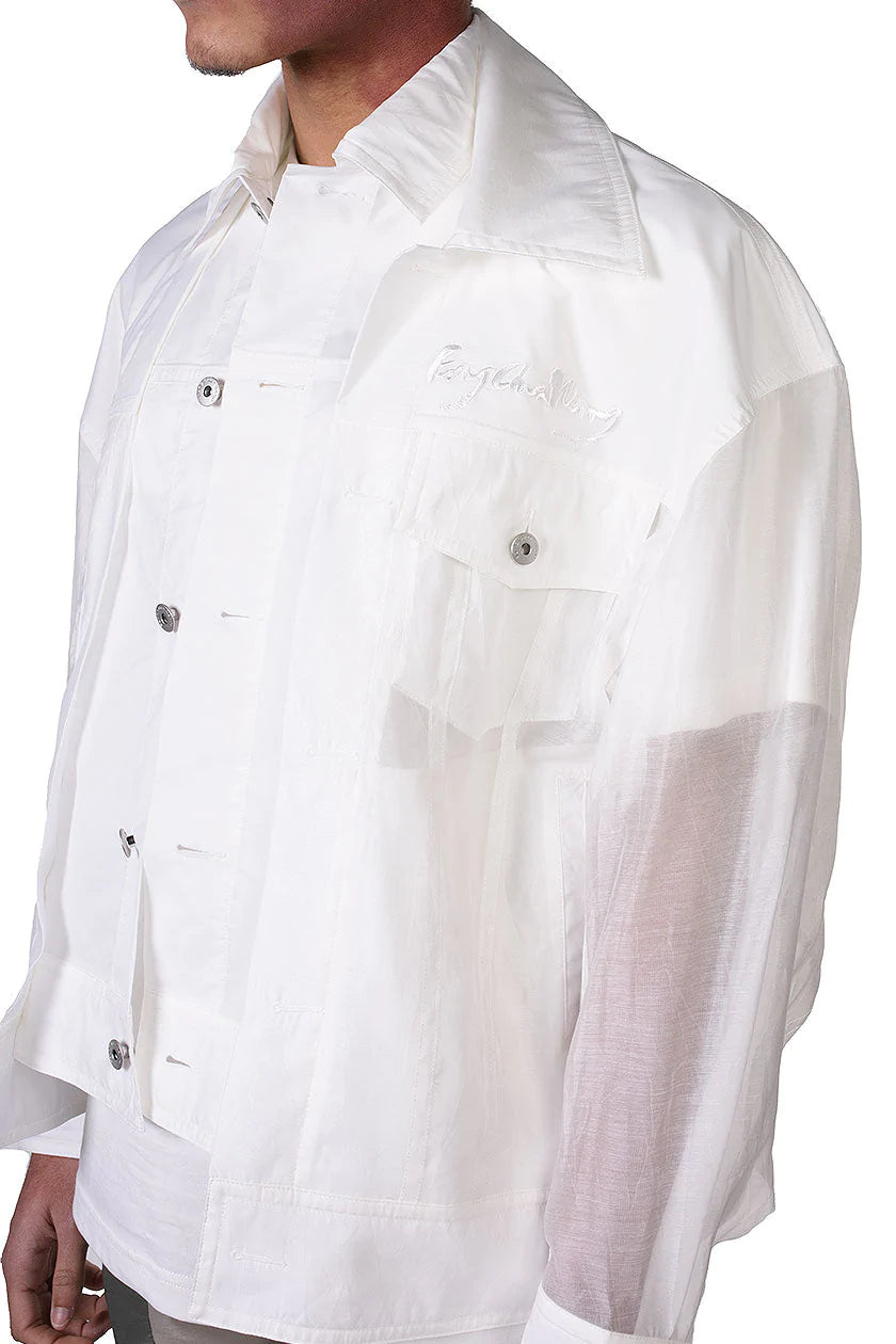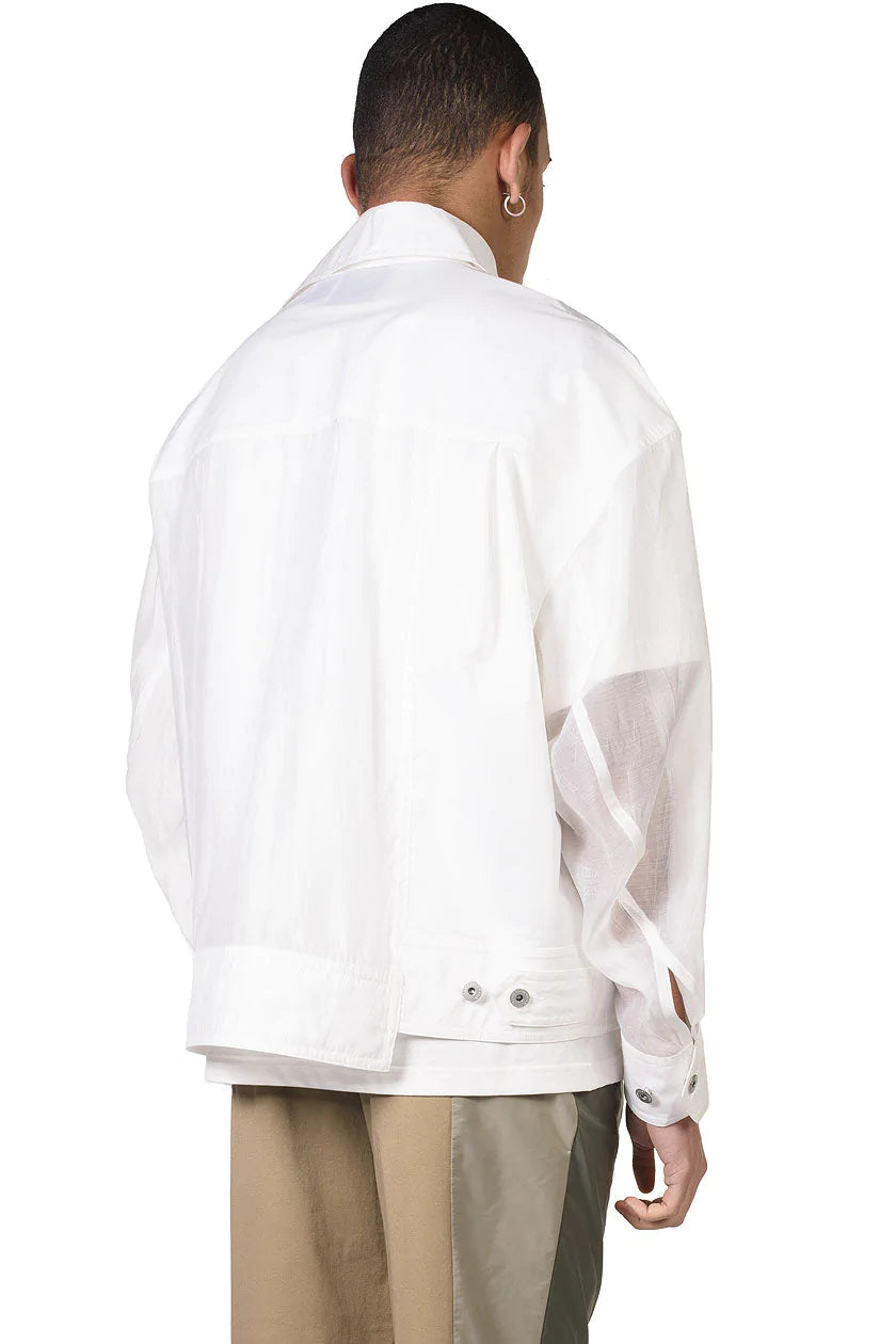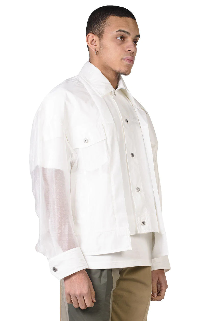 A relaxed lightweight transparent jacket. Stitching detail to sleeves. Elasticated waist and cuff. Button closure. Logo at Front.