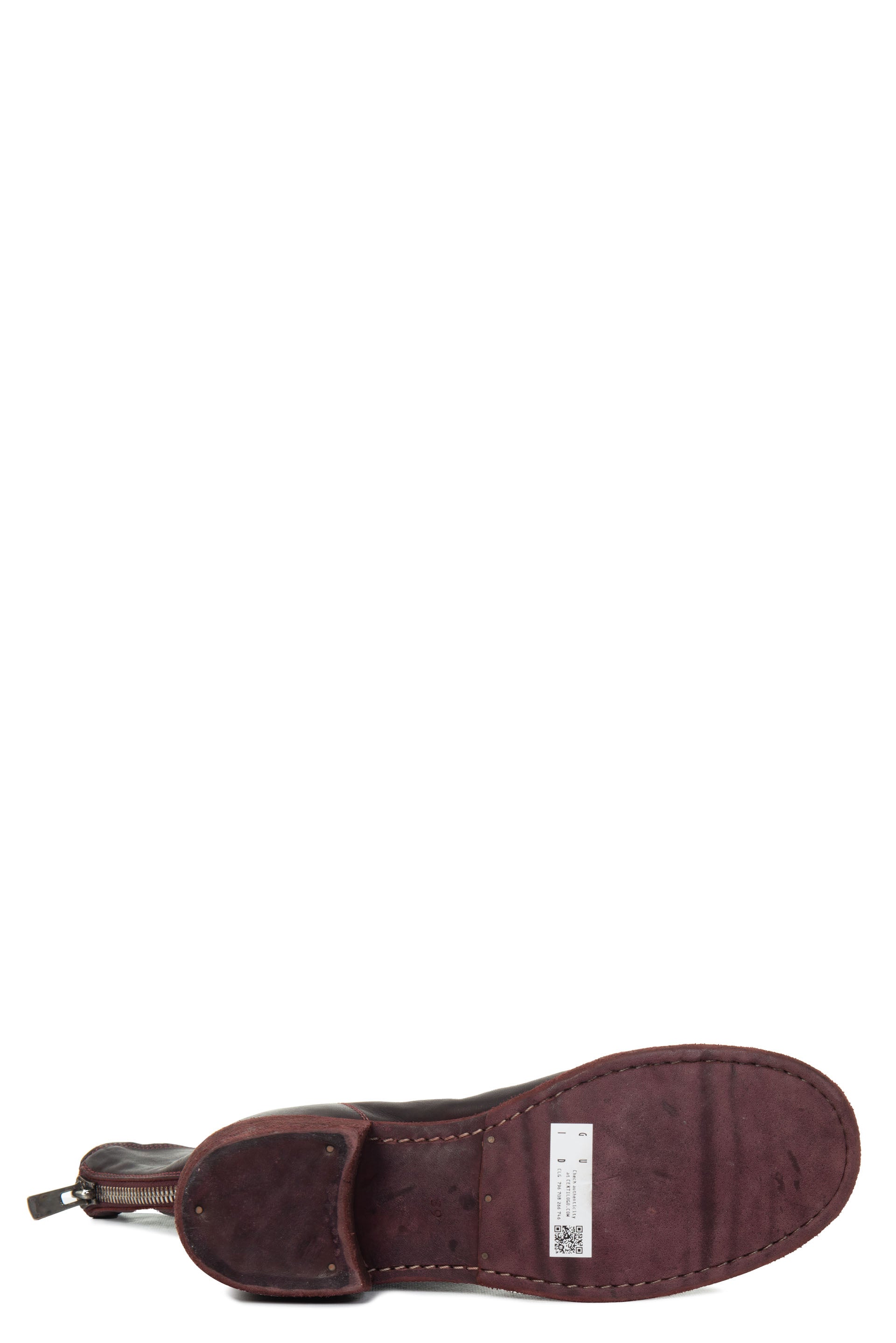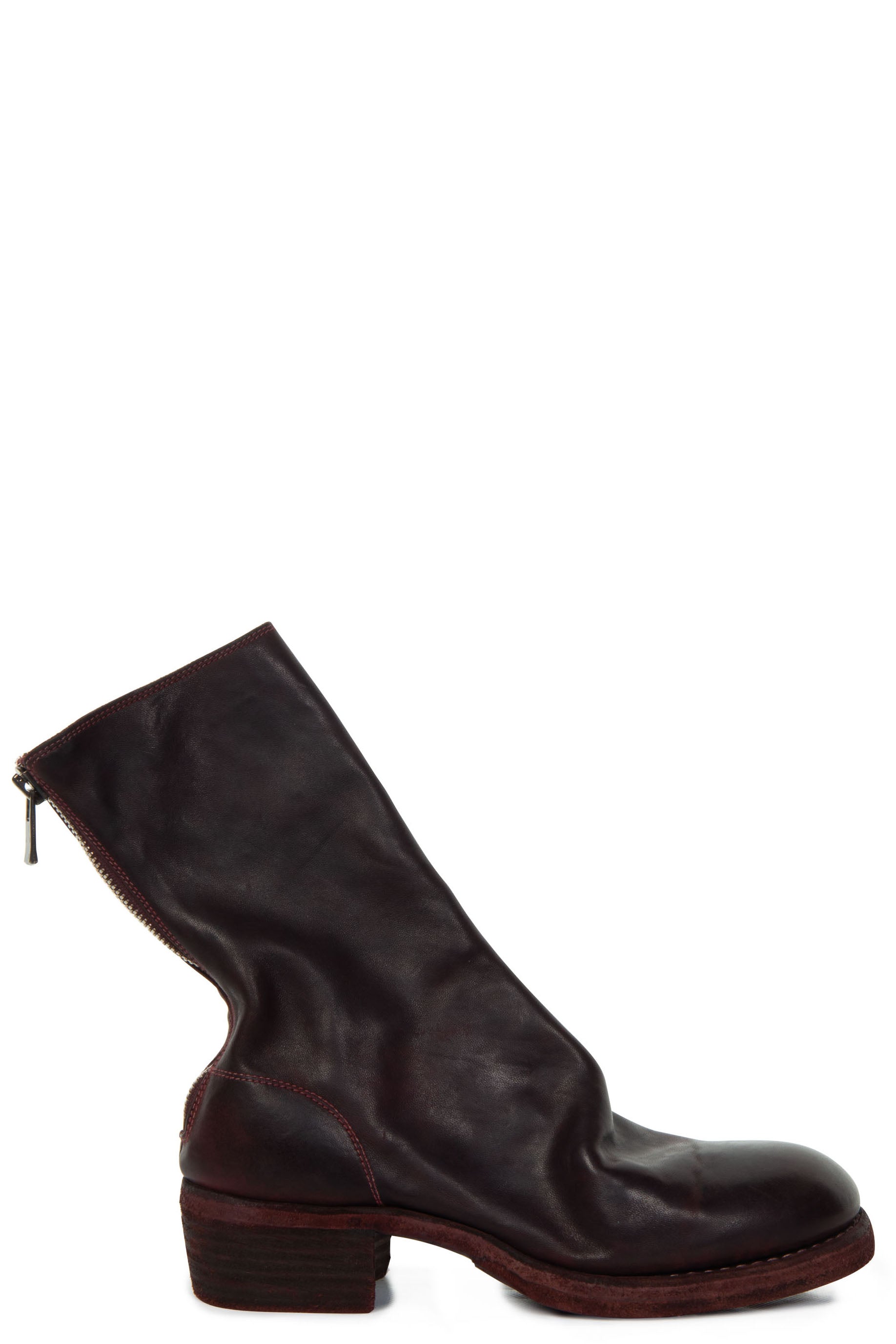 Guidid Horse Leather Back Zip Boots in Burgundy. 788Z Style. Horse leather. Burgundy dye. Antique brass-style detailing. Back zip closure. Stacked heel.