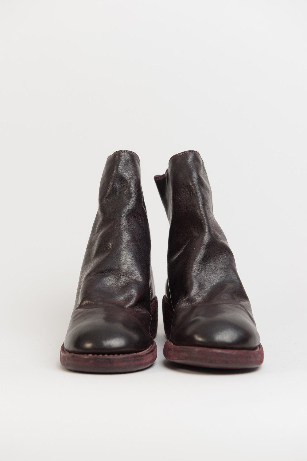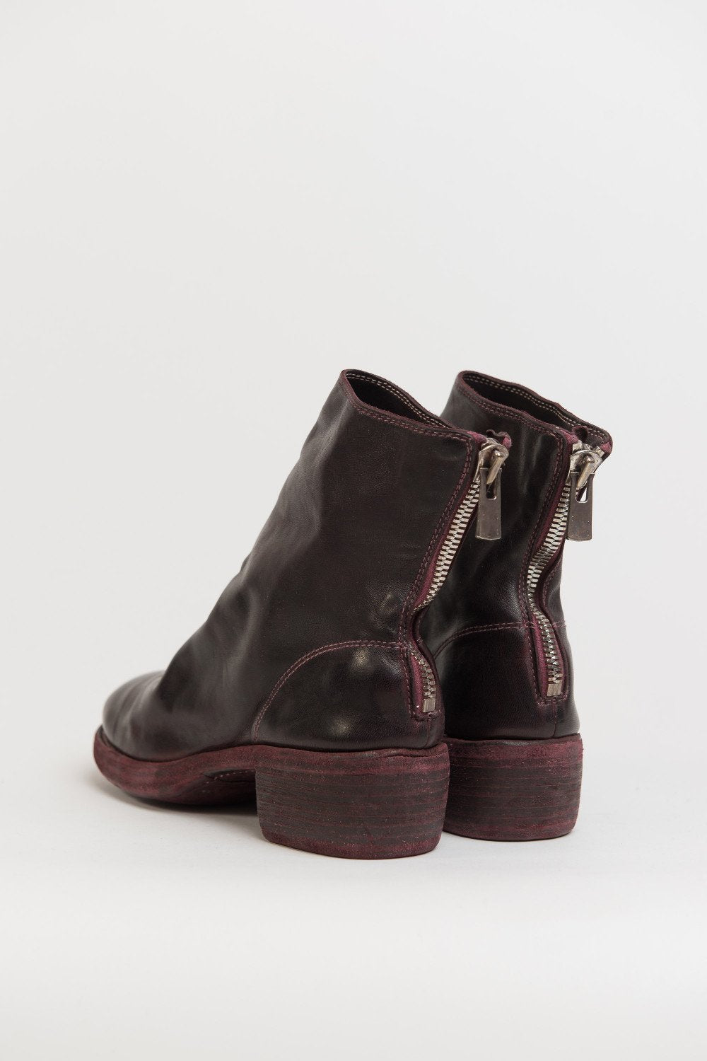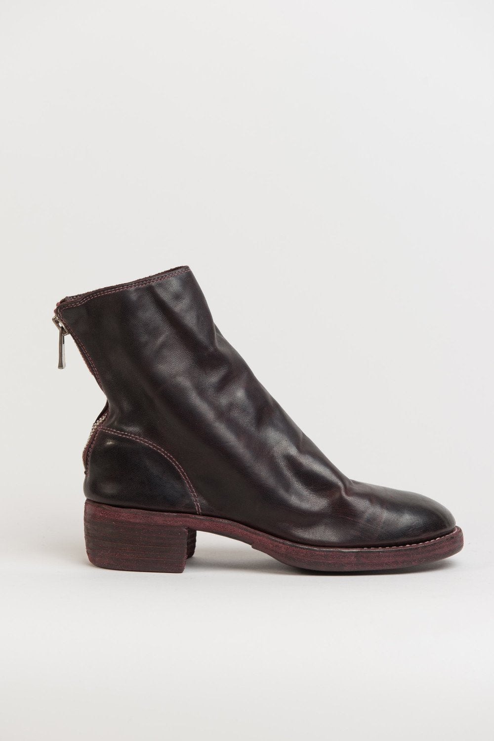 Guidi back zip boots in Burgundy. 796Z Style. Antique brass-style detailing. Back zip closure. Stacked heel. Horse leather. Burgundy dye.