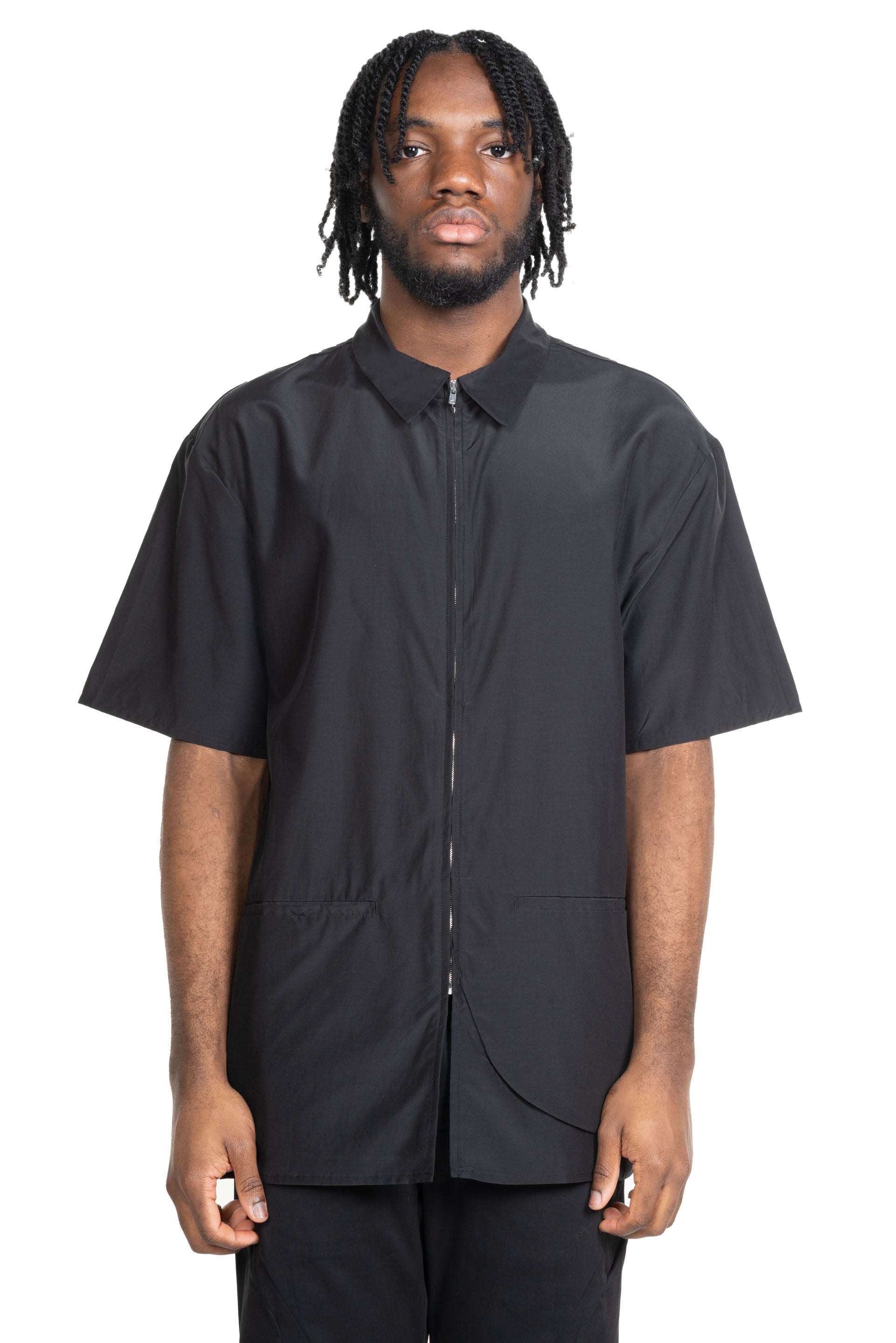 Silk cotton zip-up shirt. Distinctive curved and linear structured pocket design. Regular fit. Lightweight and comfortable feel enhanced by silk’s natural properties. Fabric from South Korea. YKK EXCELLA® zipper.