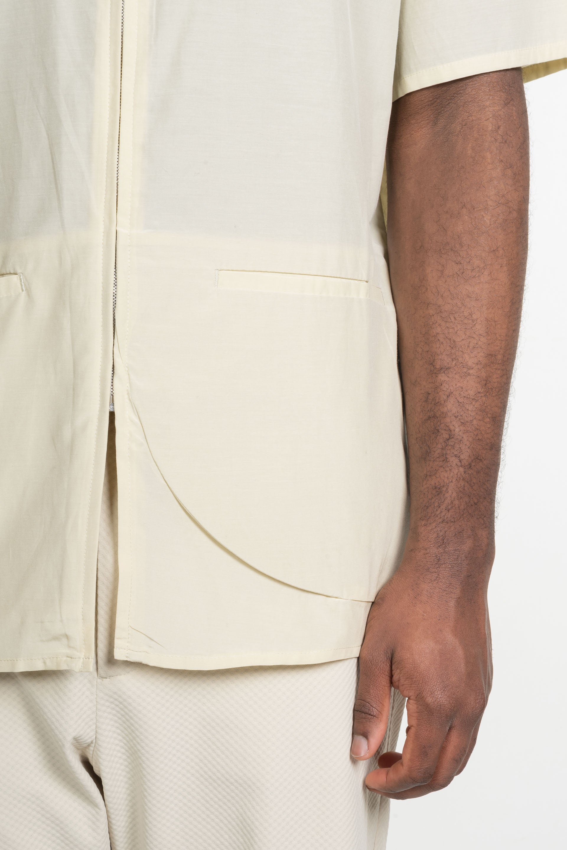 POST ARCHIVE FACTION (PAF) Silk cotton zip-up shirt. Distinctive curved and linear structured pocket design. Standard fit. Lightweight and comfortable feel enhanced by silk’s natural properties. Fabric from South Korea. YKK EXCELLA® zipper.