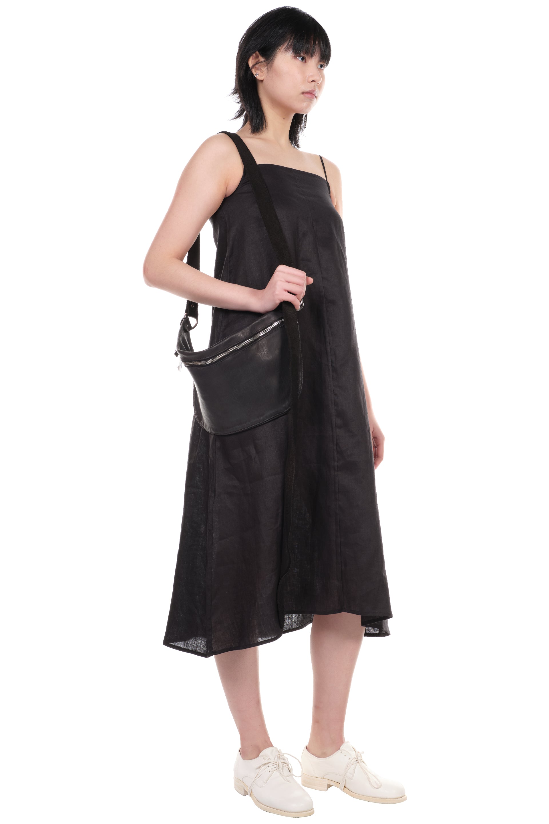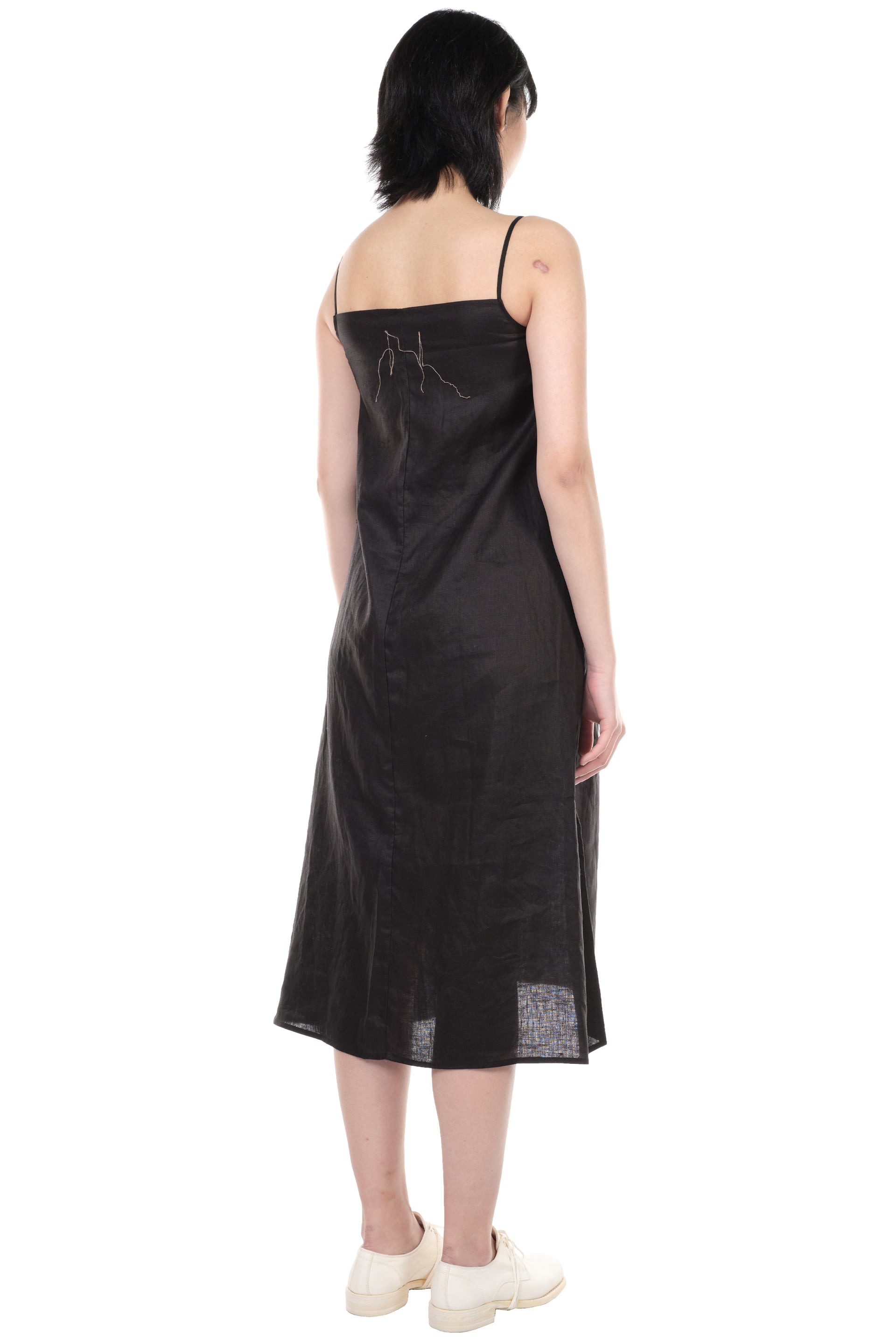 A-line Black Dress from Peng Tai. Two shoulder straps. Brand stitching at back. Beautiful linen fabric.