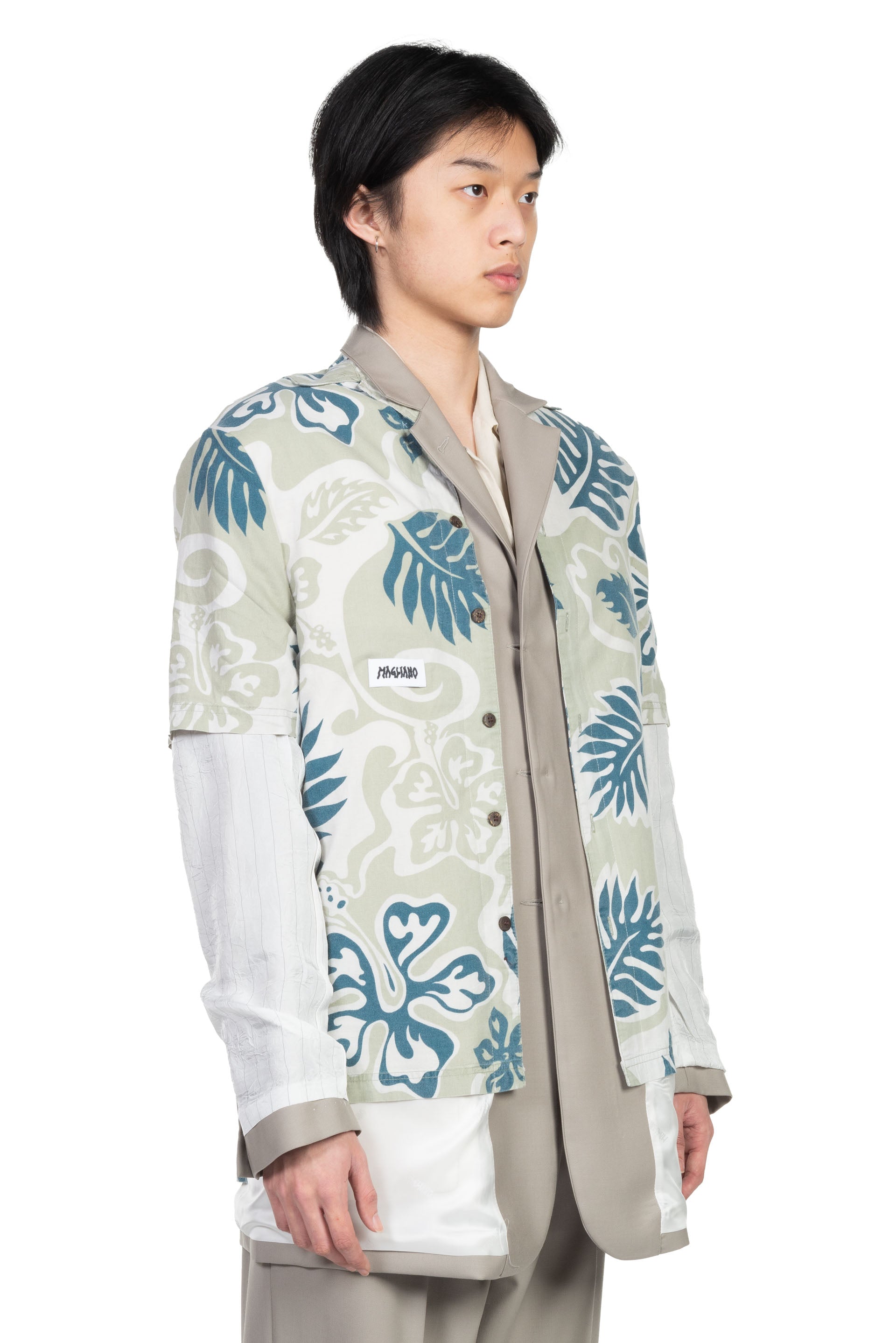 Single breasted jacket. 3 Button closure at front. Side Pockets. Inside pockets. Magliano twist. Reversibile featuring an inner Hawaiian print shirt. Hawaiian shirts are hand-selected by the Magliano team and have been re-worked to create this product. Possible variations and imperfections between each item make it unique to the wearer.