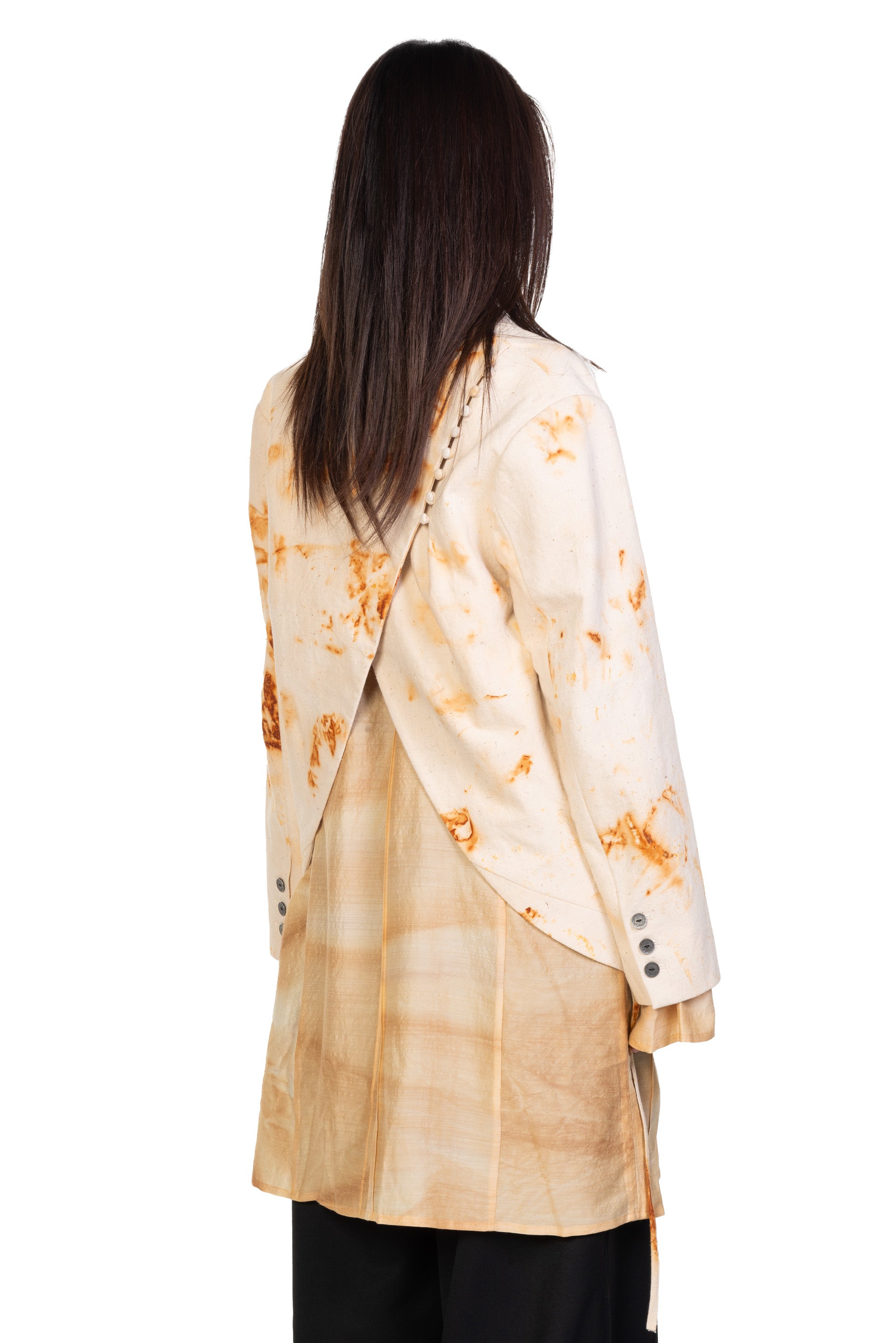 Professor. E understands the time of aesthetics from the use of cotton, hemp and wool. Fabric stitching, patching, designs without edge trimming, deconstruction, and reproduction are all Professor. E's signature elements creating classic immortal designs that can be viewed with the Abstract Cut Out Blazer Rusted Dyed.