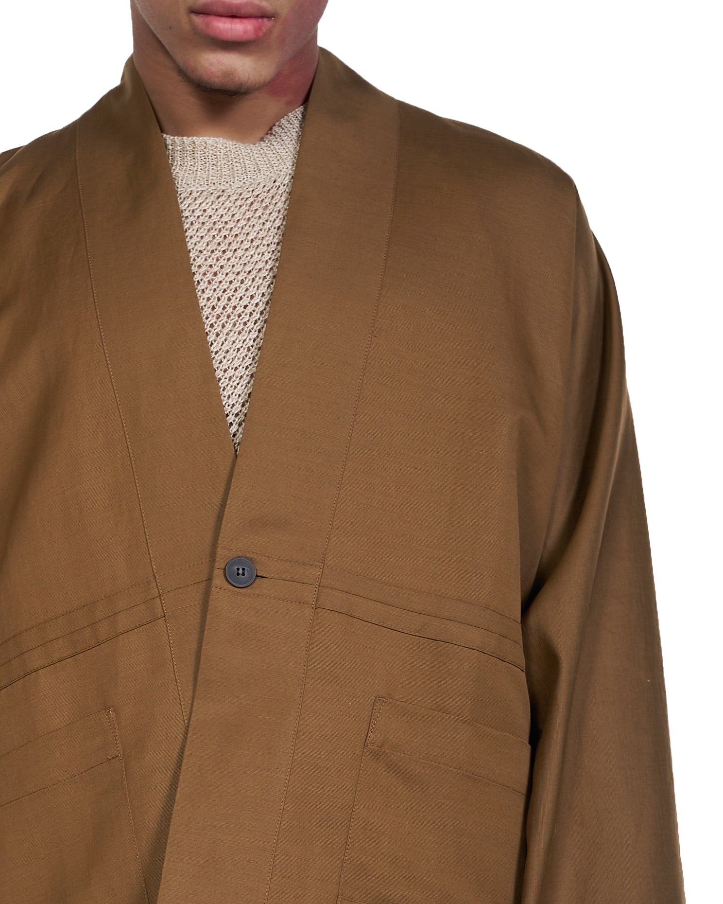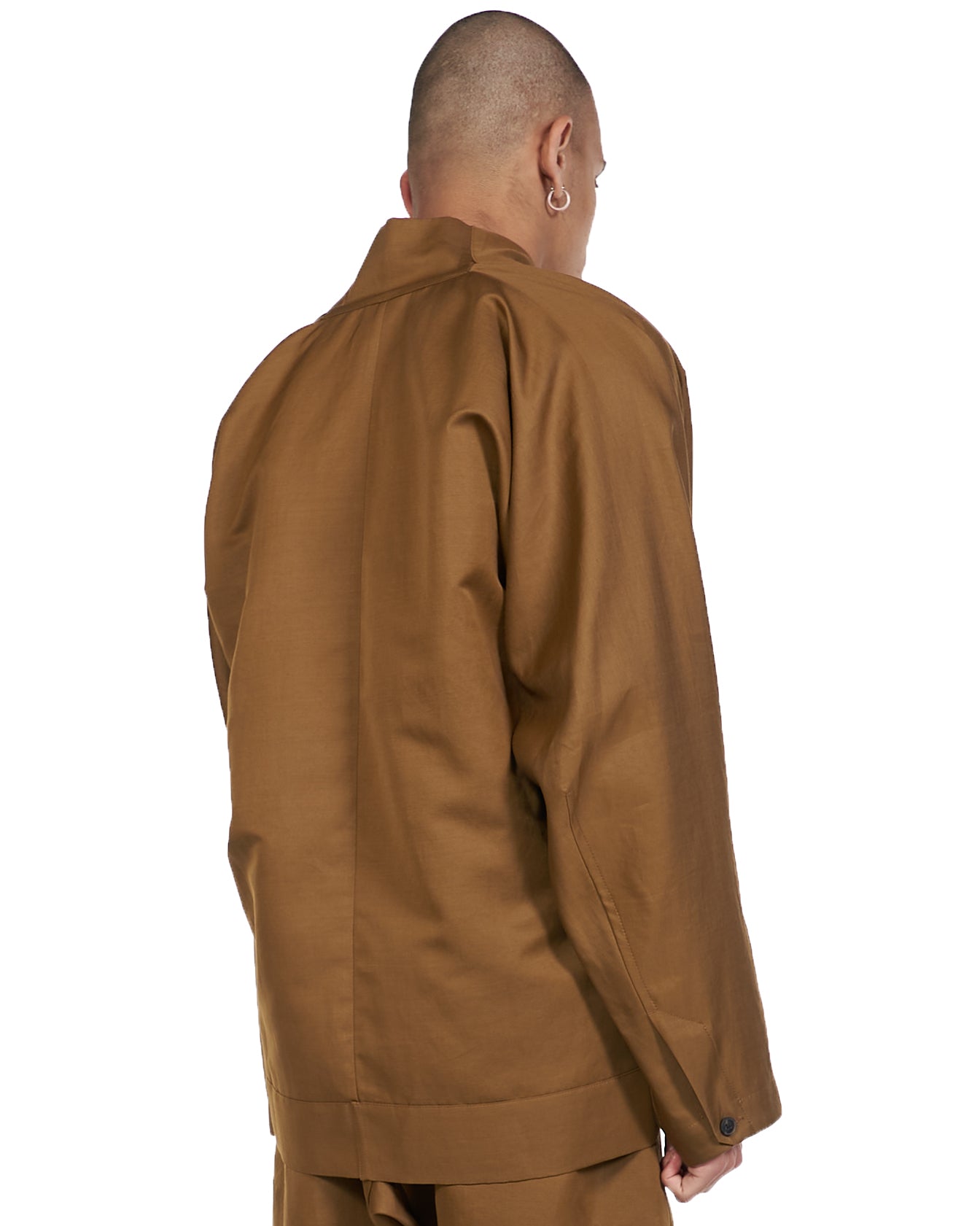 Long sleeve rami-cotton blend jacket in amber. Ainu Collar. Single-button closure at front. Patch pockets at waist. Single-button surgeons cuffs. Tonal hardware.