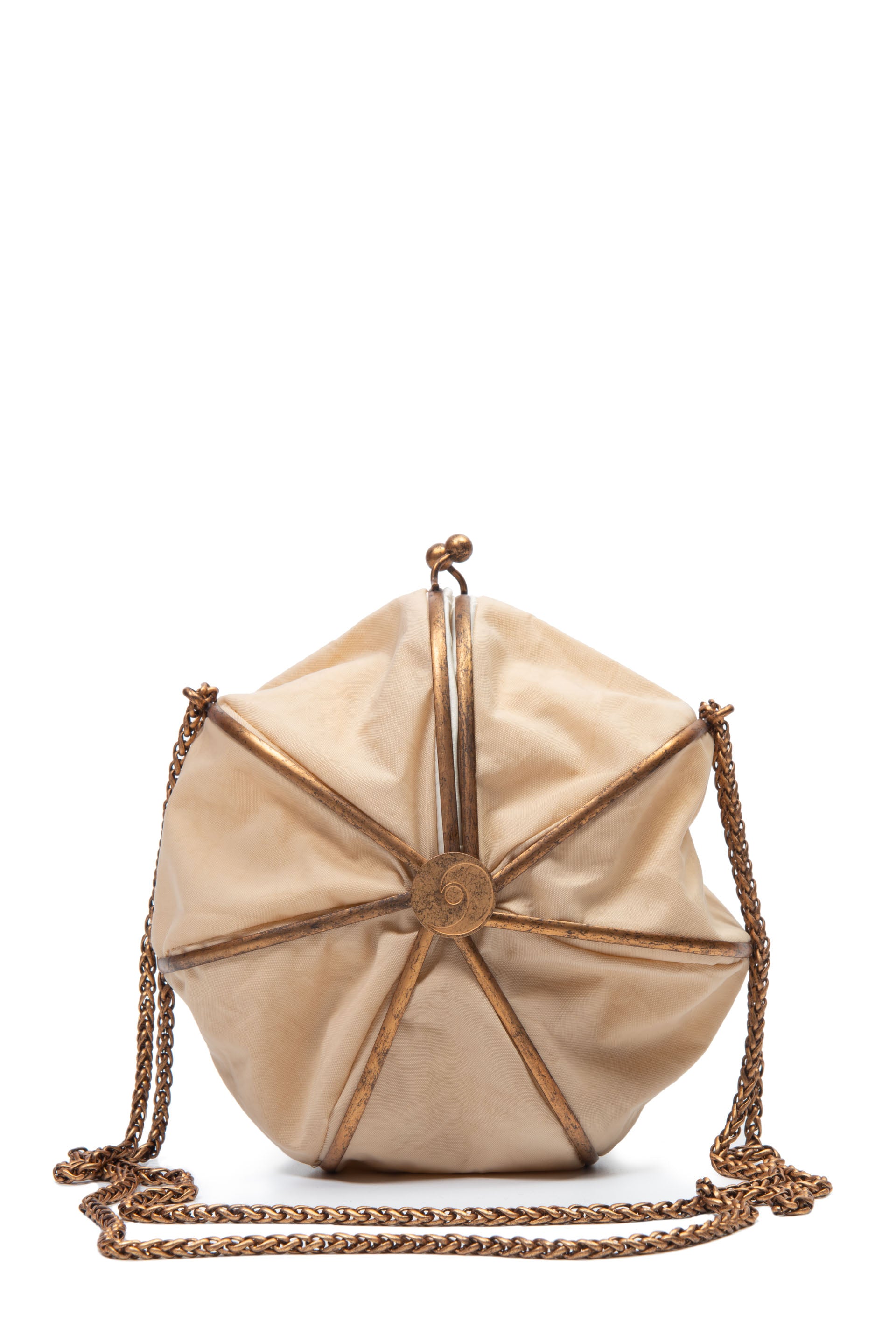Clasp closure at top. Satin lining with drawstrings closure inside. Aluminium structure details throughout. Handle and metallic strap.