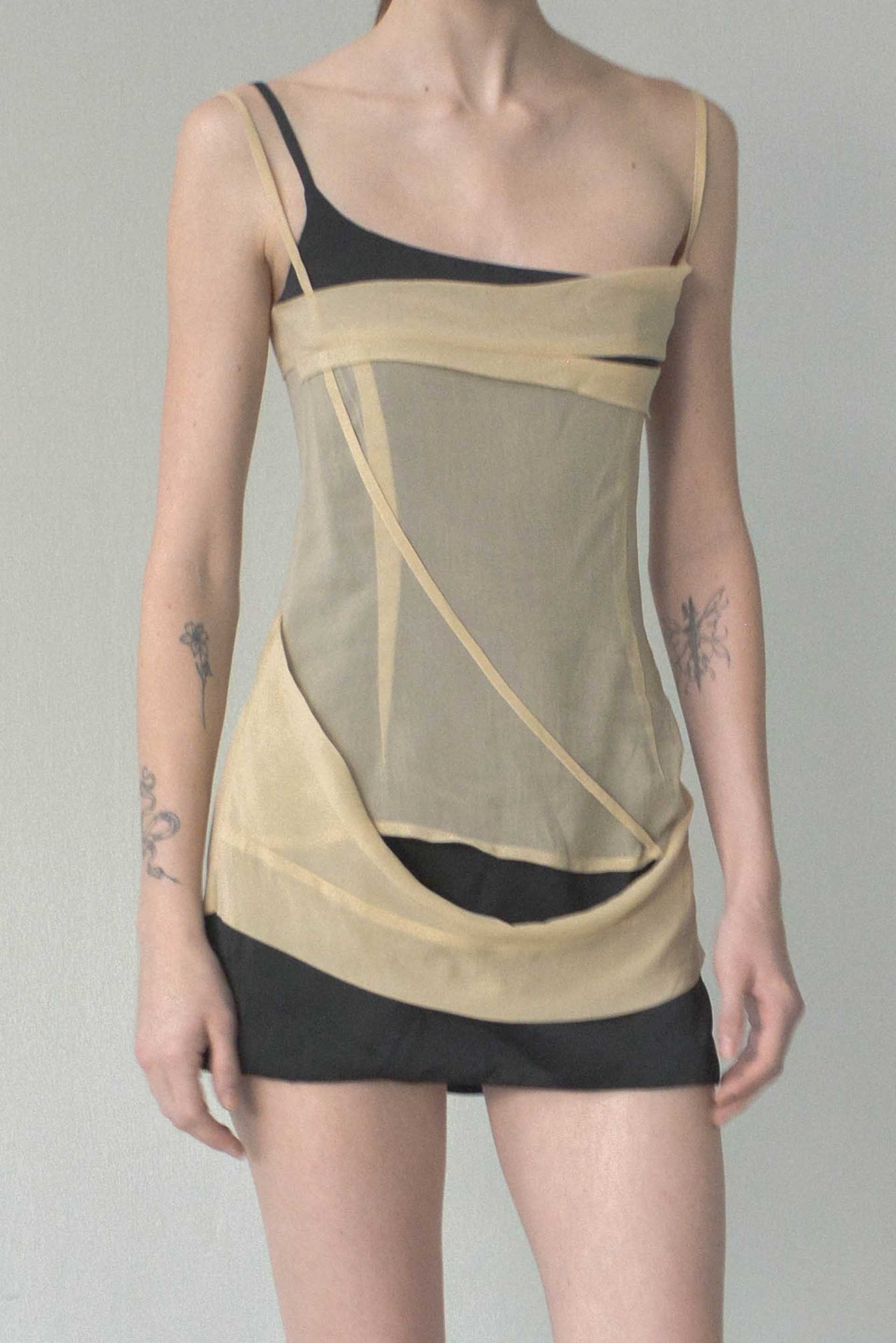 The Alvaro Nude Silk Dress is a sheer silk short dress lined with satin featuring spaghetti straps and drape details. Side zipper opening. Body-fitted.