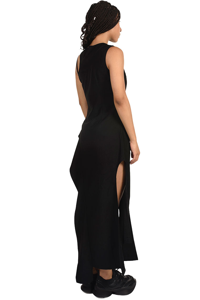 Sleeveless Long Dress In Black. Layered Construction. Multi Strap Patterns. Buttoned Closure At Shoulder.