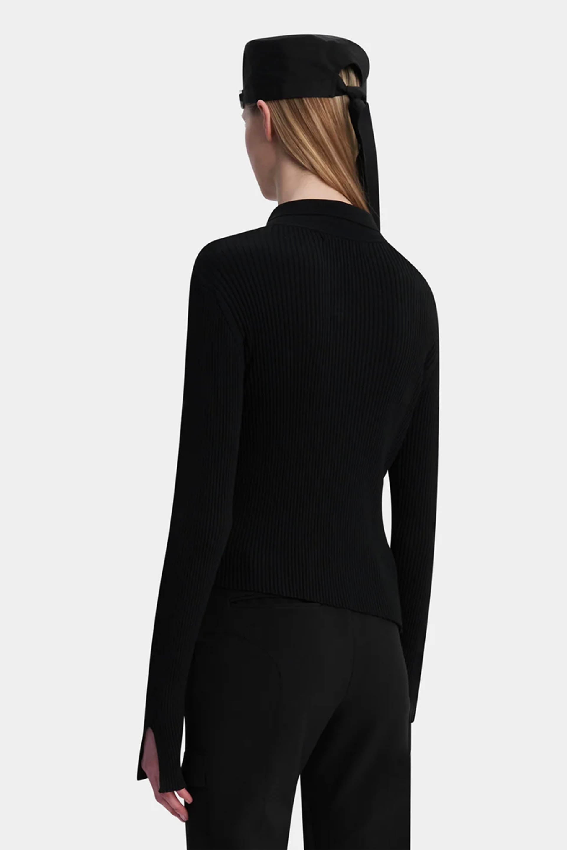 Ribbed top knitted in with seamless 3D technology. Garment is knitted in one piece with no seams on body. Collar attached with seamless 3D technology. Diagonal silver front zip attached with a single stitch. Sheer knit with a crisp hand feel. Clean finished edge