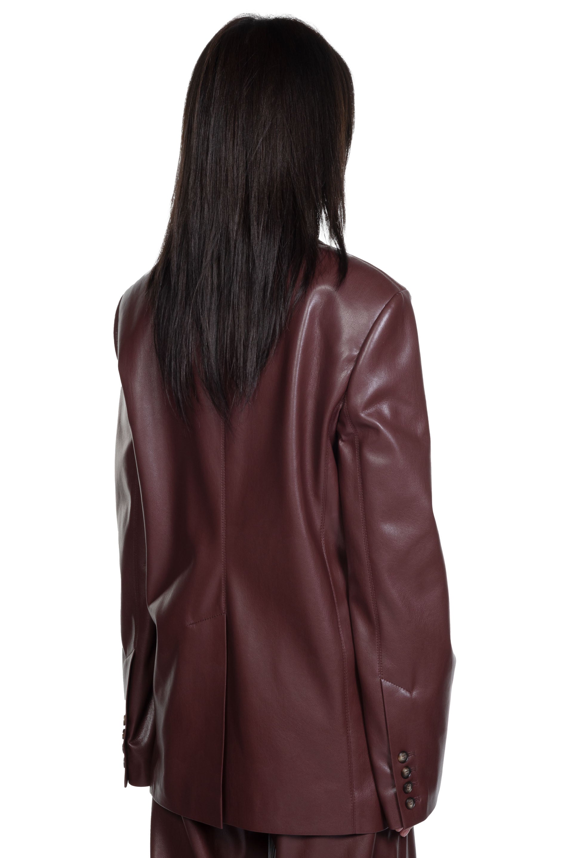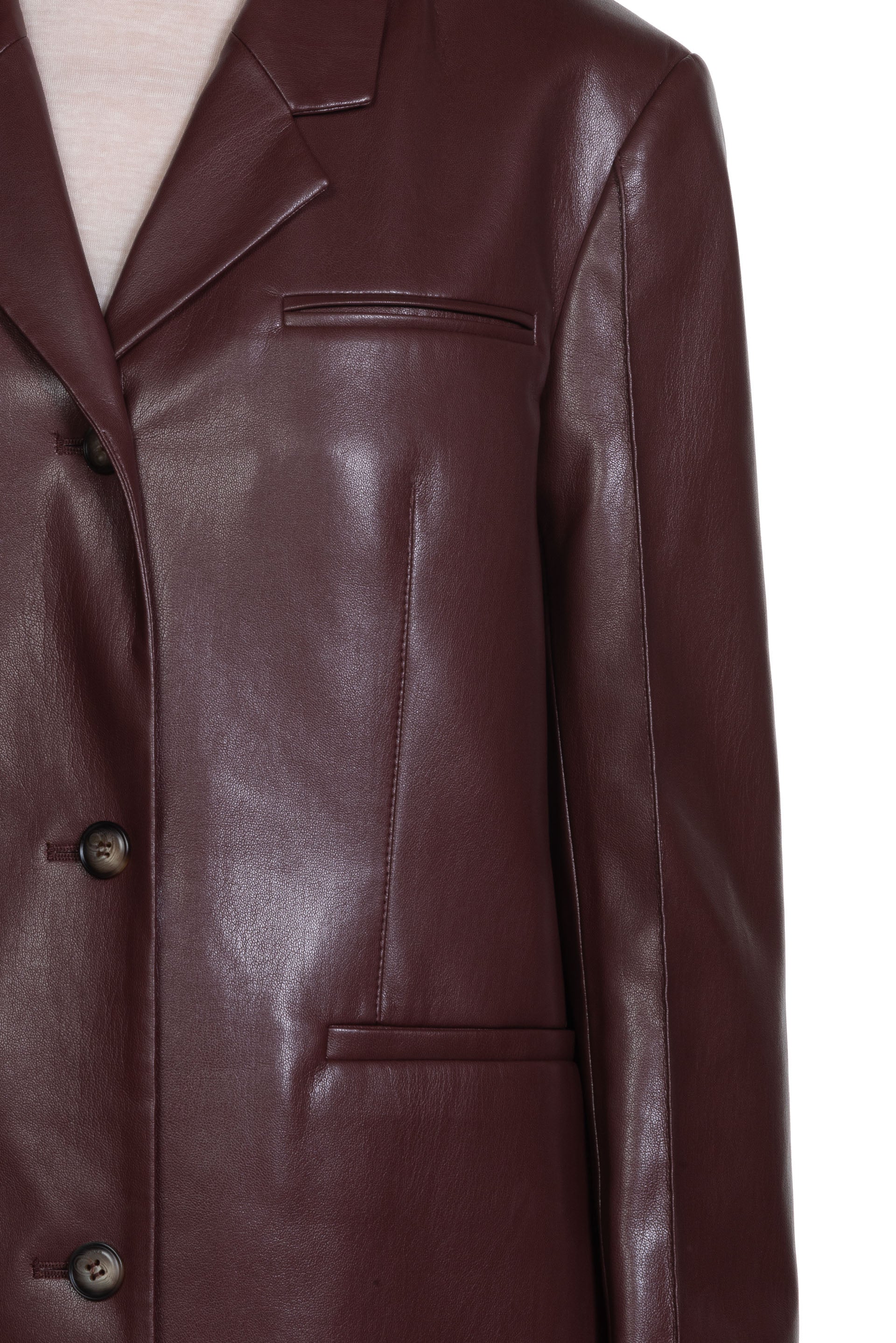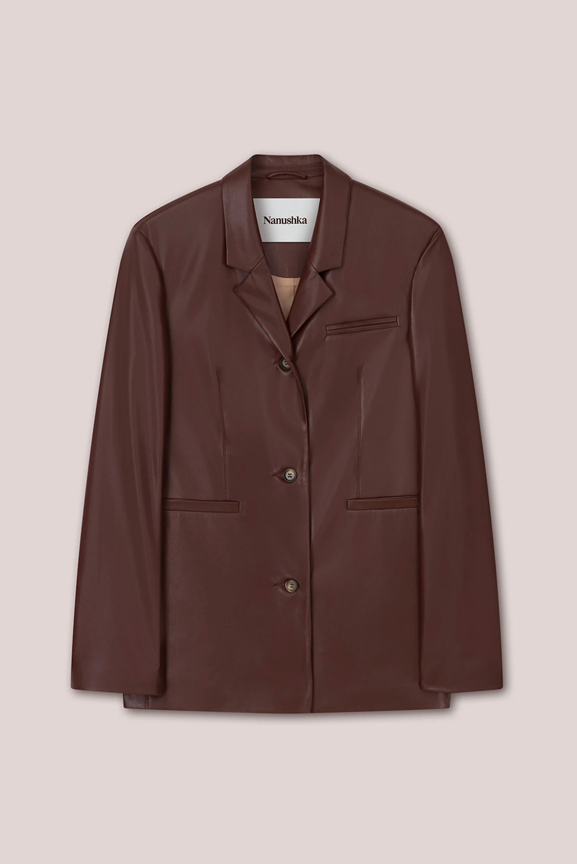 Timeless blazer recast in Nanushka signature plum chutney OKOBOR™ alt-leather. Long sleeves. Boxy fit. Minimal details for a clean finish.