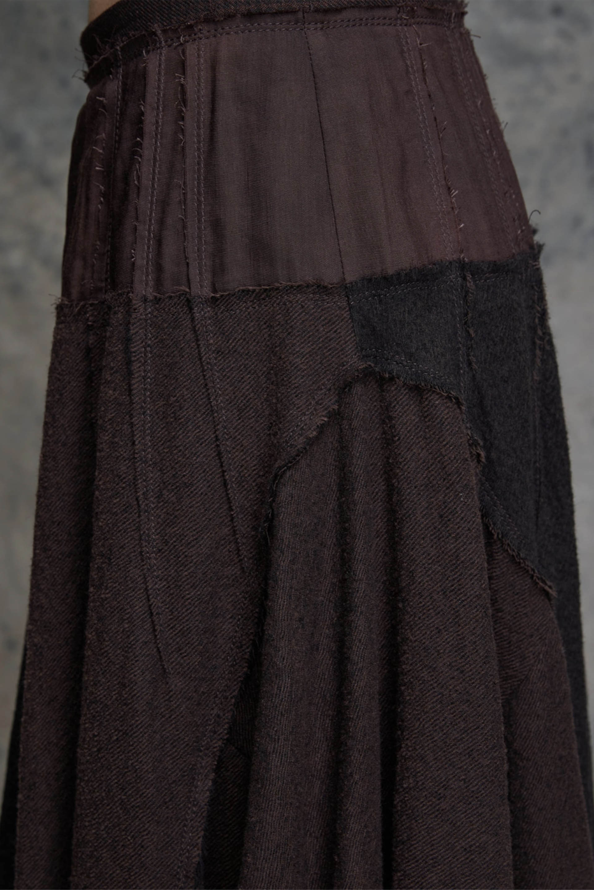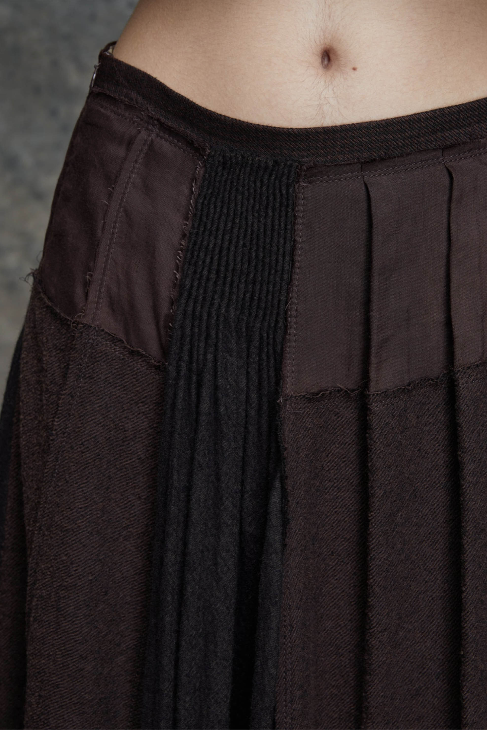 Loose fit. Full length. Concealed side zipper closure. Small pleats sewn with different fabric. Asymmetric hemline.