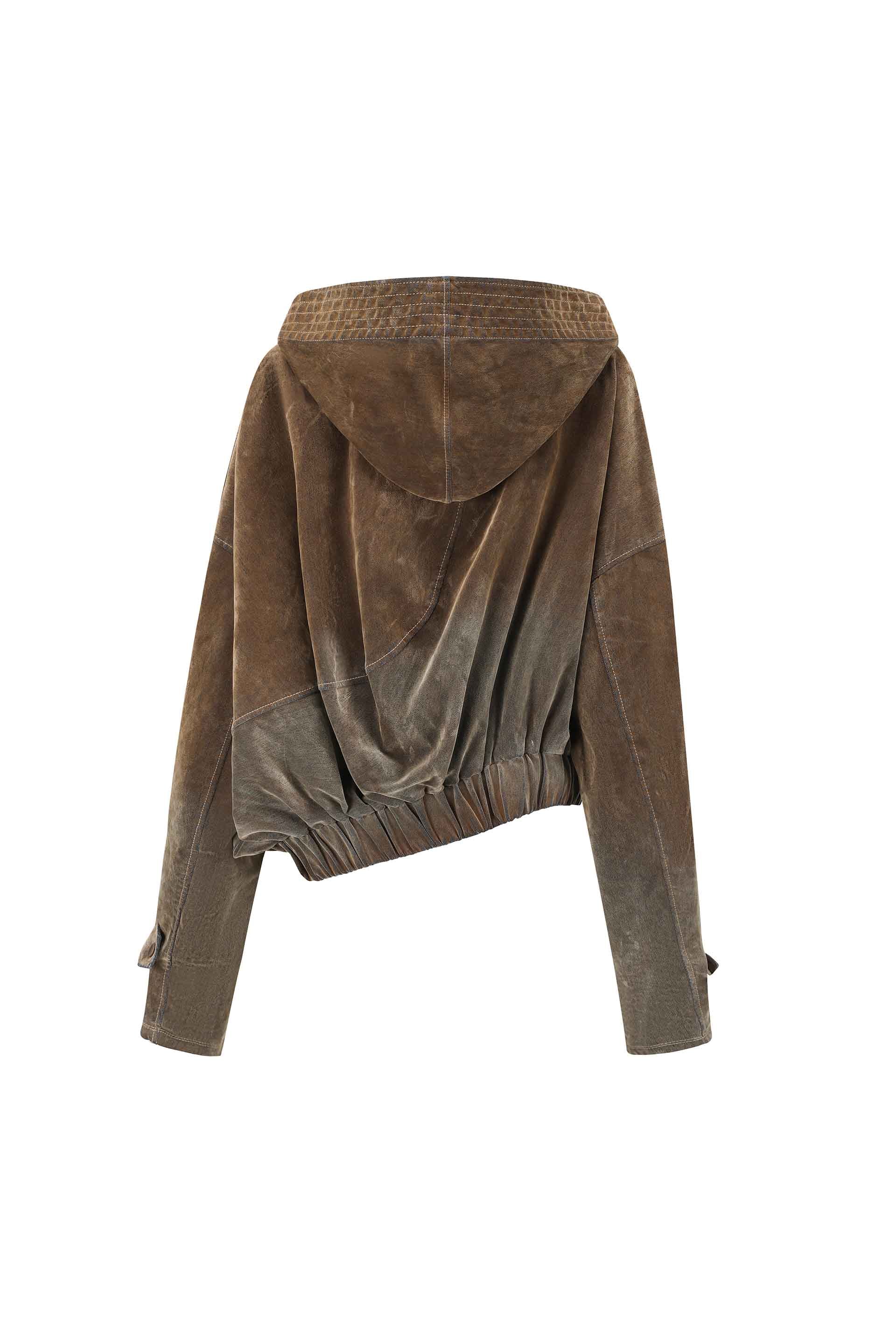 Crafted with meticulous attention to detail, this asymmetric washed velvet jacket is made from velvet denim, offering a structured silhouette and a smooth touch with a unique sheen. The design artfully blends deconstructed draping techniques with washing, ingenuously combining vintage and contemporary glamour.