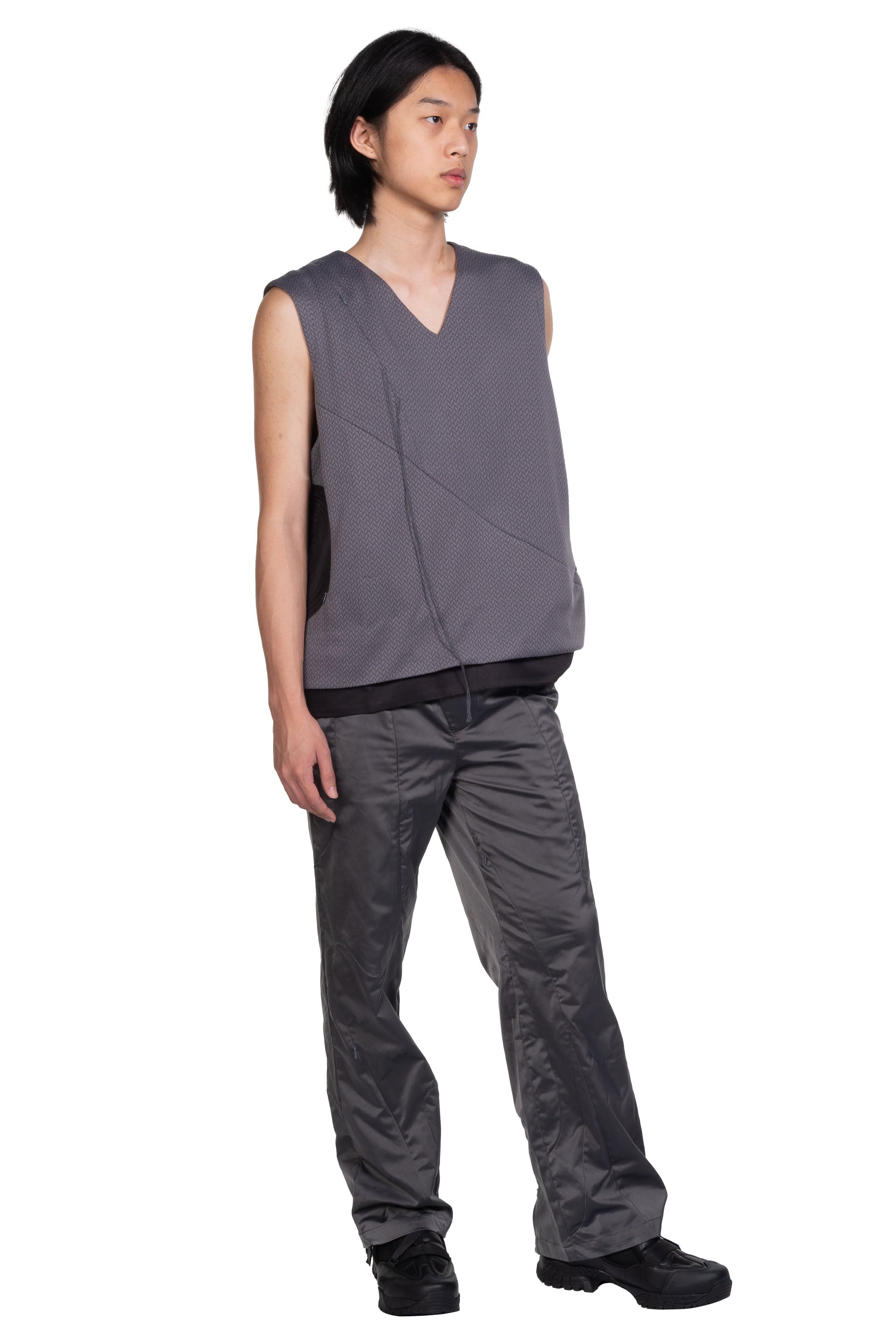 Aenrmous plays heavily with layers, asymmetry, deconstruction of pieces and detachable or adjustable elements. The brand understands trends while building something new and exciting as seen with the Asymmetrical But Symmetrical Vest Grey.