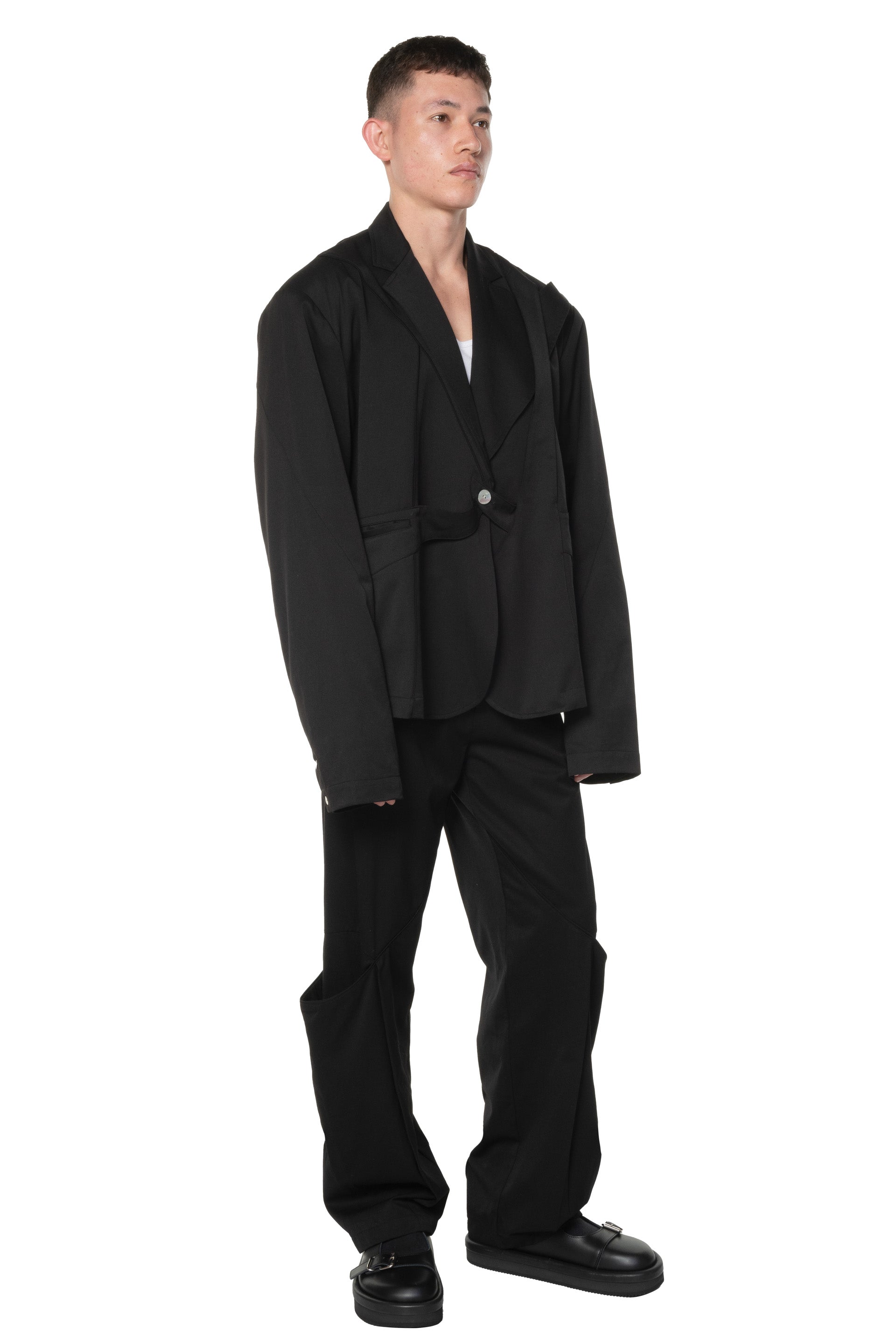 Layered. Panelled with asymmetrical construction. Notched lapel. Button closure. Welt pockets. Padded shoulders. Two-button surgeon's cuffs. Draping at back. Central vent at back hem. Welt pocket at interior. Full cupro satin lining. Logo-engraved mother-of-pearl hardware.