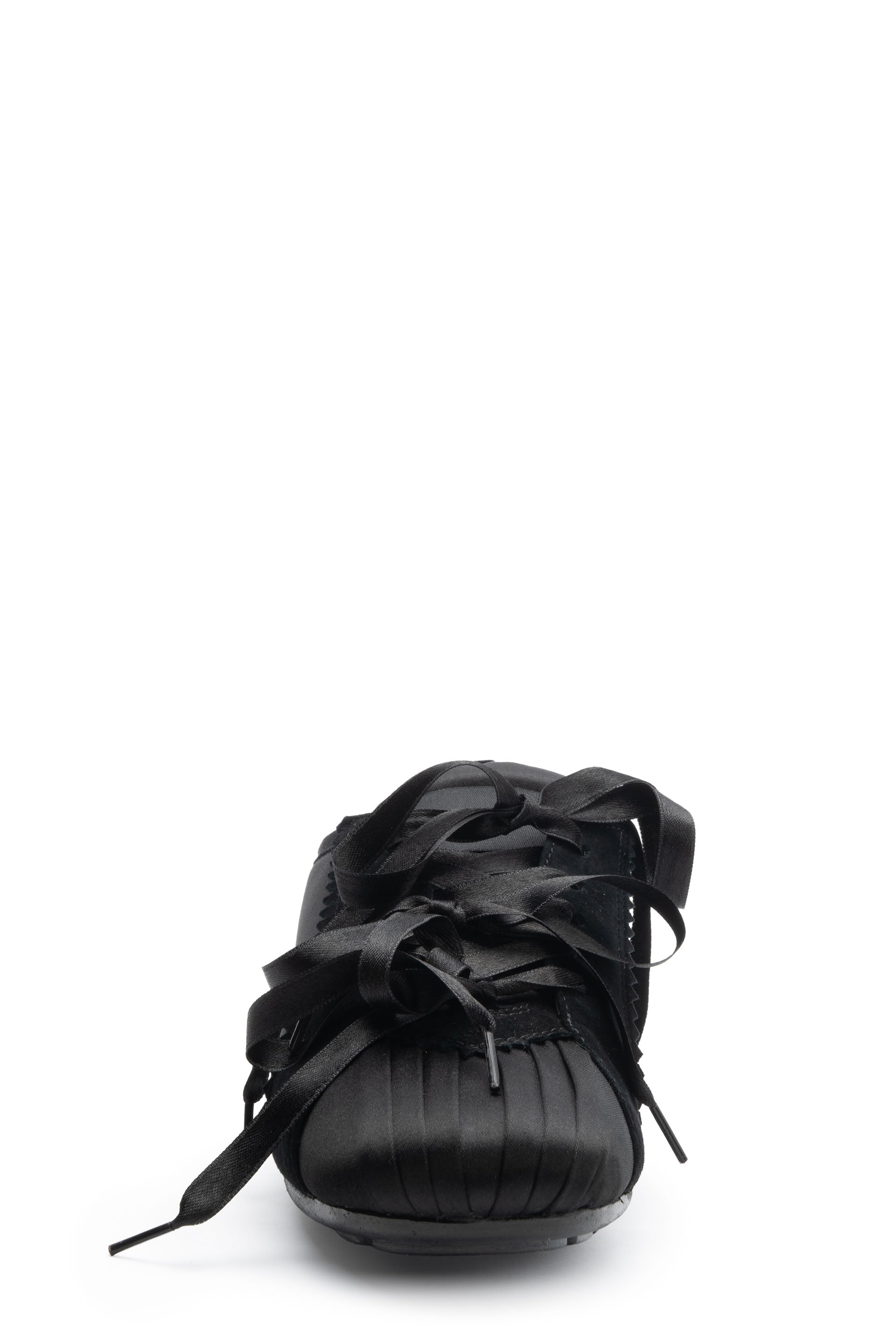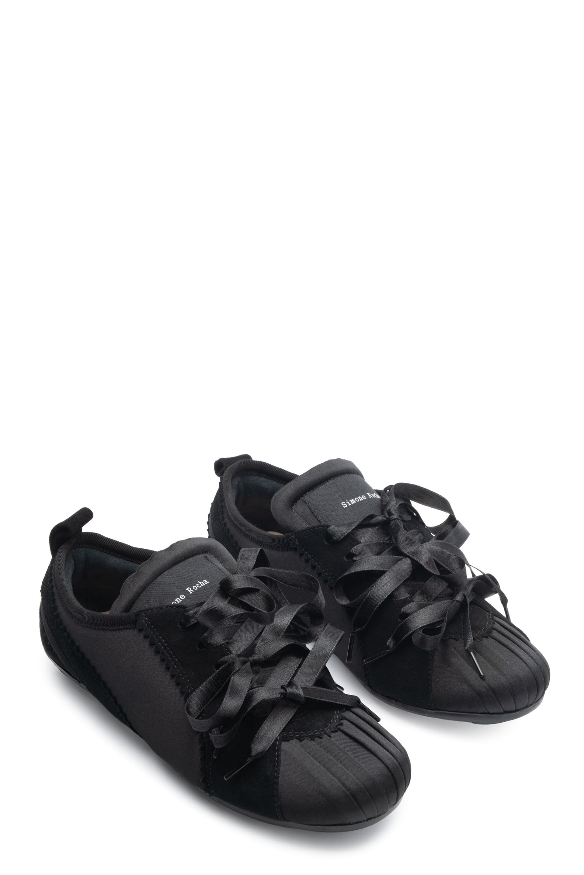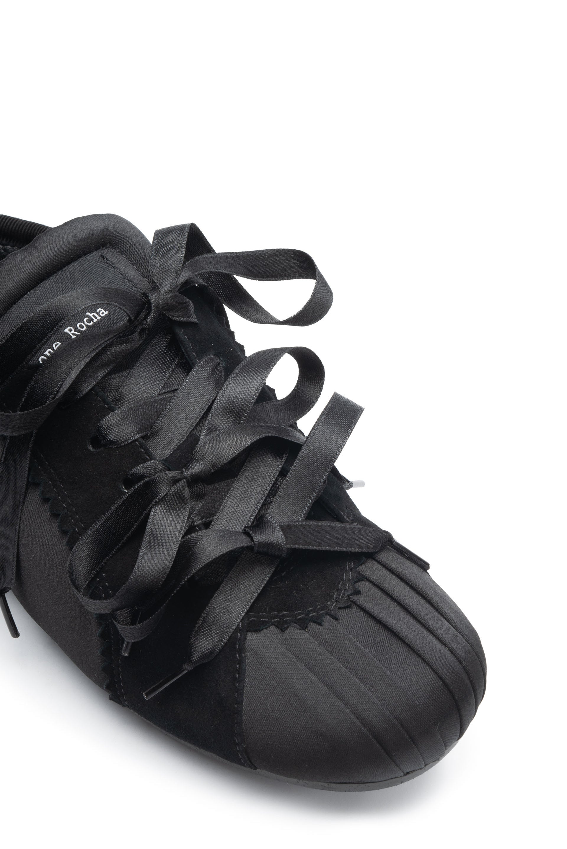 Low-top satin and leather sneakers. Elastic criss-cross strap. Satin bow ribbon lacing. Branded tongue detail. Rubber trek sole.