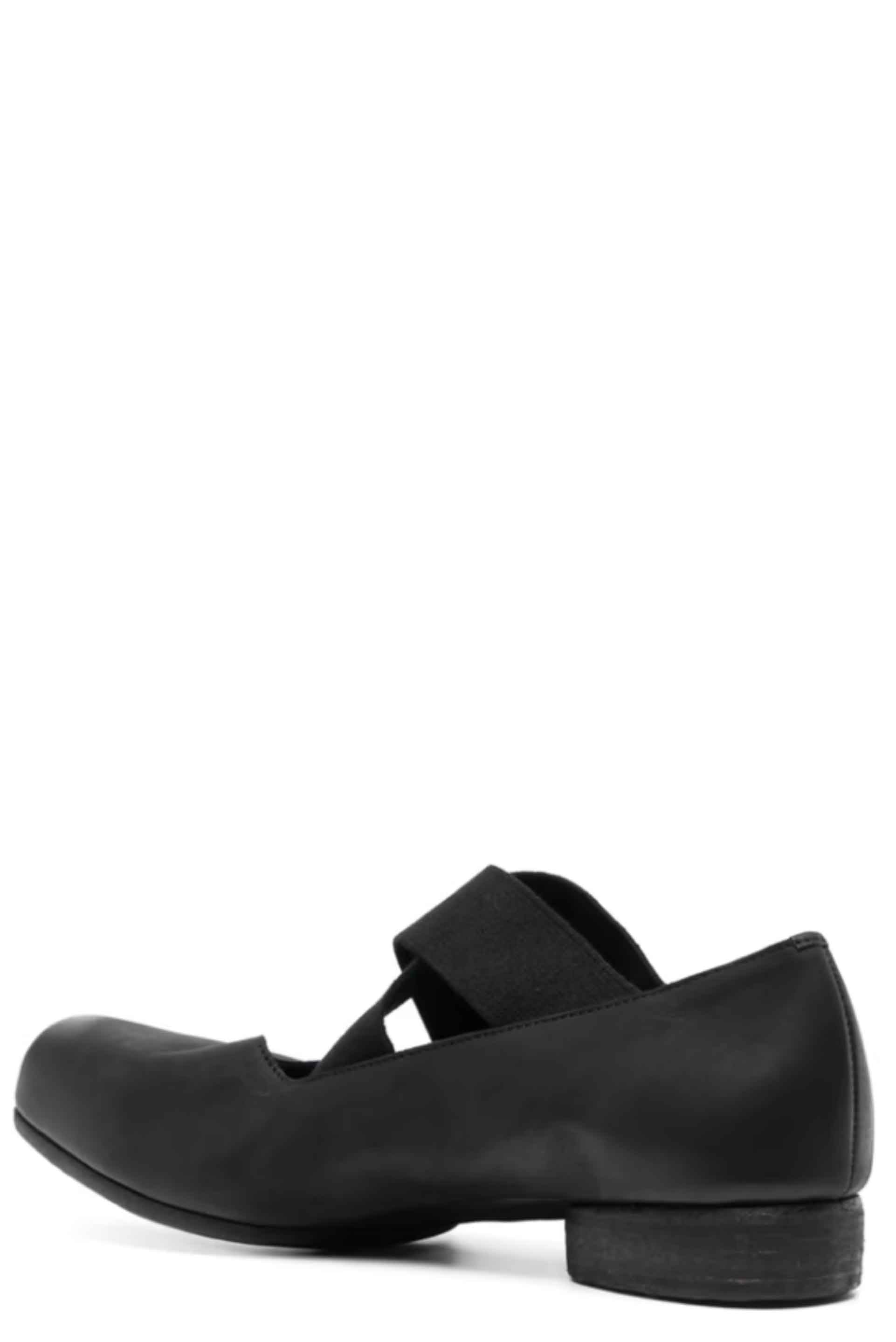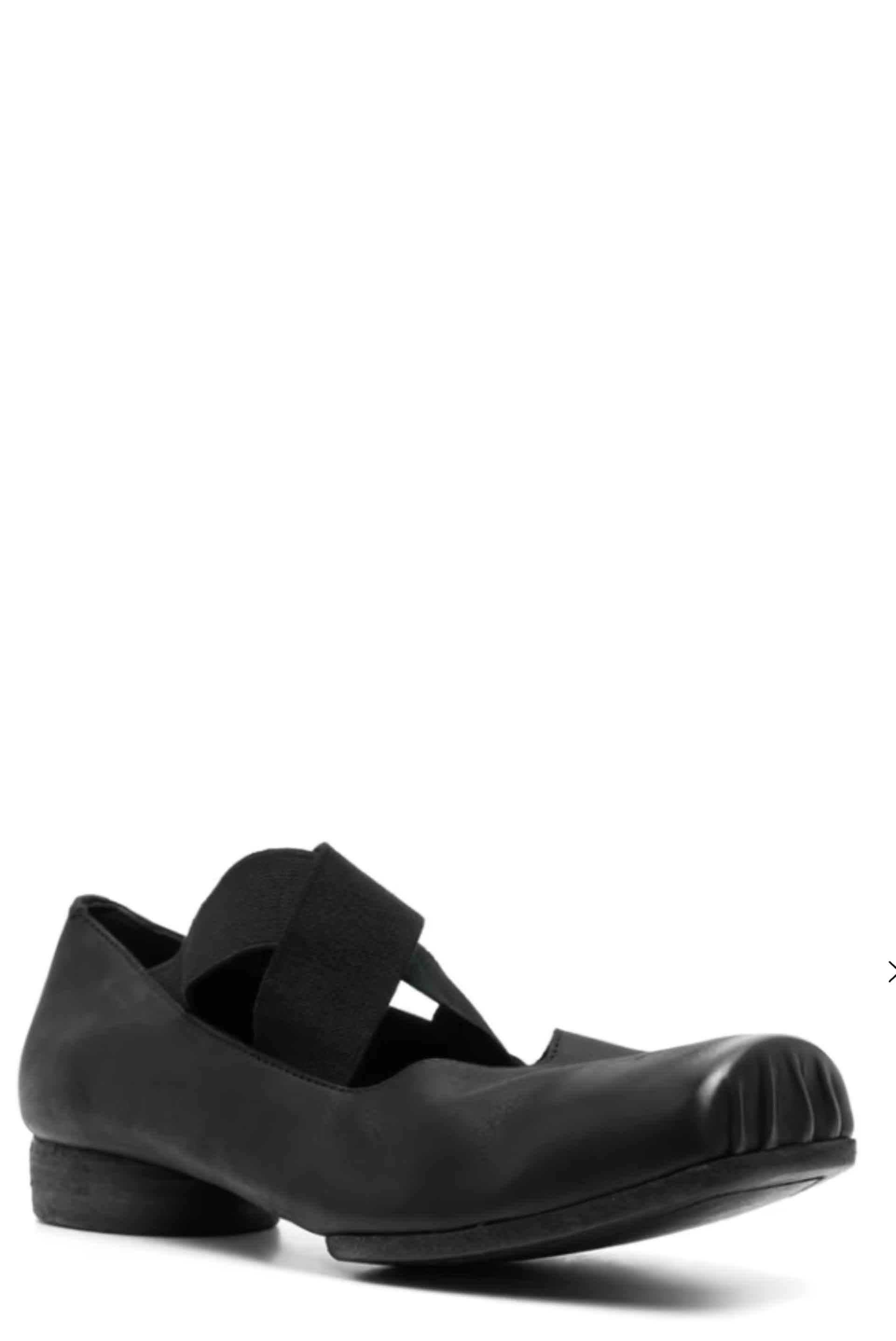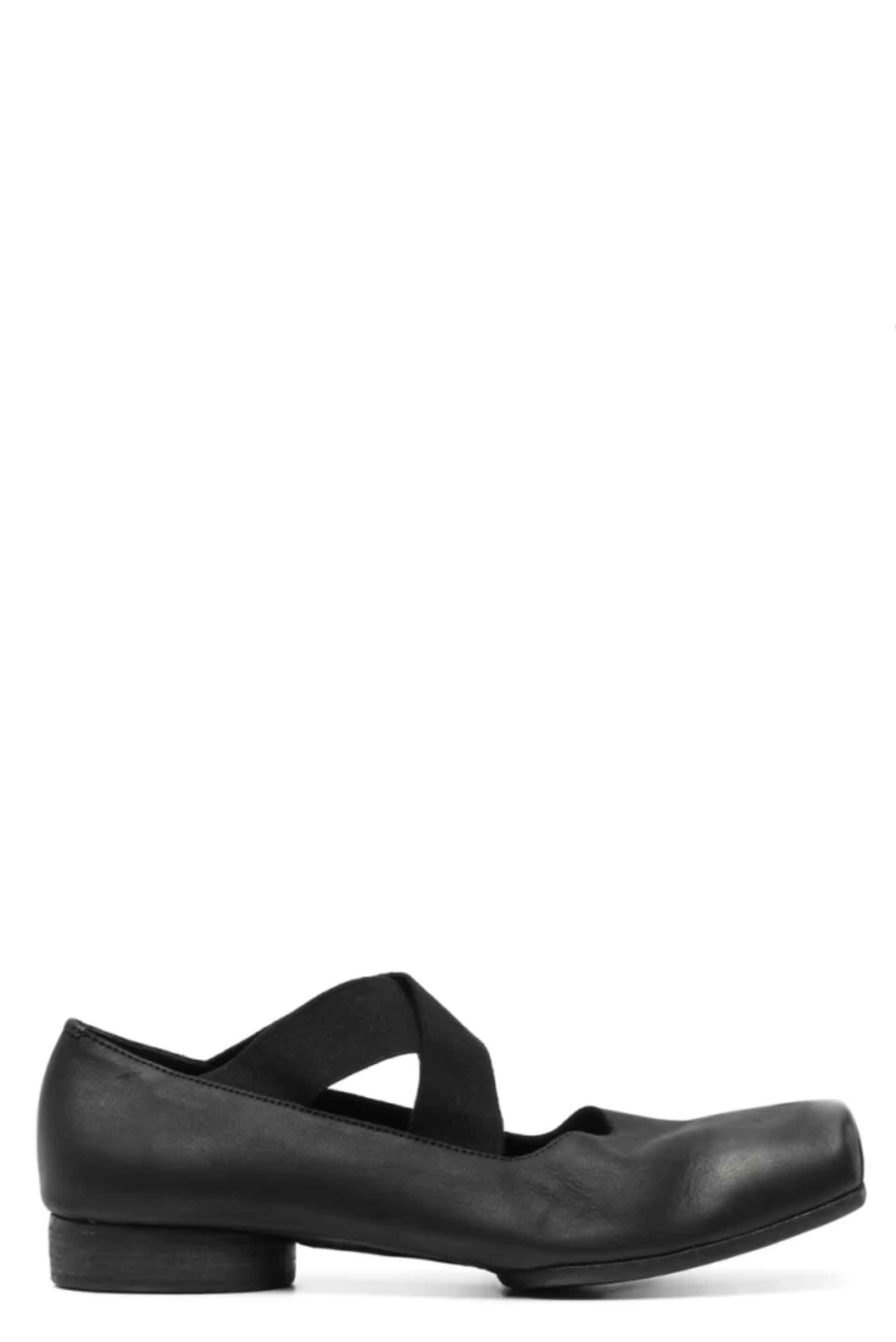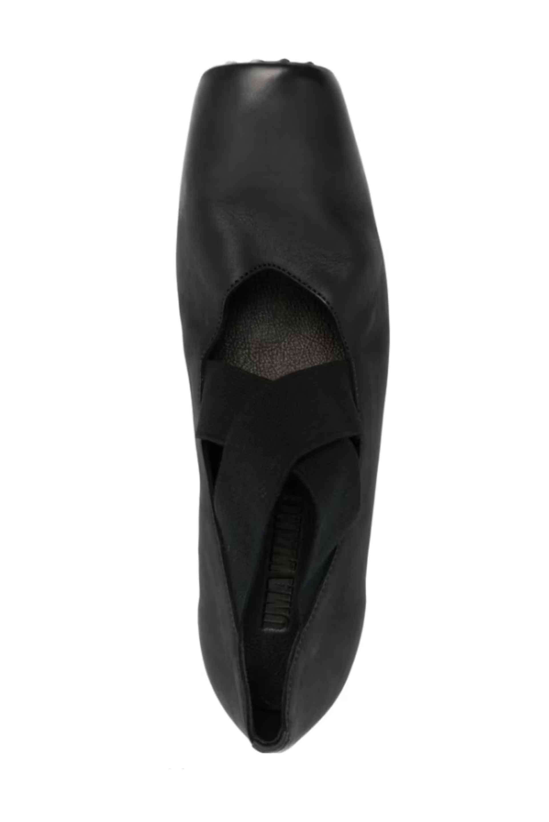 UMA WANG Ballet Shoes Black. Low heel. Elasticated crossed straps at top. Square toe. Signature design.