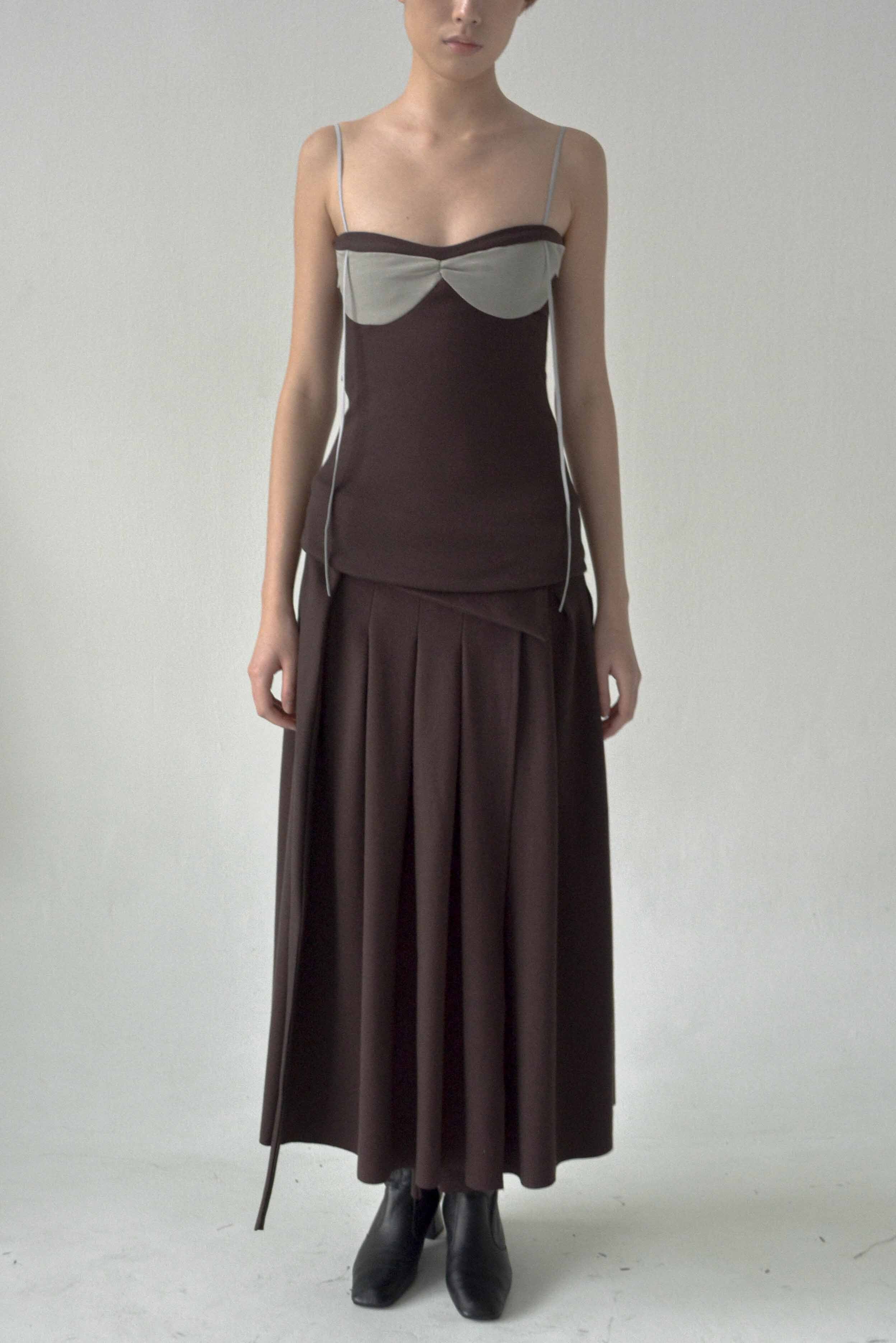 Caro Chia continuously explores intriguing forms that are then brought to life through innovative shapes and pattern cutting techniques. Caro Chia is known for her experimental construction combined with making textiles engineered to form sculptural embellishments in subtle colour ways as seen with the Barra Pleated Skirt Brown Grey.