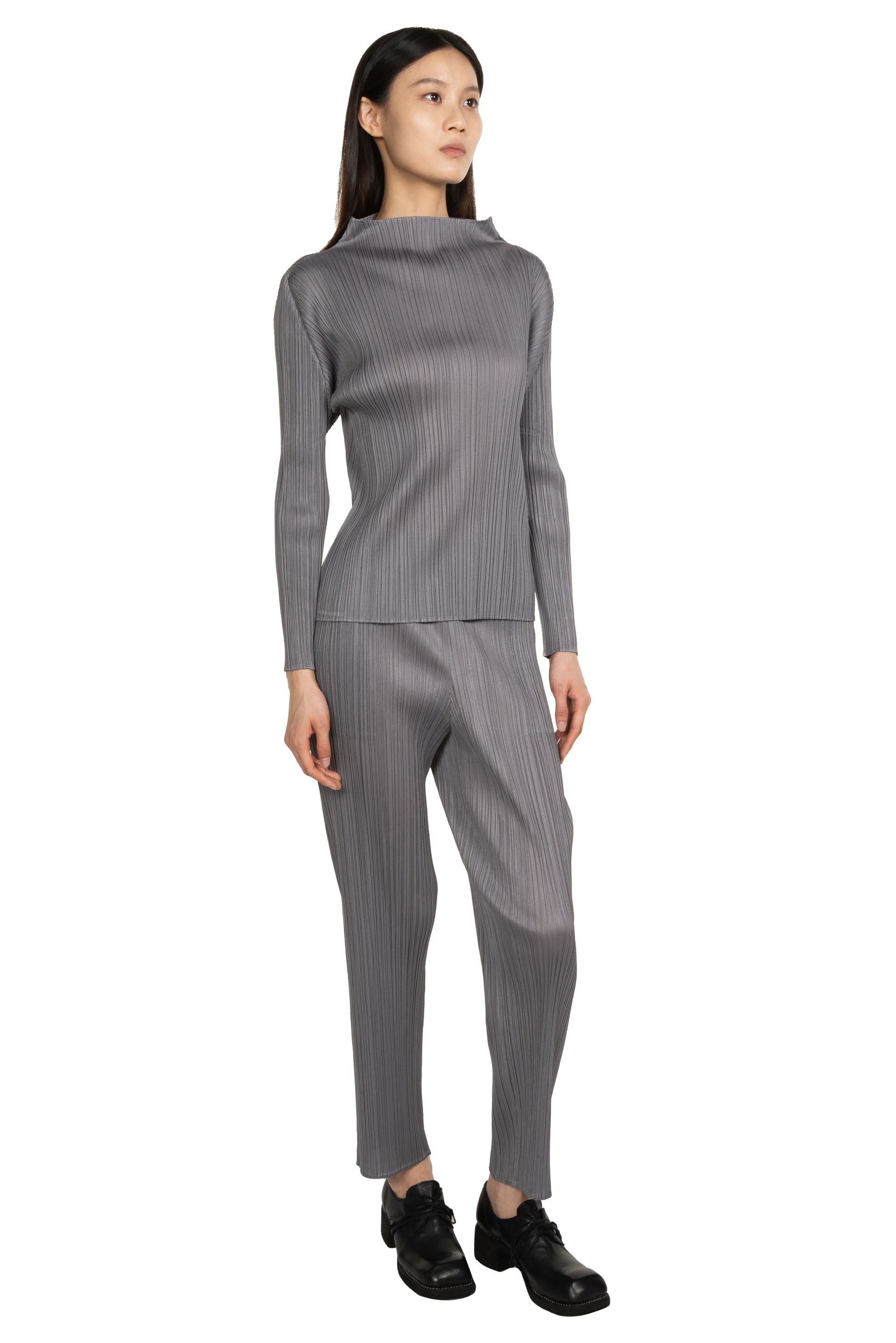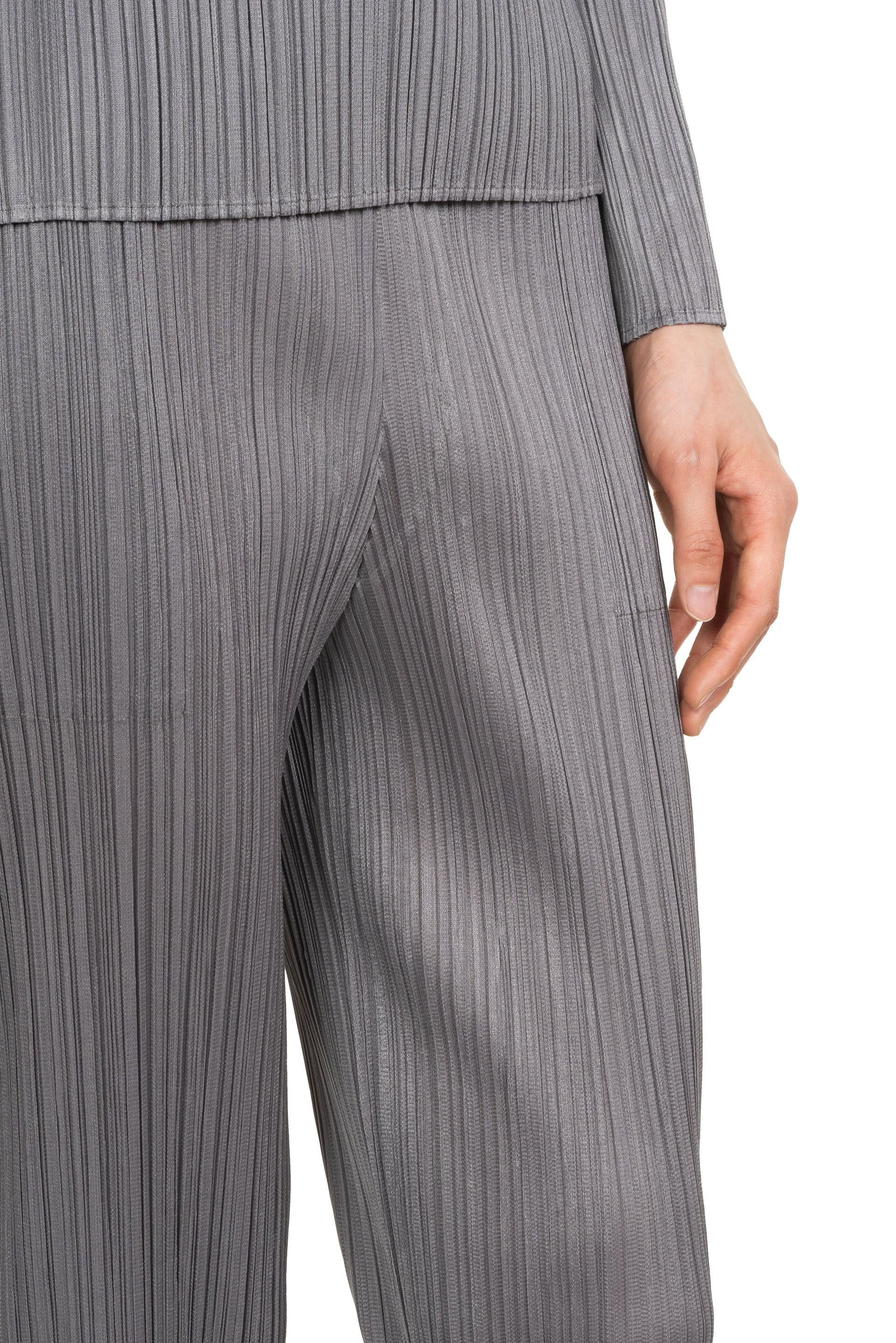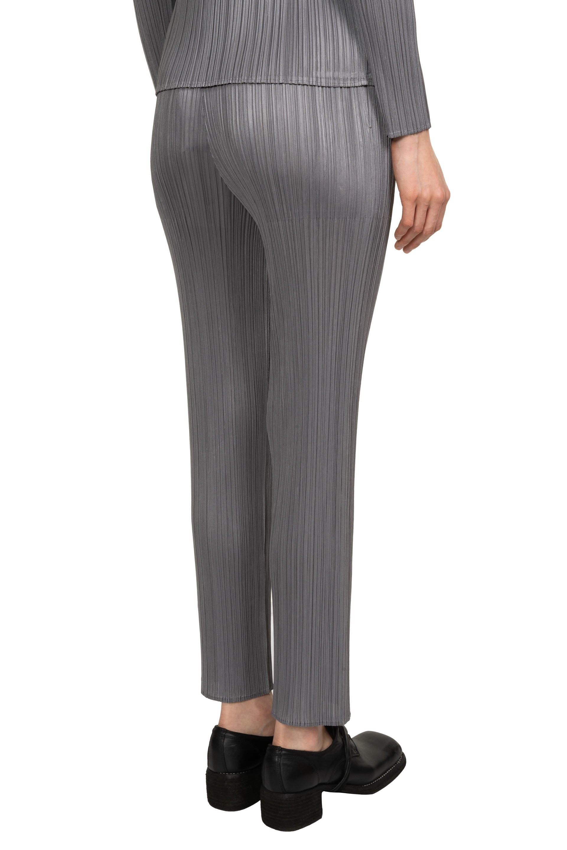 Pleats Please is crafted from a single thread, then creases are added after the clothes have been sewn into shape offering a combination of convenience, comfort and coolness. Pleats Please designs are simple with a strong silhouette as seen with the Basic Trousers Grey.