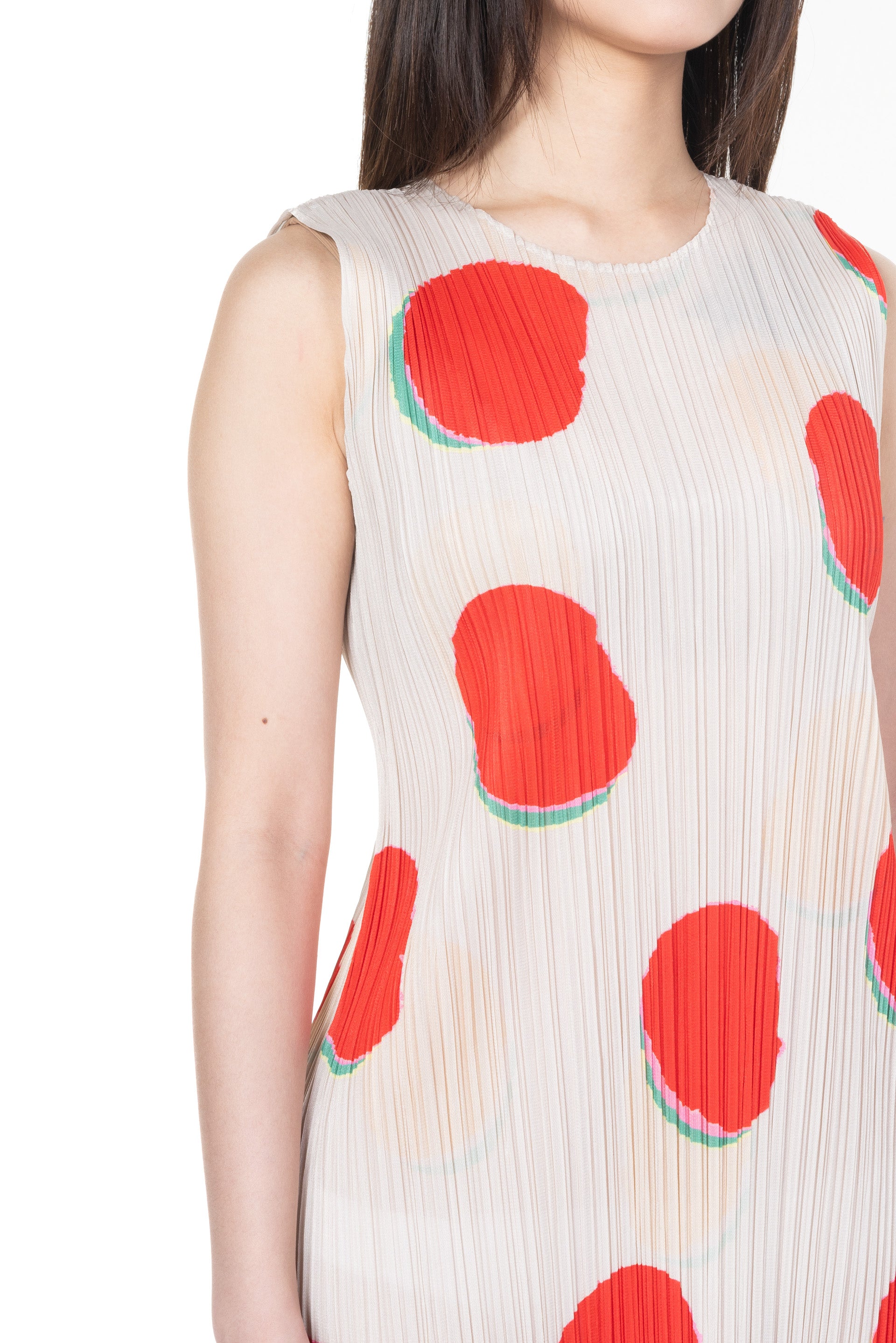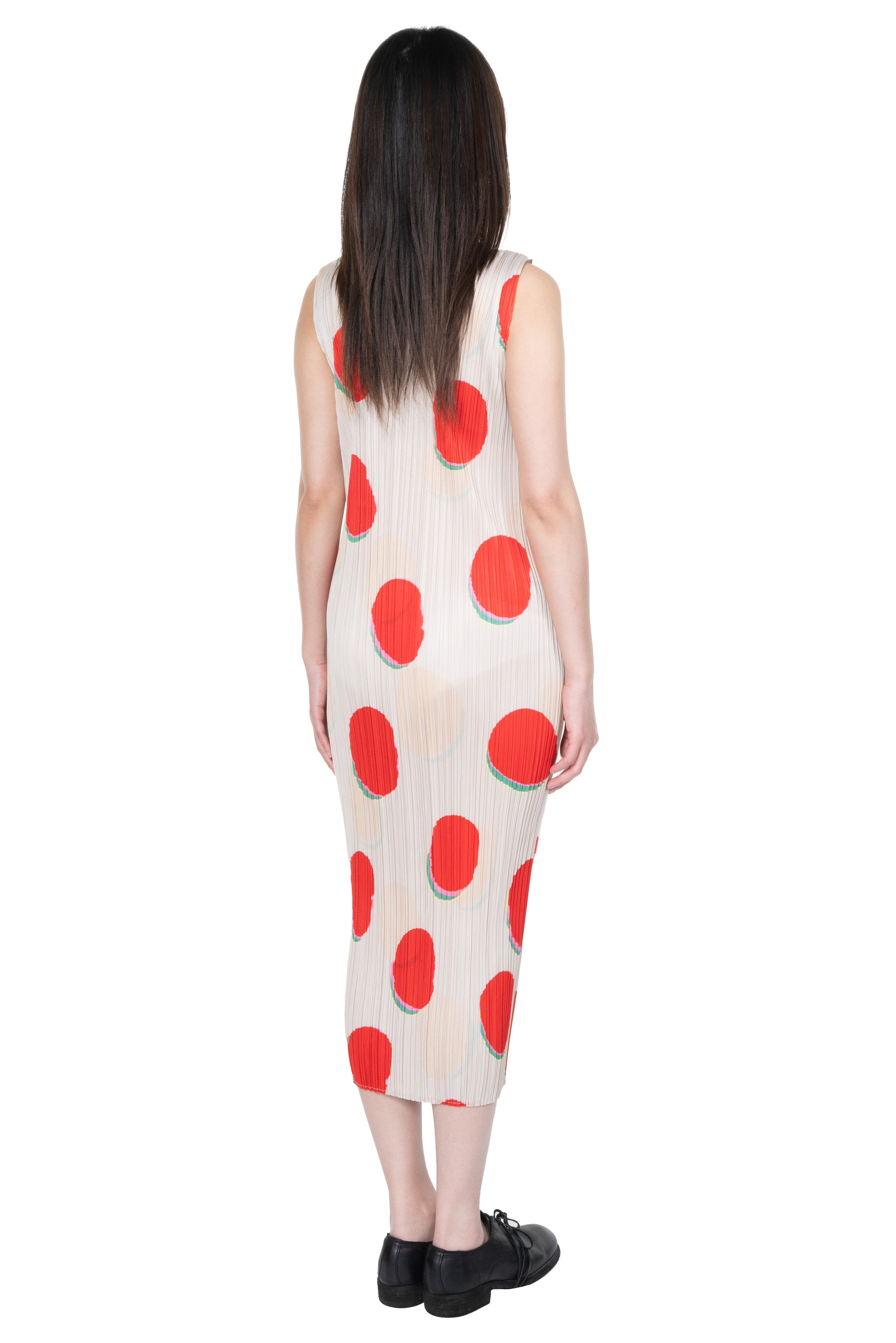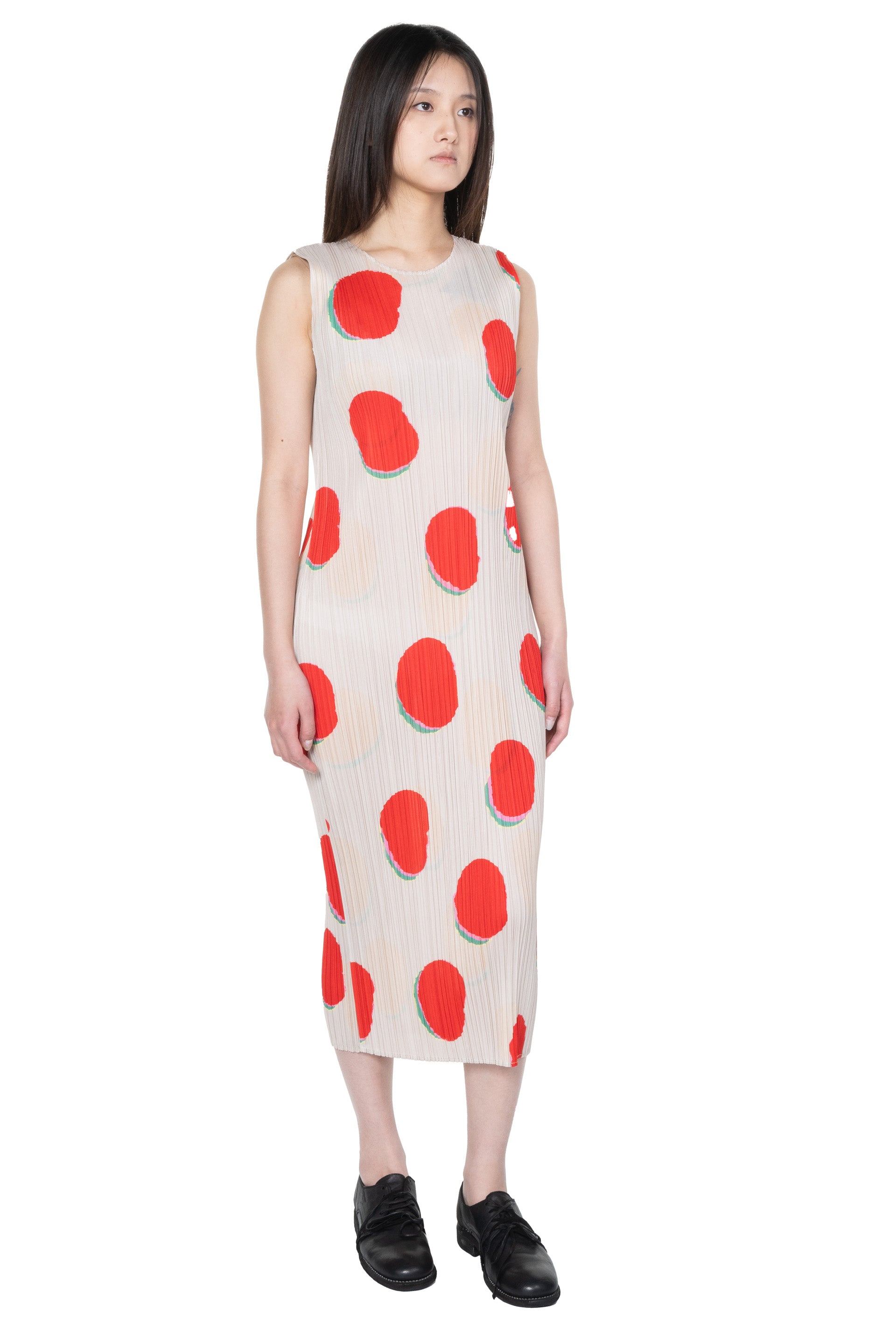 Sleeveless. Red pleated column dress. Scoop neckline. "BEAN DOTS" graphic with vibrant shadows.