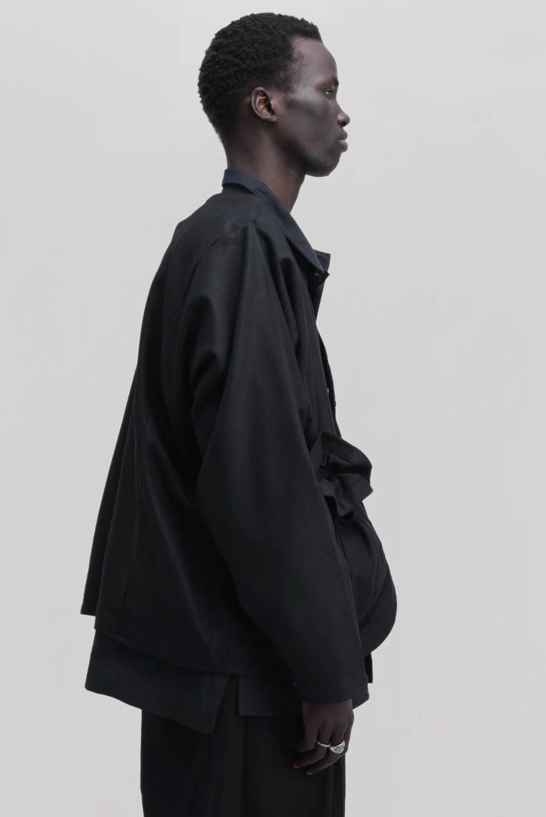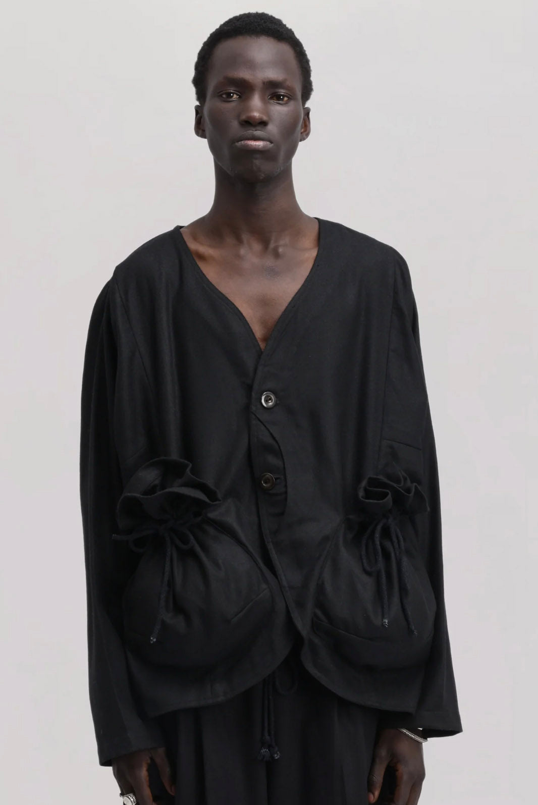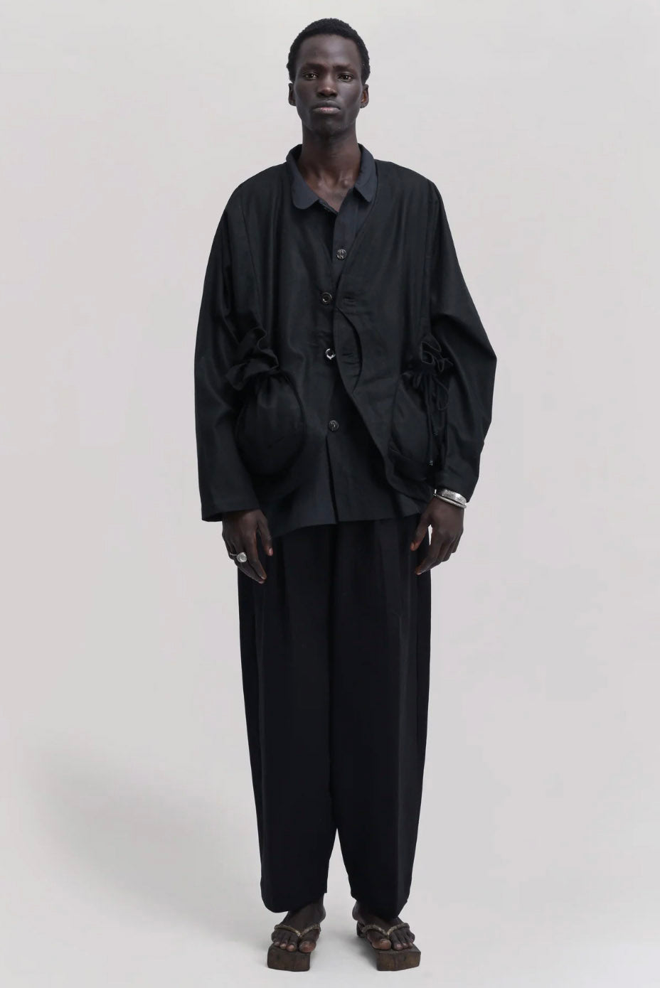 Crafted from organic power loom cotton, in a jet-black tone. Each jacket is finished with natural shell buttons, adding a refined yet earthy detail.