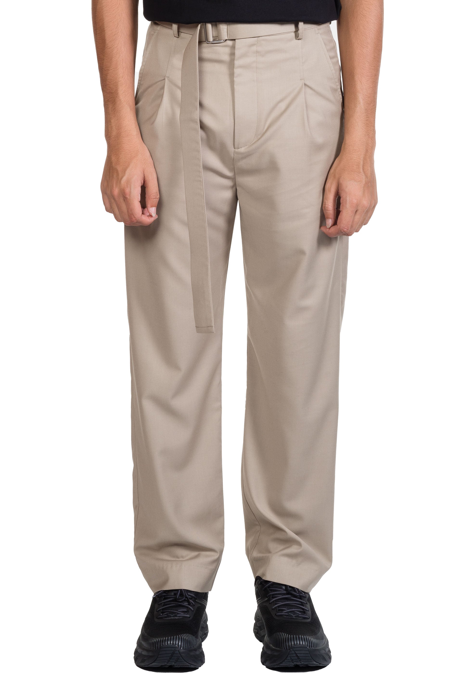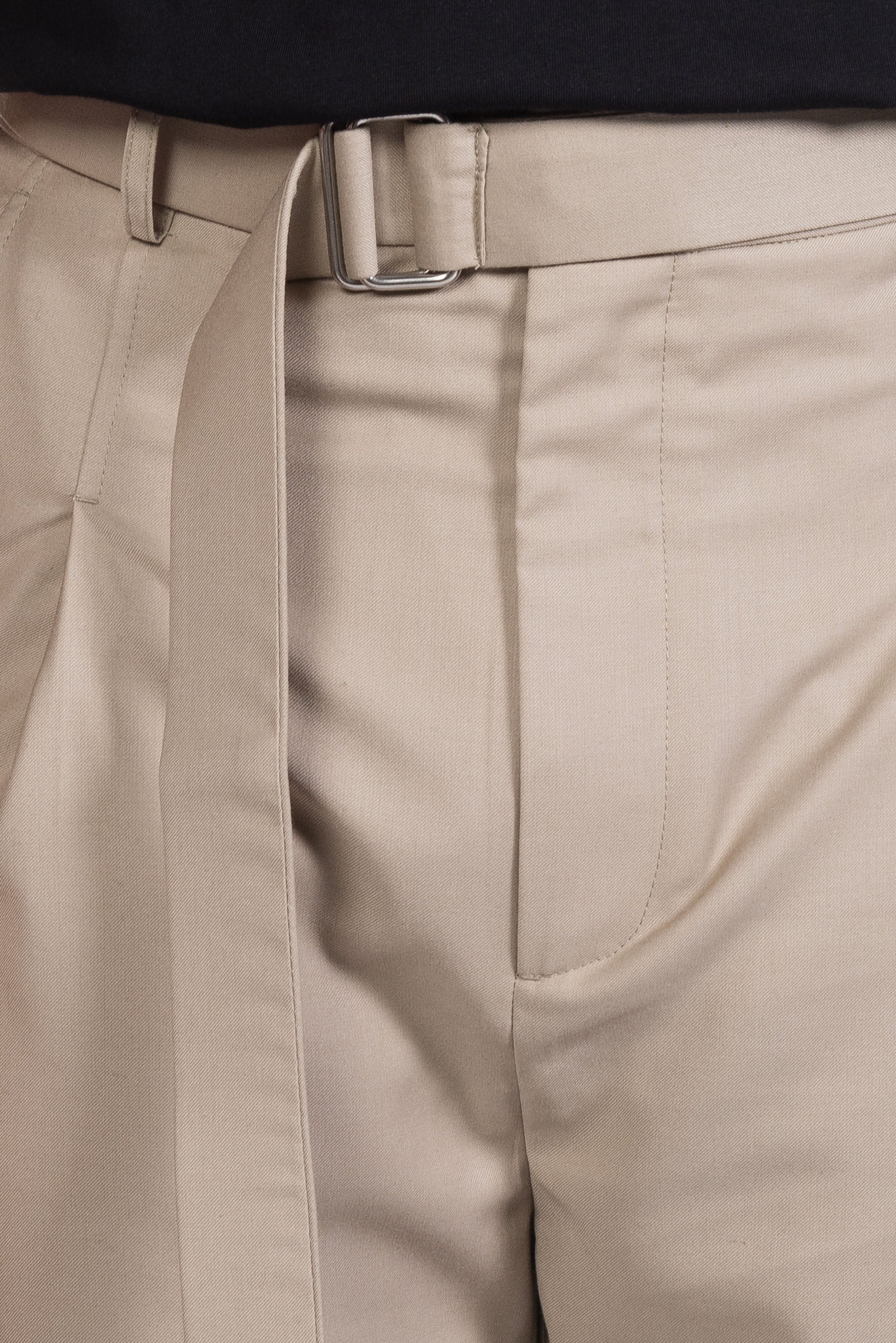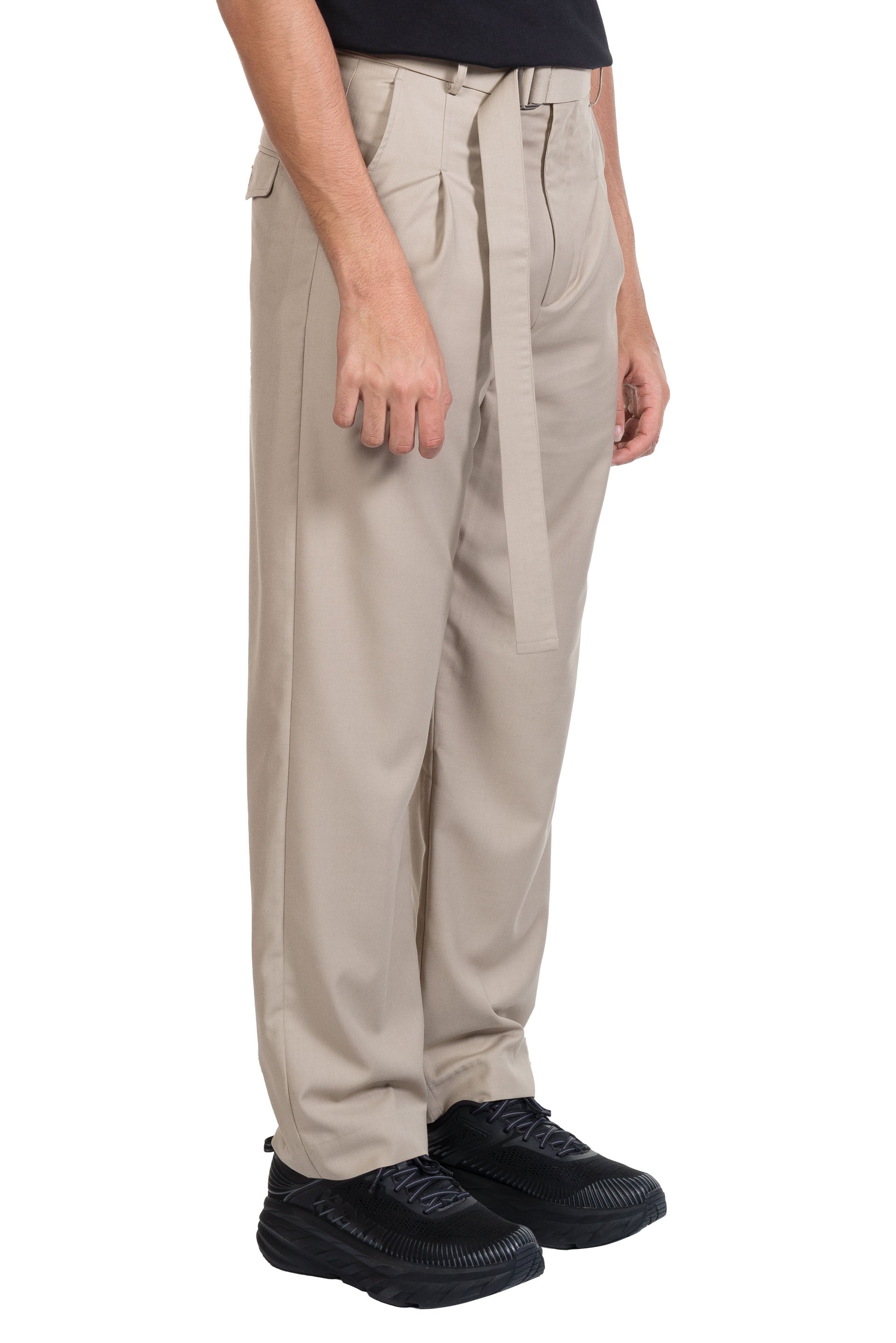 Button closure at waist. Separate belt at waist. Two pockets at side. Two pockets at back.