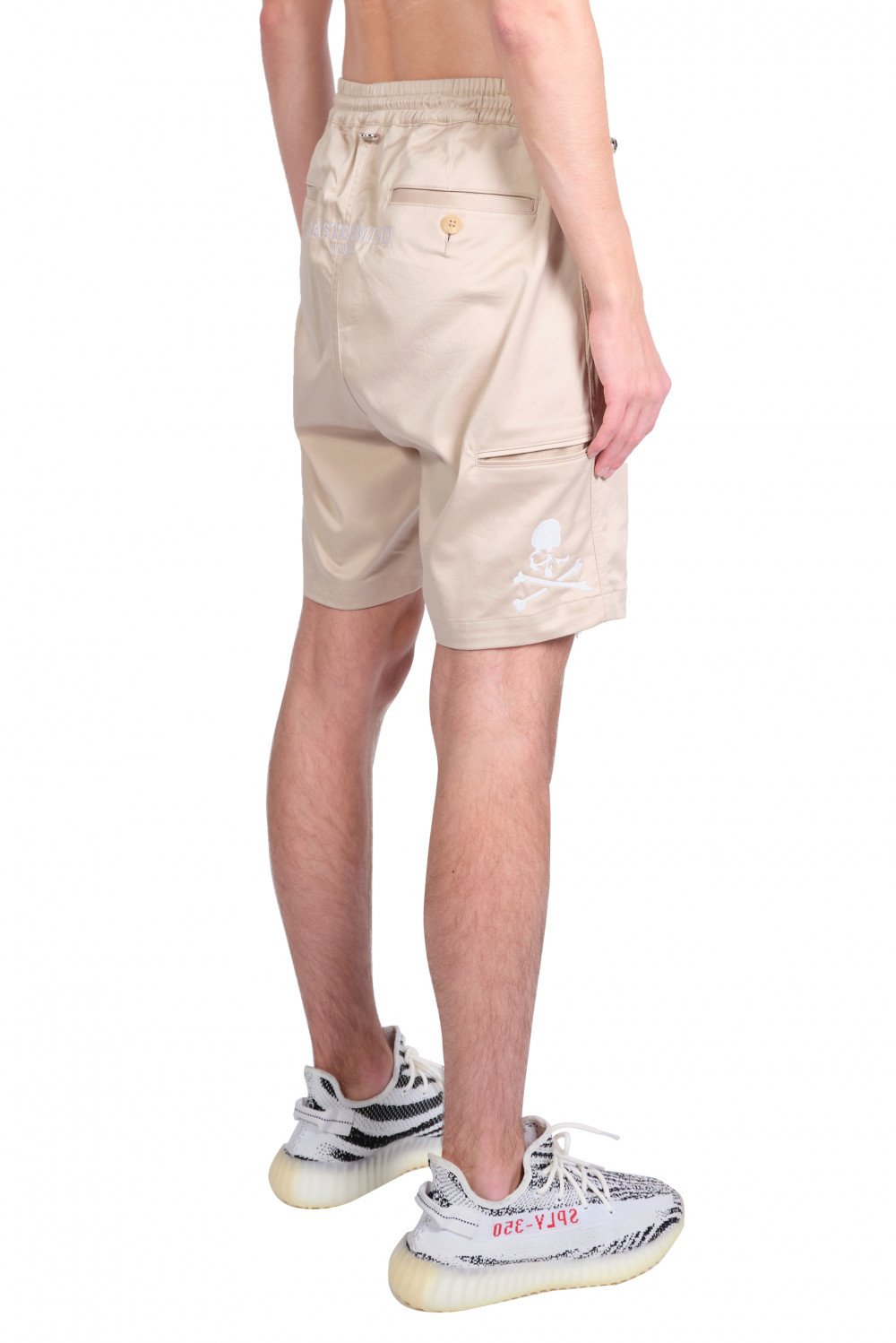 Elasticised waistband with drawstring. Two slit-in pockets at sides. Buttoned welt pockets at back. Additional pocket on side with embroidered skull and crossbones. Embroidered Mastermind text on back. Metallic D-ring