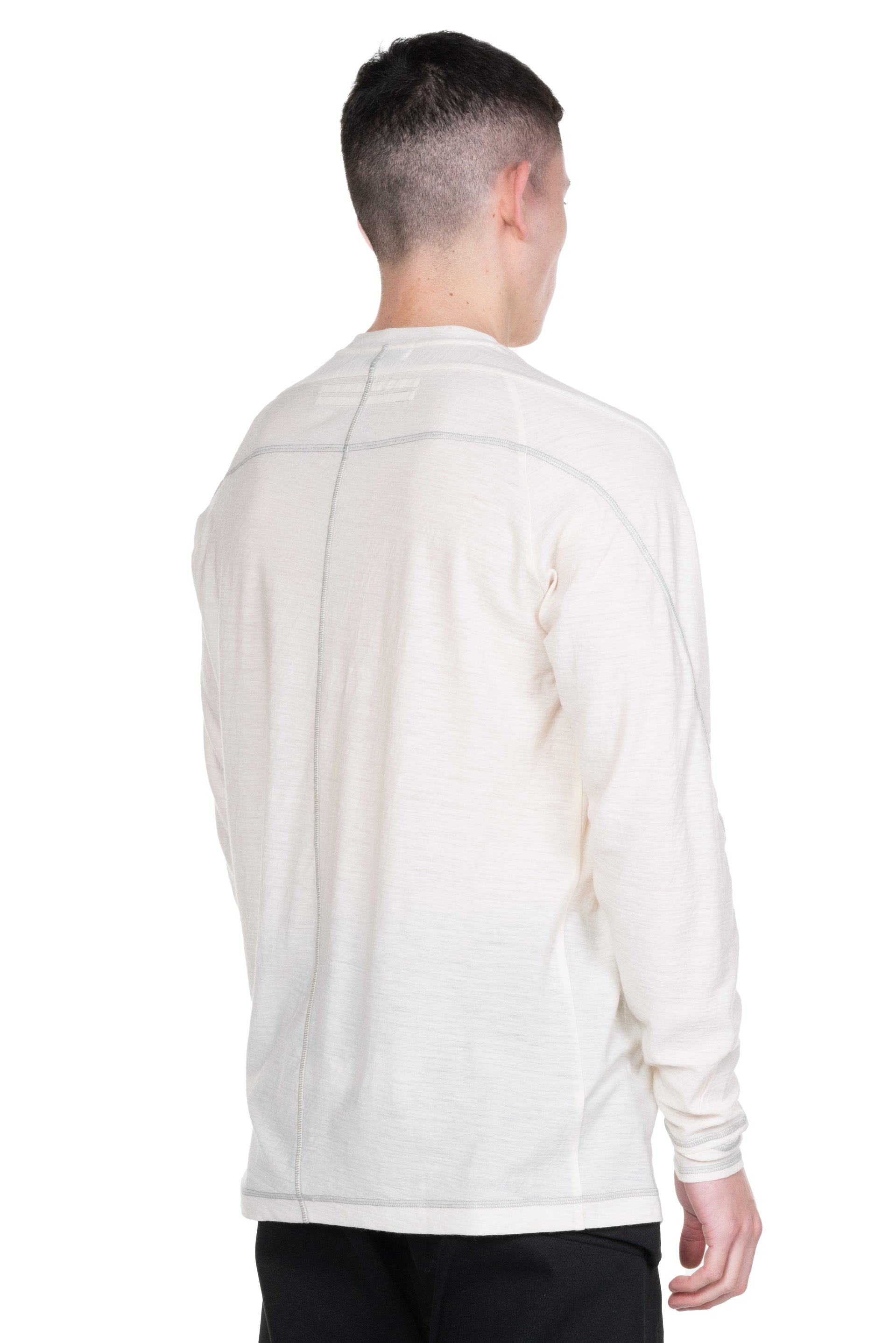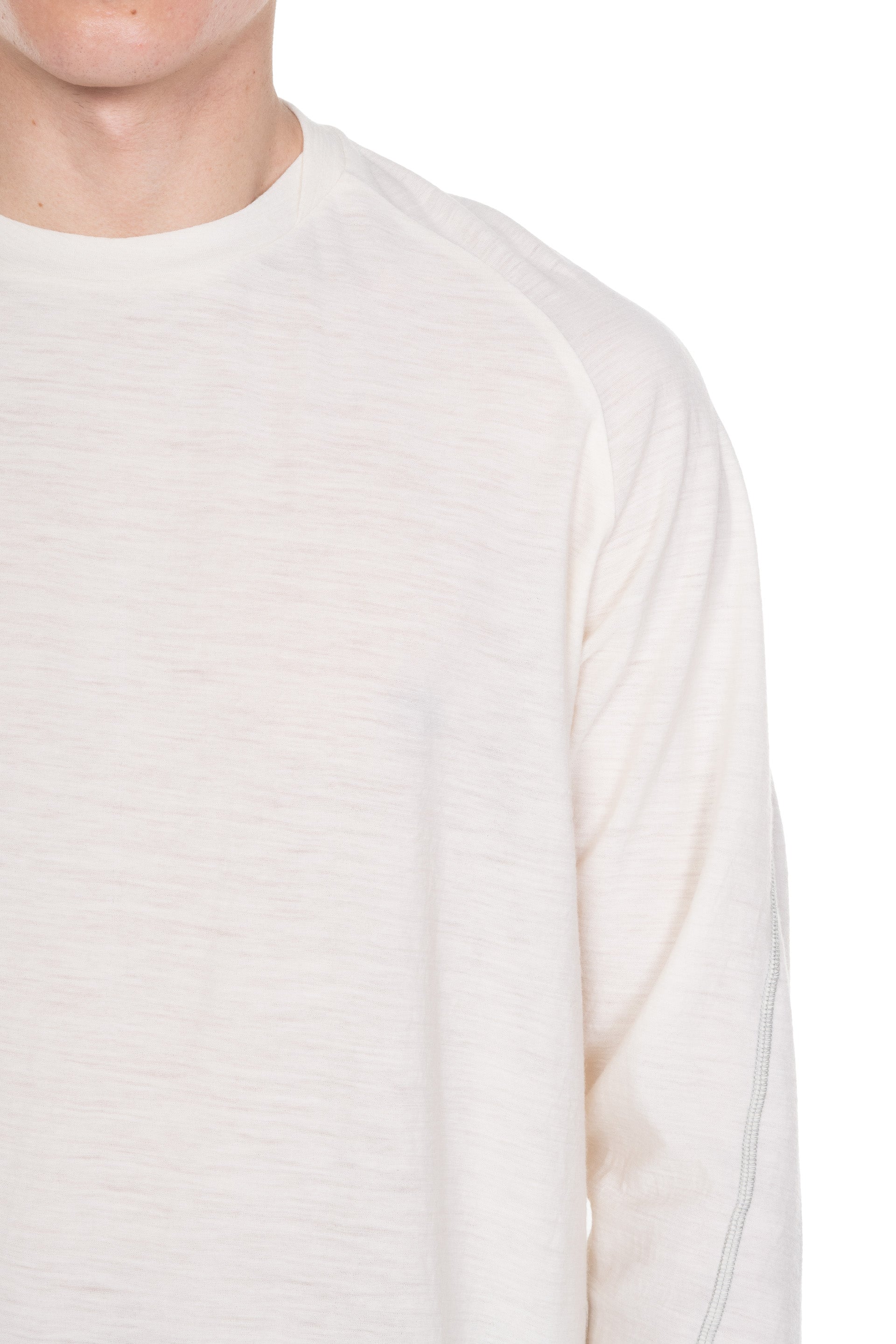 Long sleeves. Thumb hole at cuff. Soft and light wool fabric. Stitching details throughout. Round collar.