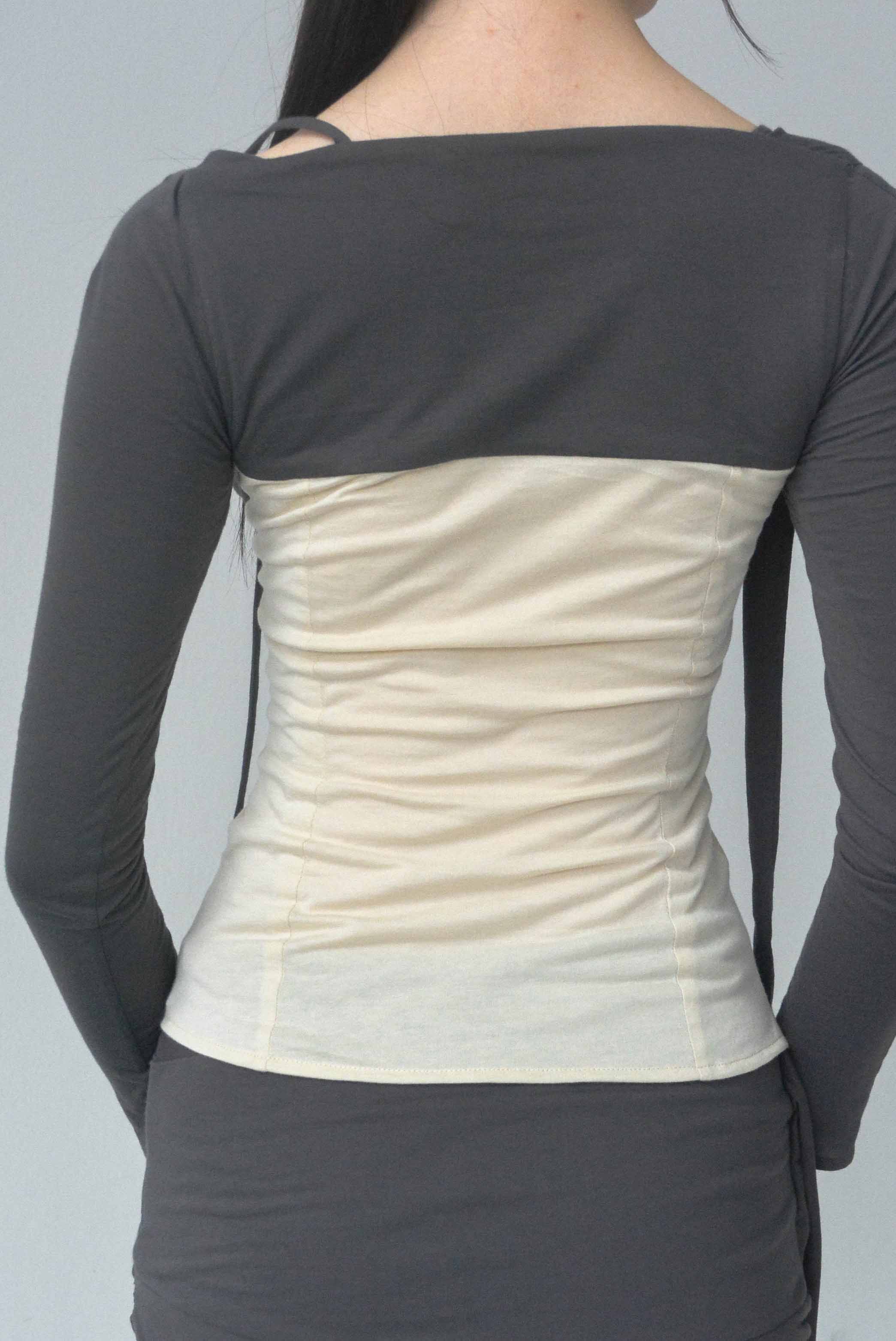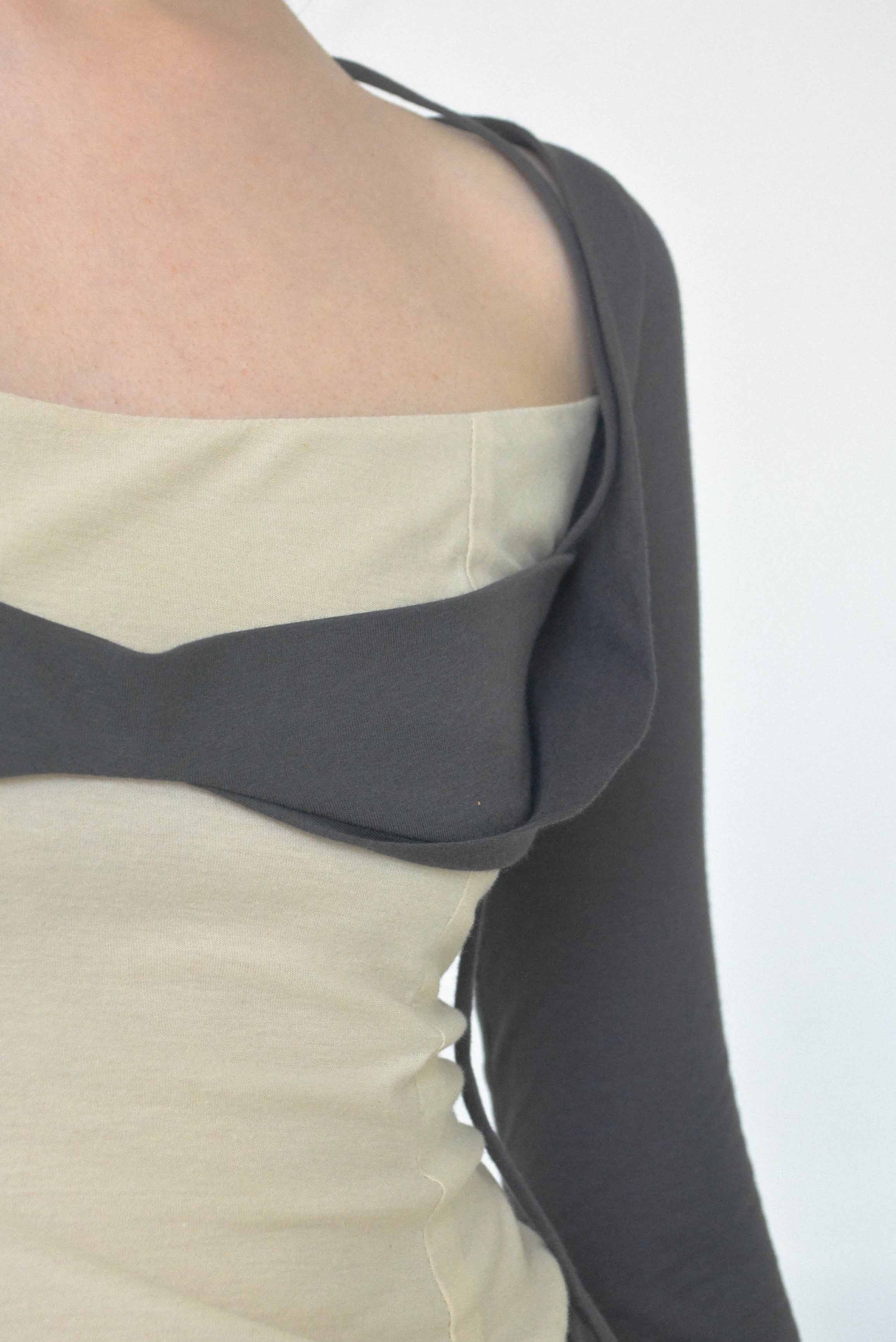 Bianco Long Sleeve Gray Top is a long sleeve top with hanging straps and drape details. Pull-over style. Scoop neck line. Stretchy double-layered cotton jersey for body fitted cut