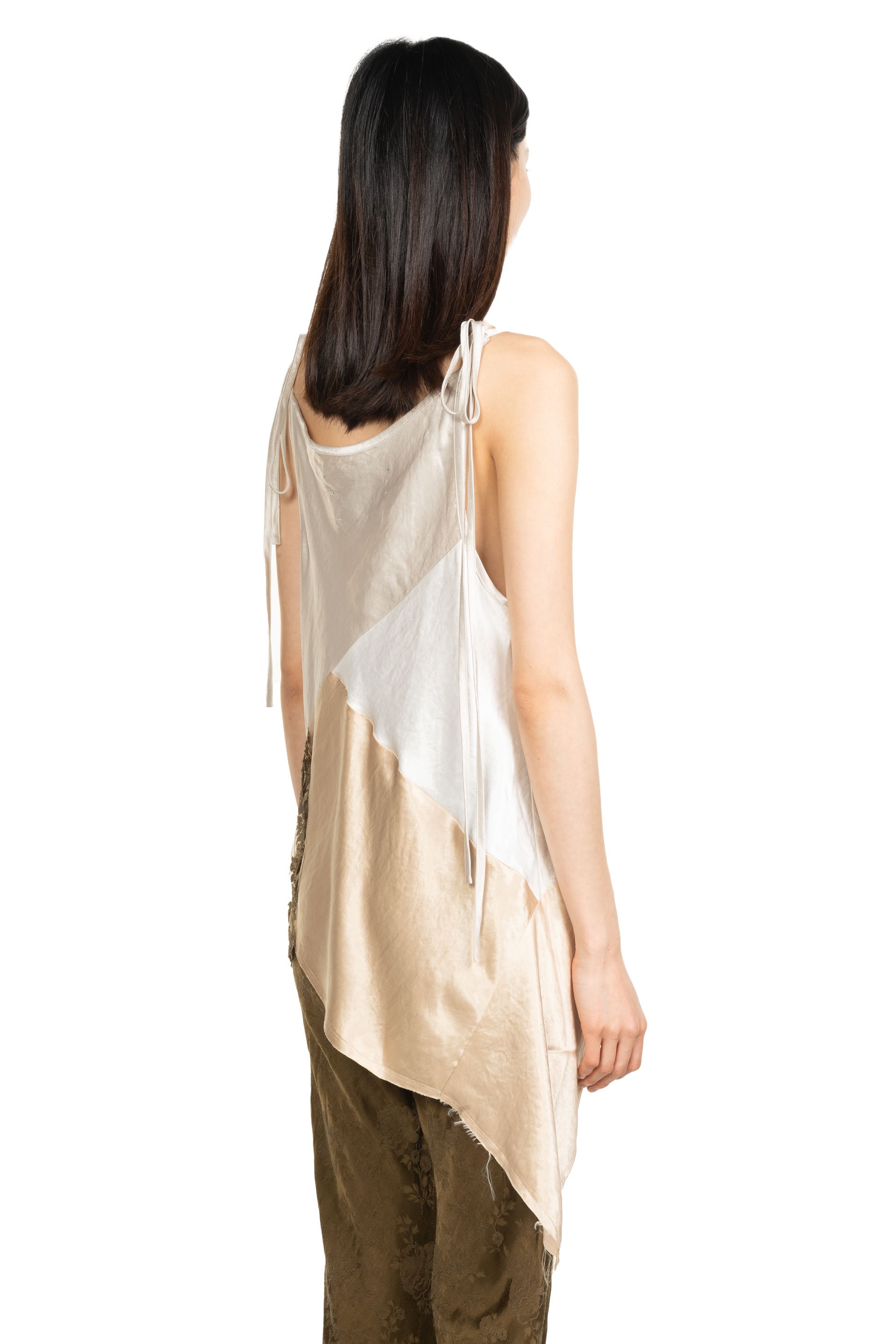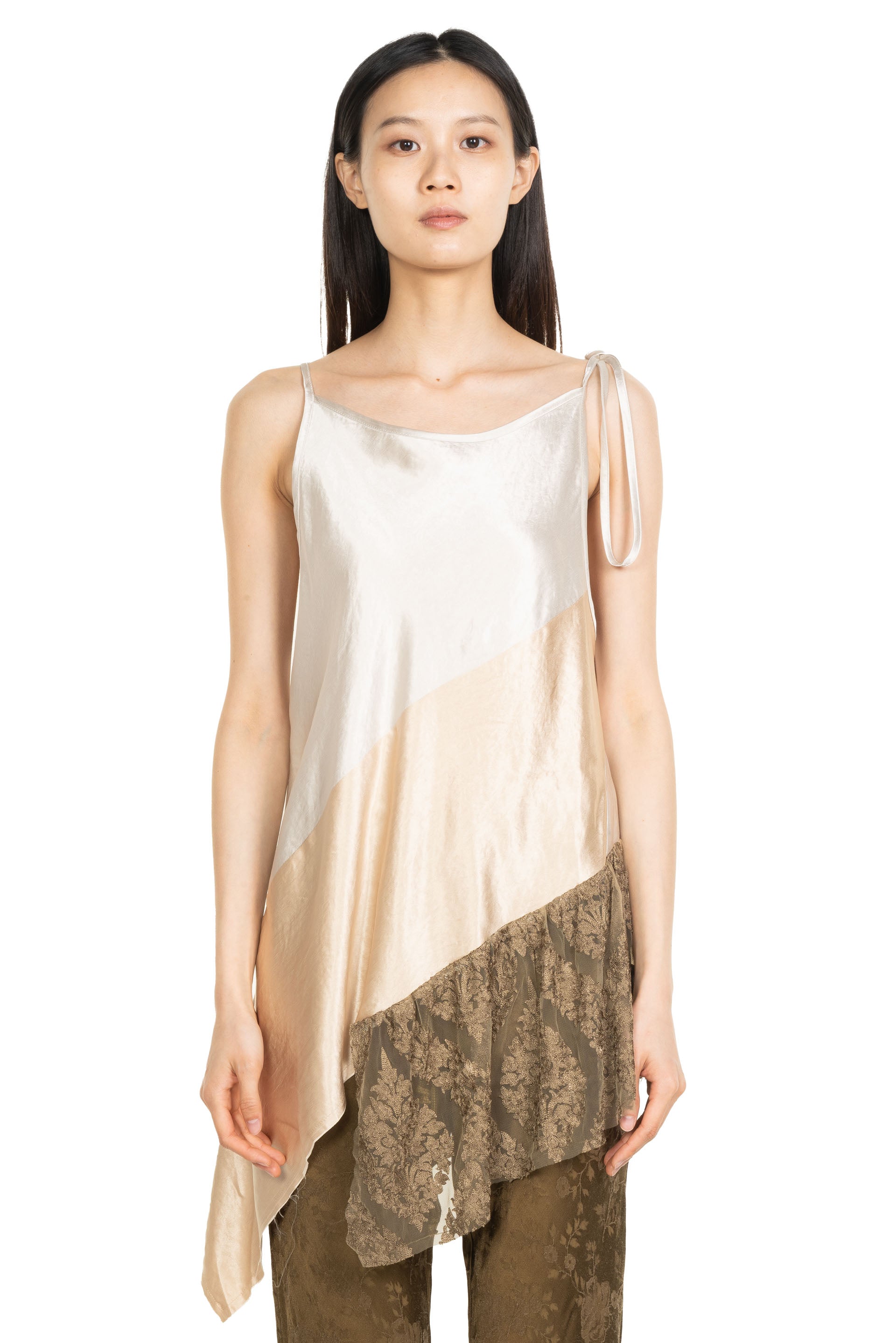 Bias cut sleeveless blouse in a silky acetate. Featuring an asymmetric hemline, cinched waist line and a tonal embroidered viscose embellishment at hem.