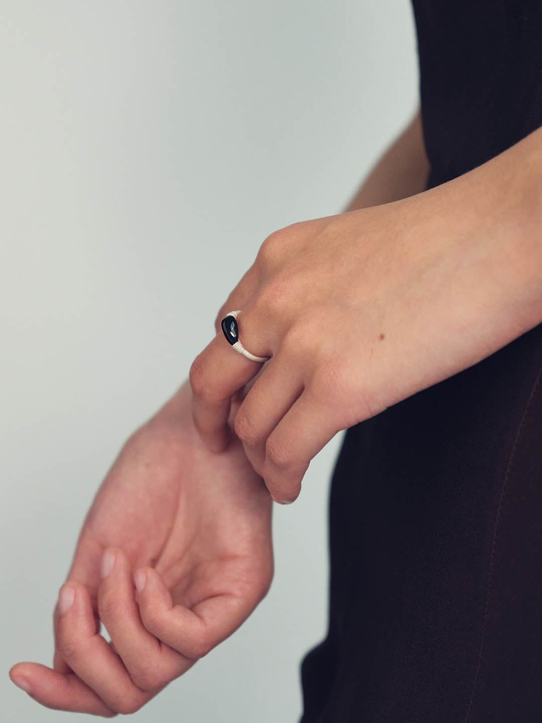 OLIO E ACETO is raw and authentic. It is about the companionship between people, and objects like the matte white surface becoming a blank canvas to be filled by the wearer as seen with the Black Agate Droplet Ring.