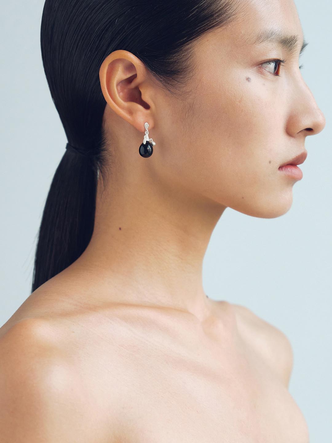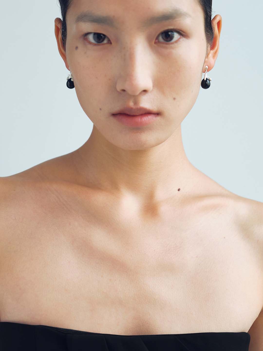 OLIO E ACETO is raw and authentic. It is about the companionship between people, and objects like the matte white surface becoming a blank canvas to be filled by the wearer as seen with the Black Agate Round Earring.