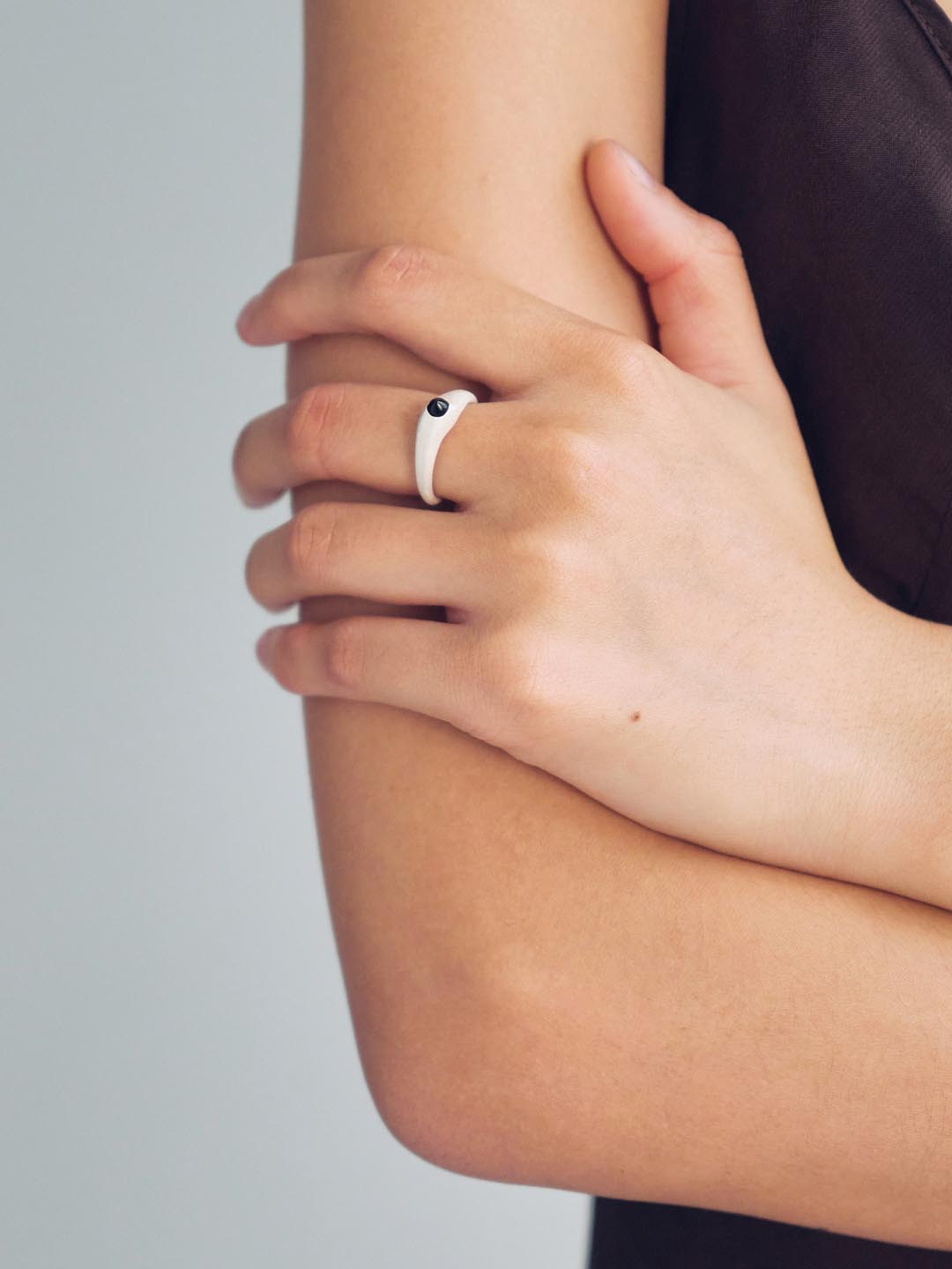 OLIO E ACETO is raw and authentic. It is about the companionship between people, and objects like the matte white surface becoming a blank canvas to be filled by the wearer as seen with the Black Agate Spire Ring.