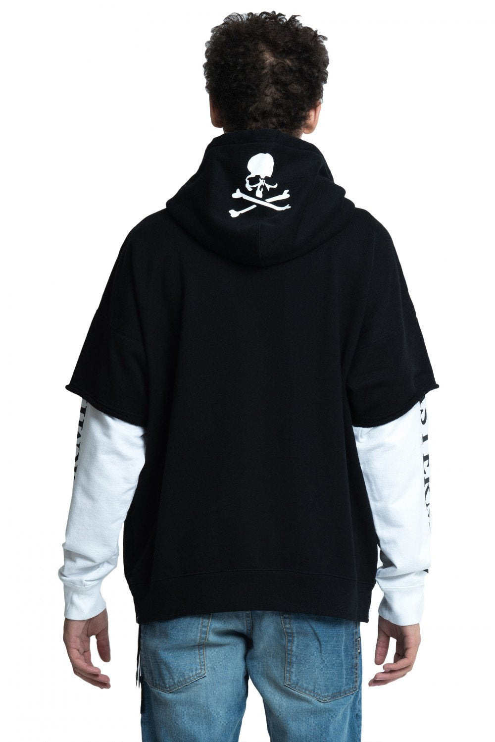Ribbed cuffs and hem. Double layered print sleeves . Skull print on hood. Tonal stitching