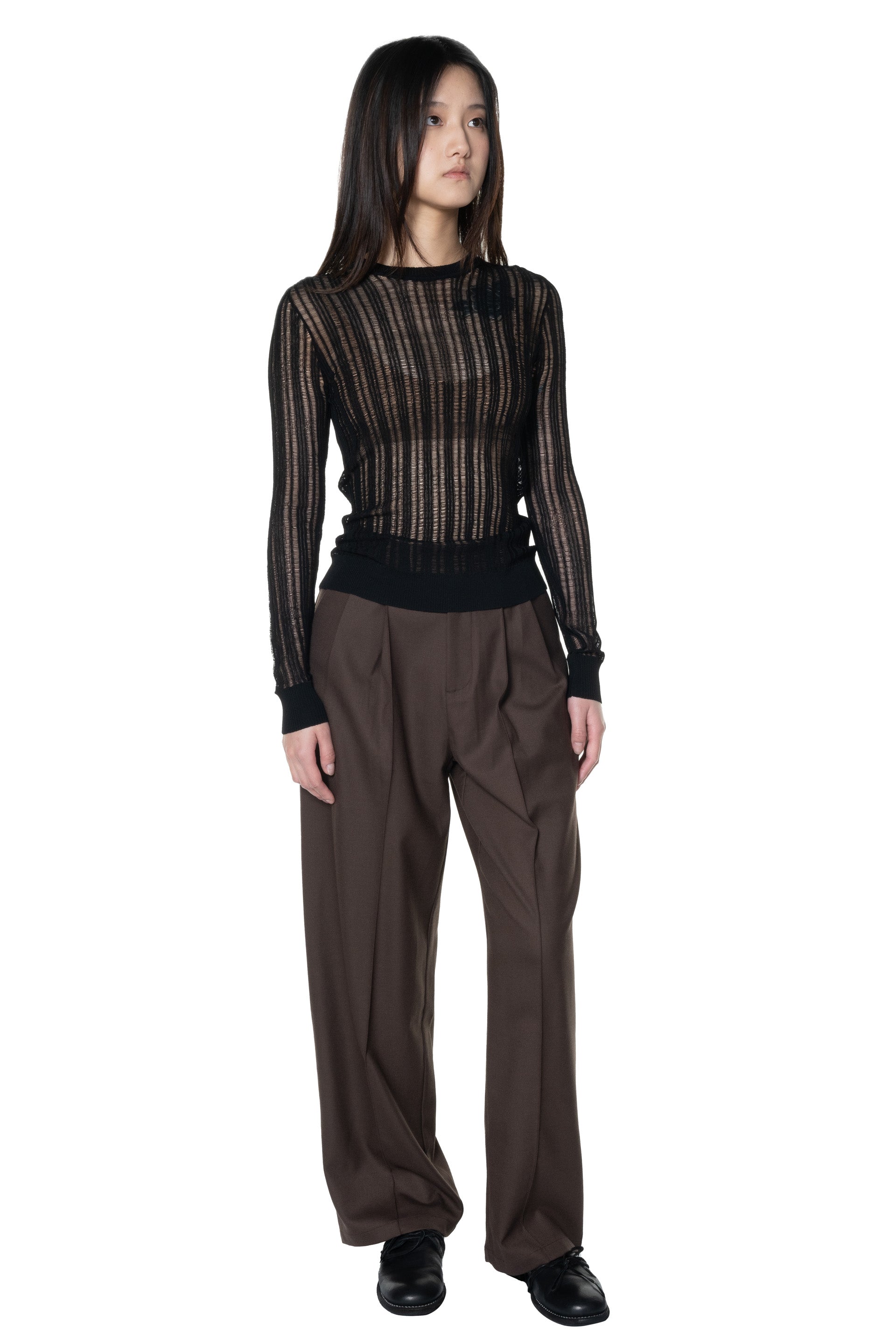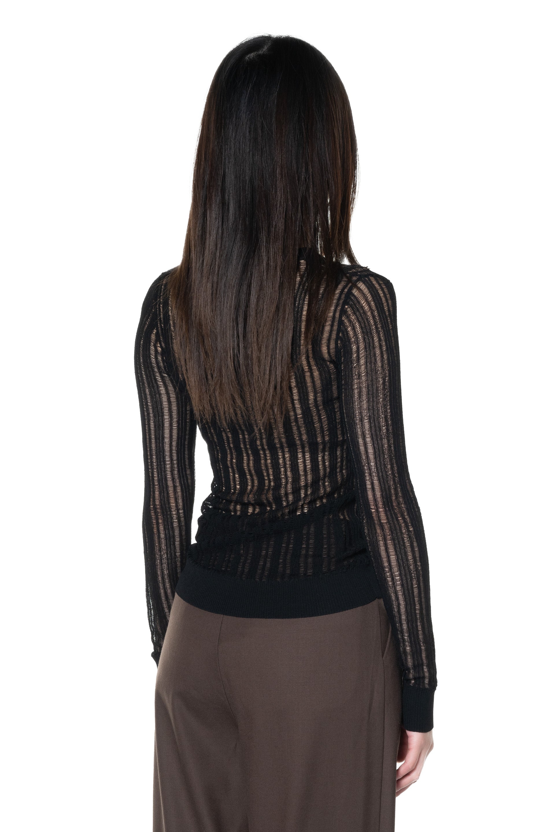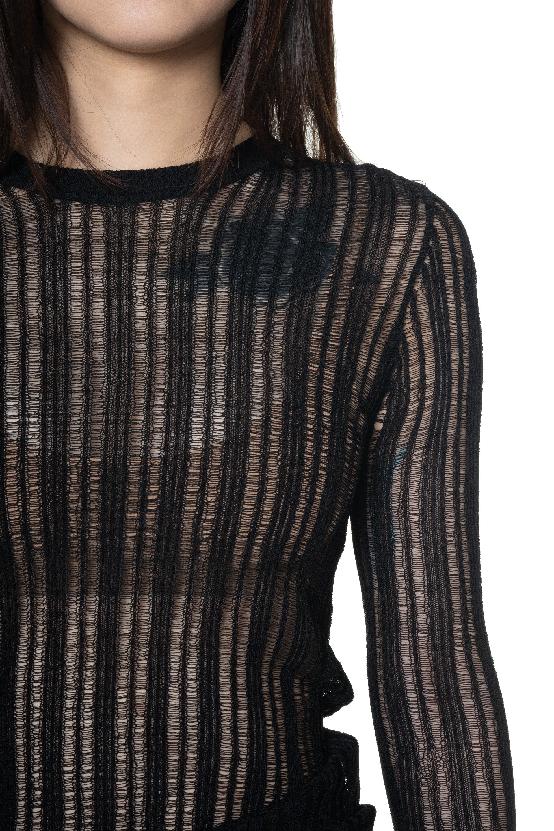Long sleeves. Round neck. Distressed details throughout. Knitted.