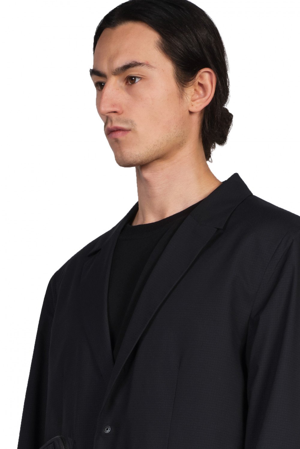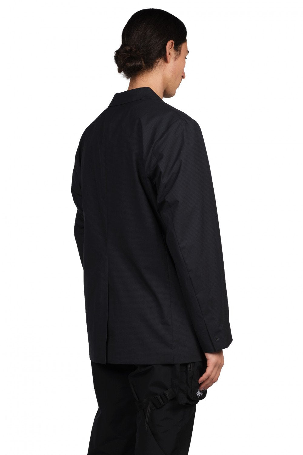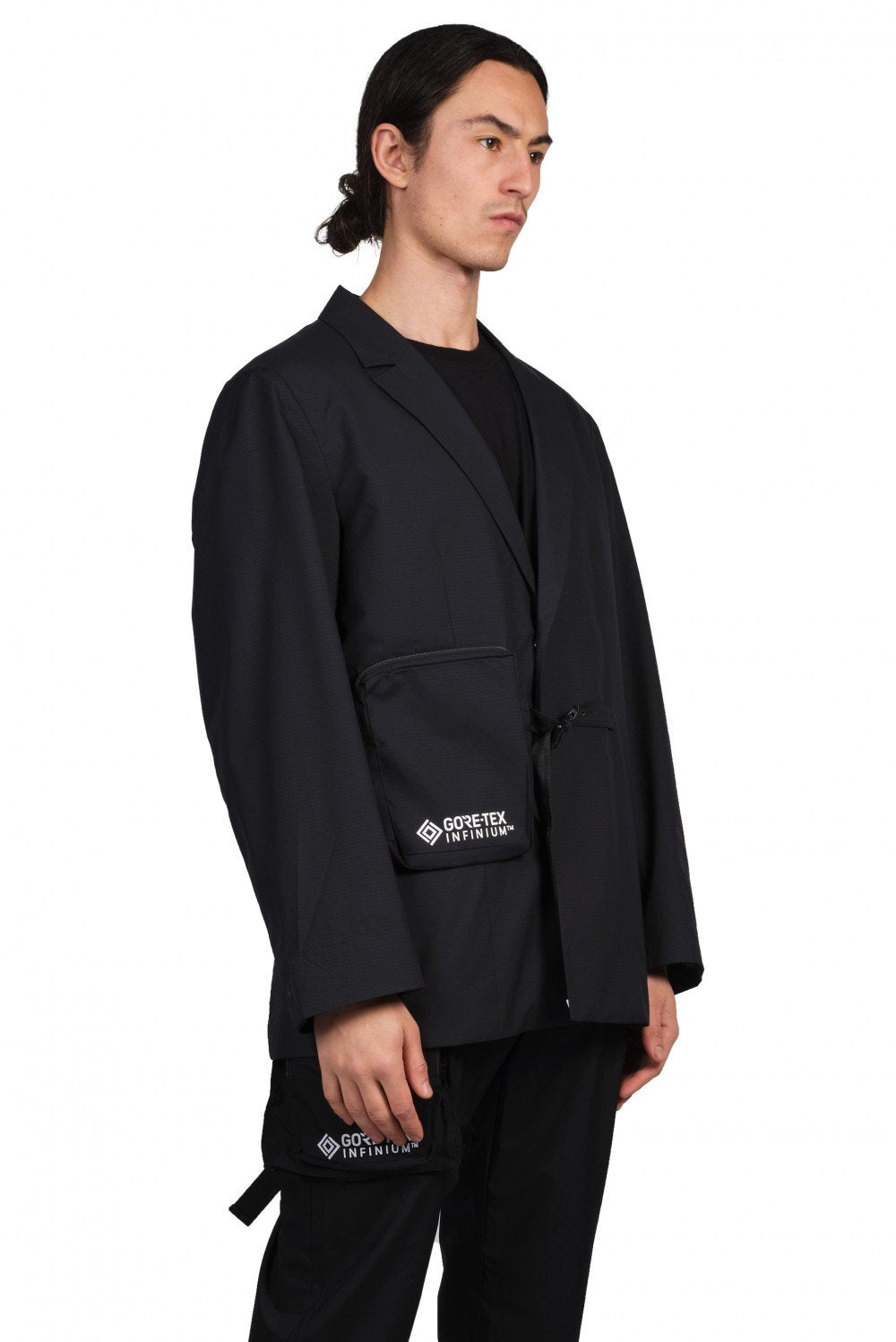 Notched lapel. Gore-Tex fabric throughout. Large zip pocket on front. Pop button and clip closure. Tonal stitching