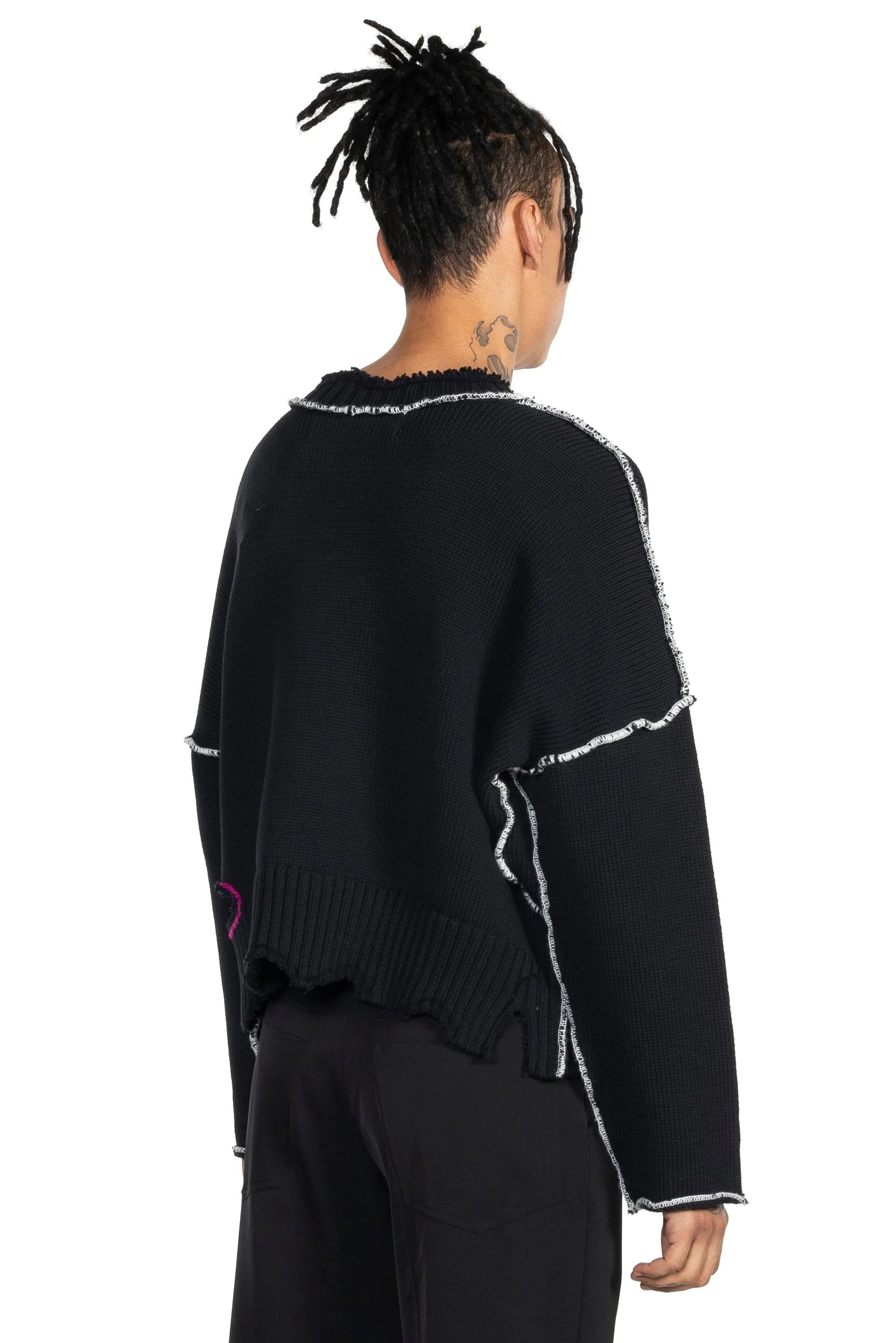 V-neck cotton jumper with ripped and cut out hand made details. External coloured seams and floating threads. Regular fit.