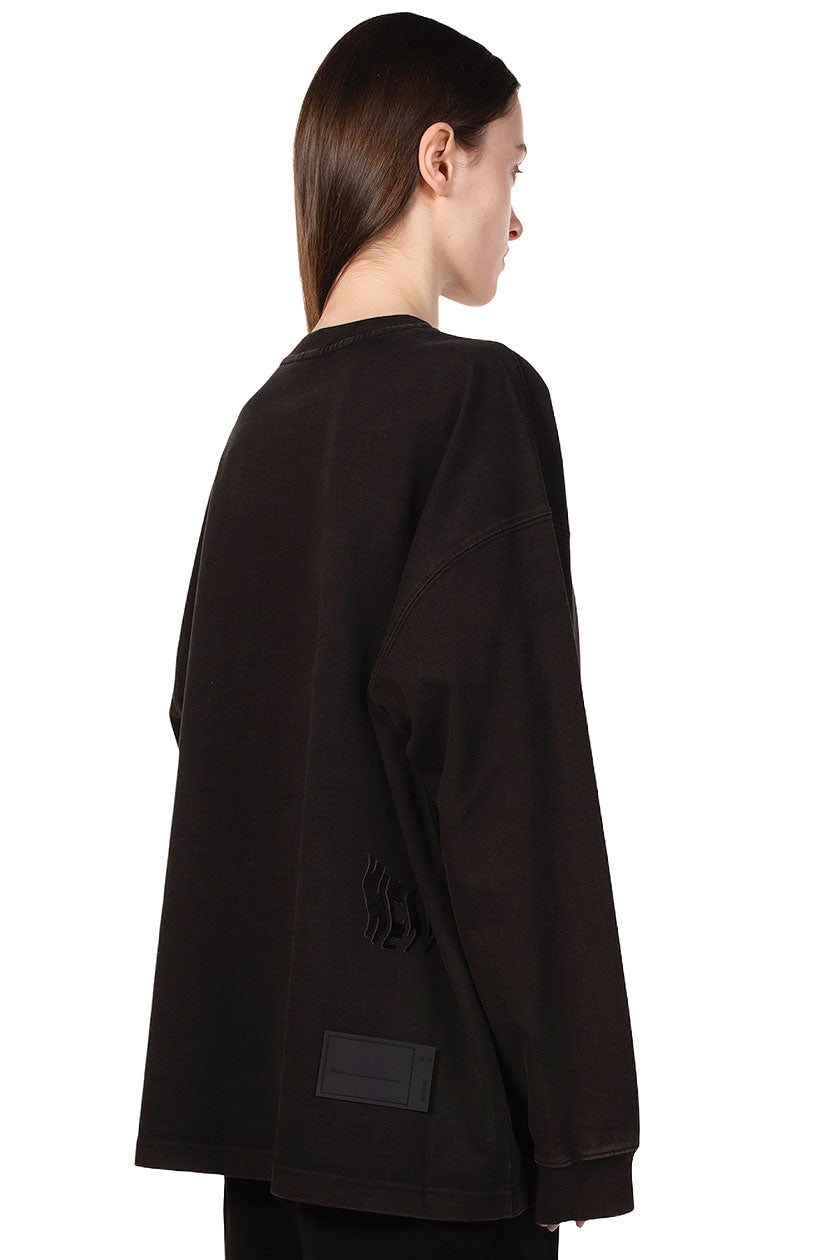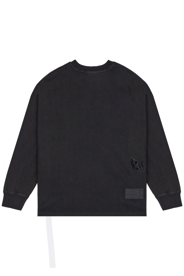 Long sleeve cotton jersey T-shirt in black. Rib knit crewneck collar. Multicolour graphic printed at front featuring tonal flocked logo. Tonal rubberised logo and flocked logo at back.